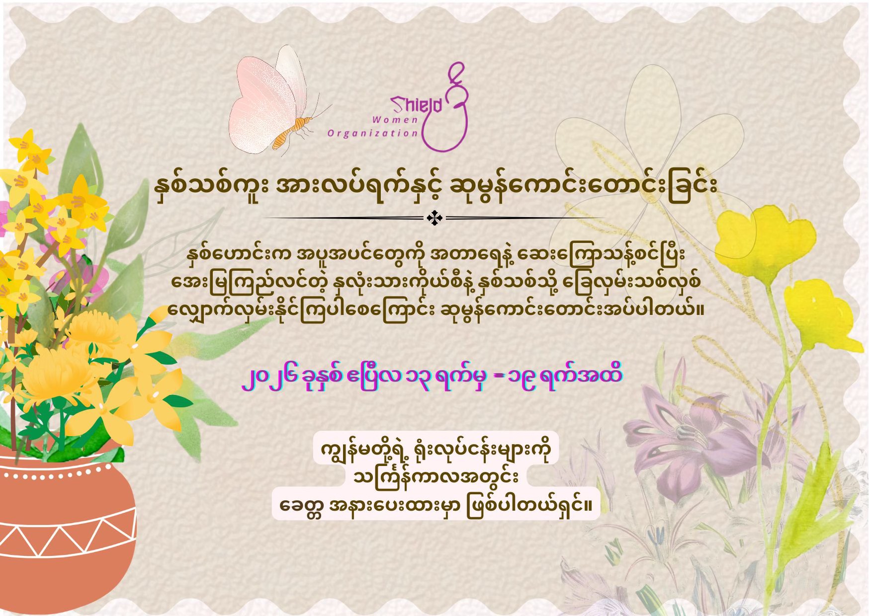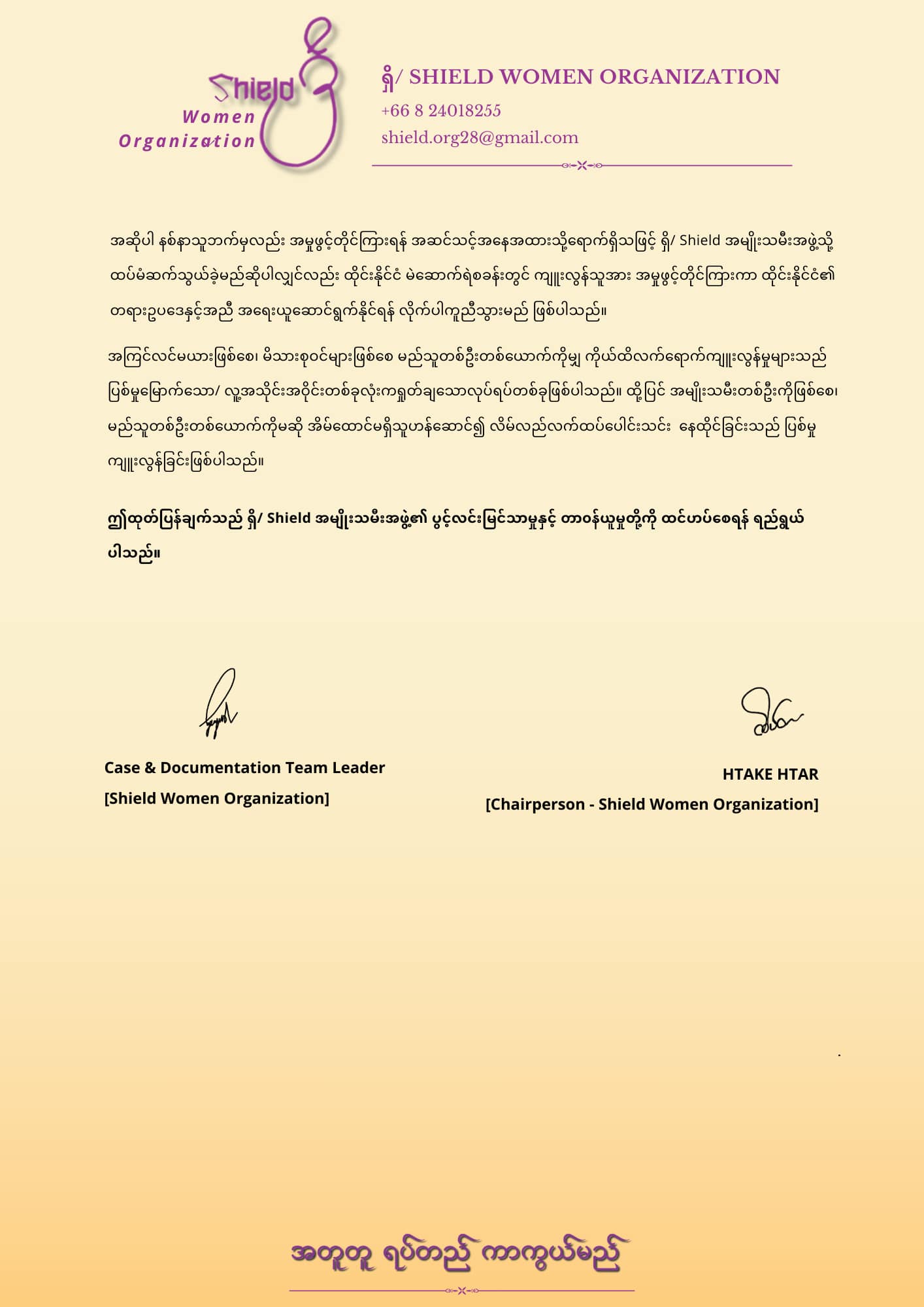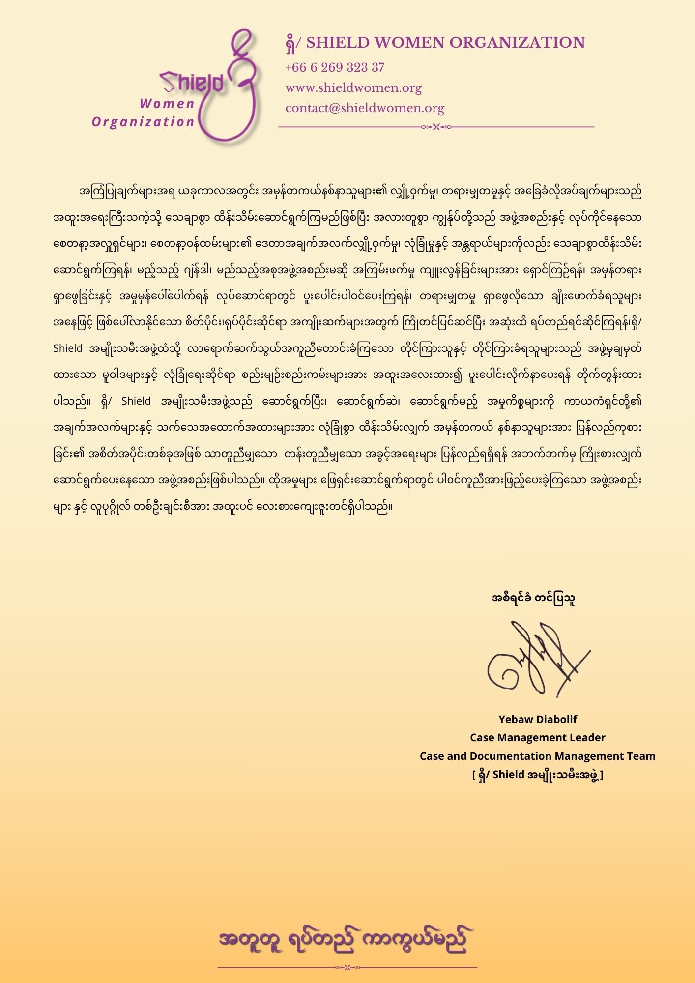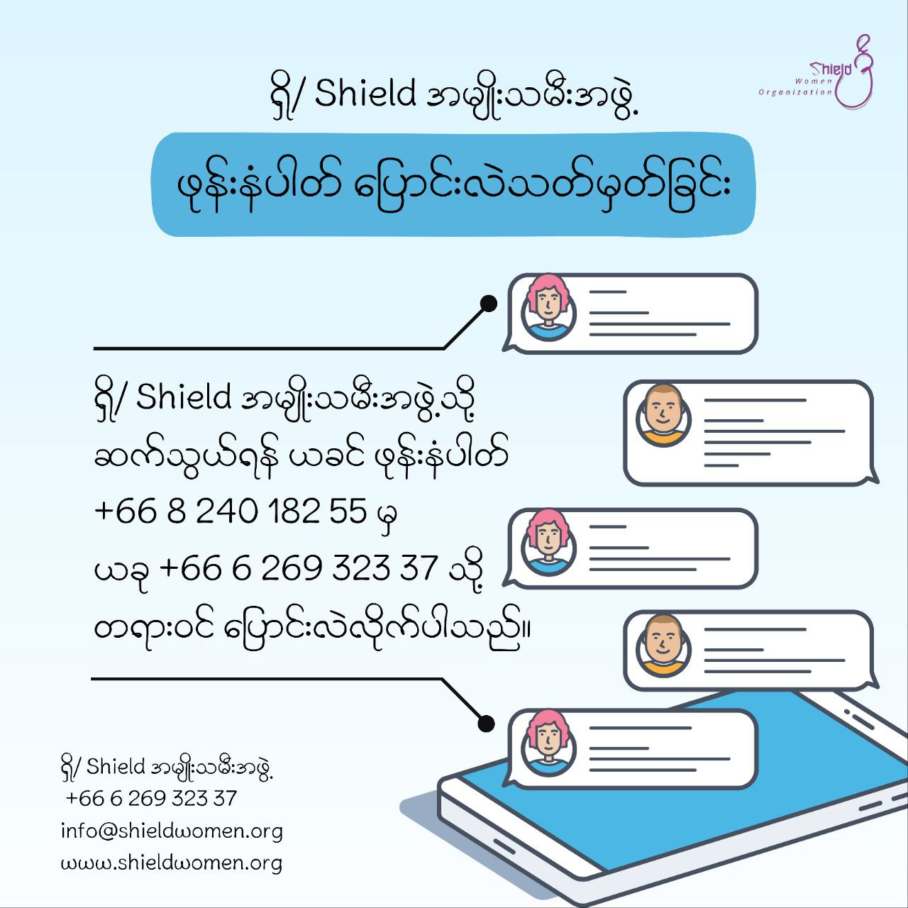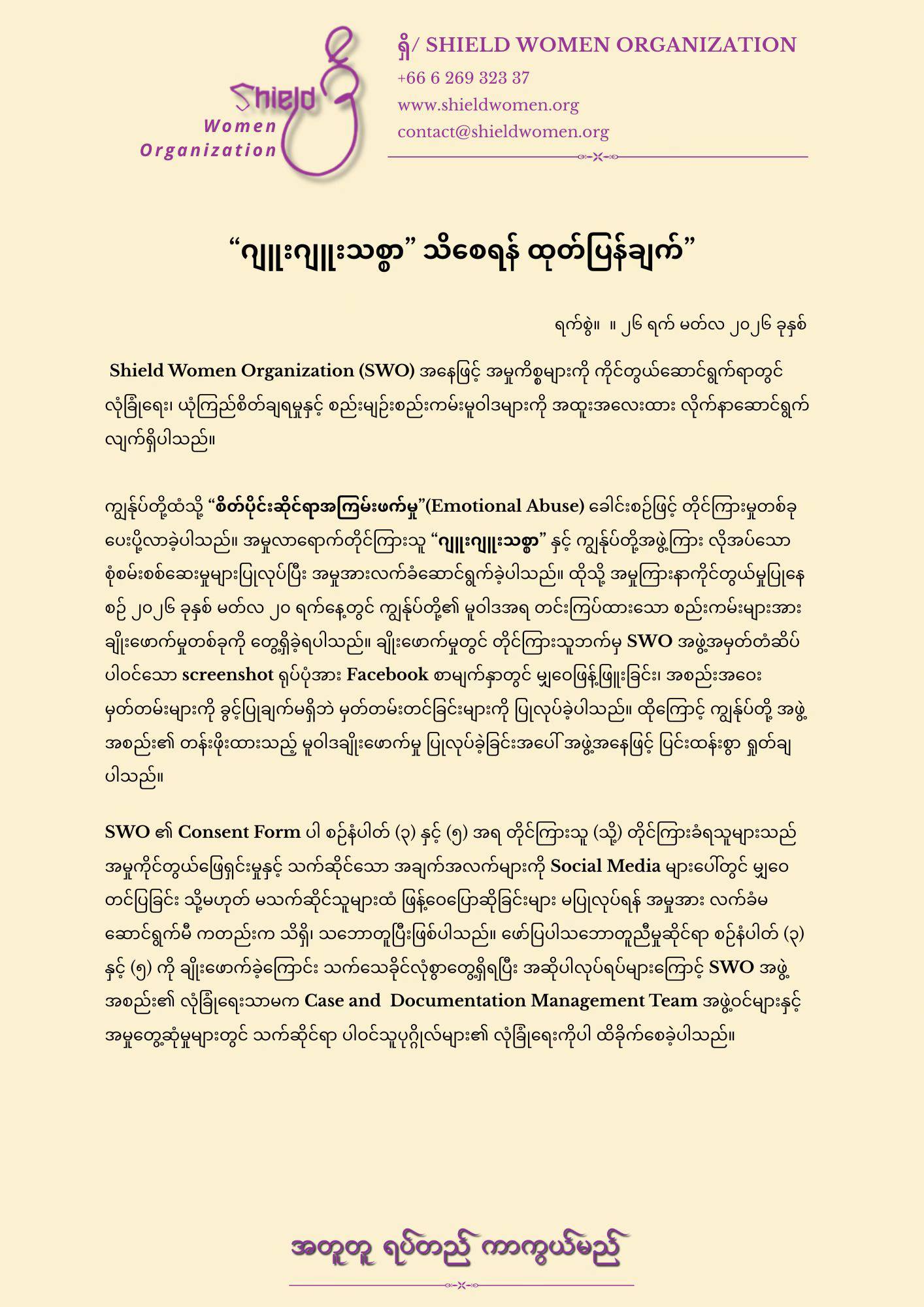 ဆက်သွယ်ရန်ကျွန်ုပ်တို့နှင့်အတူ အမျိုးသမီးထု ဖွံ့ဖြိုးတိုးတက်ရေးအတွက် လက်တွဲဆောင်ရွက်နိုင်ပါသည်။