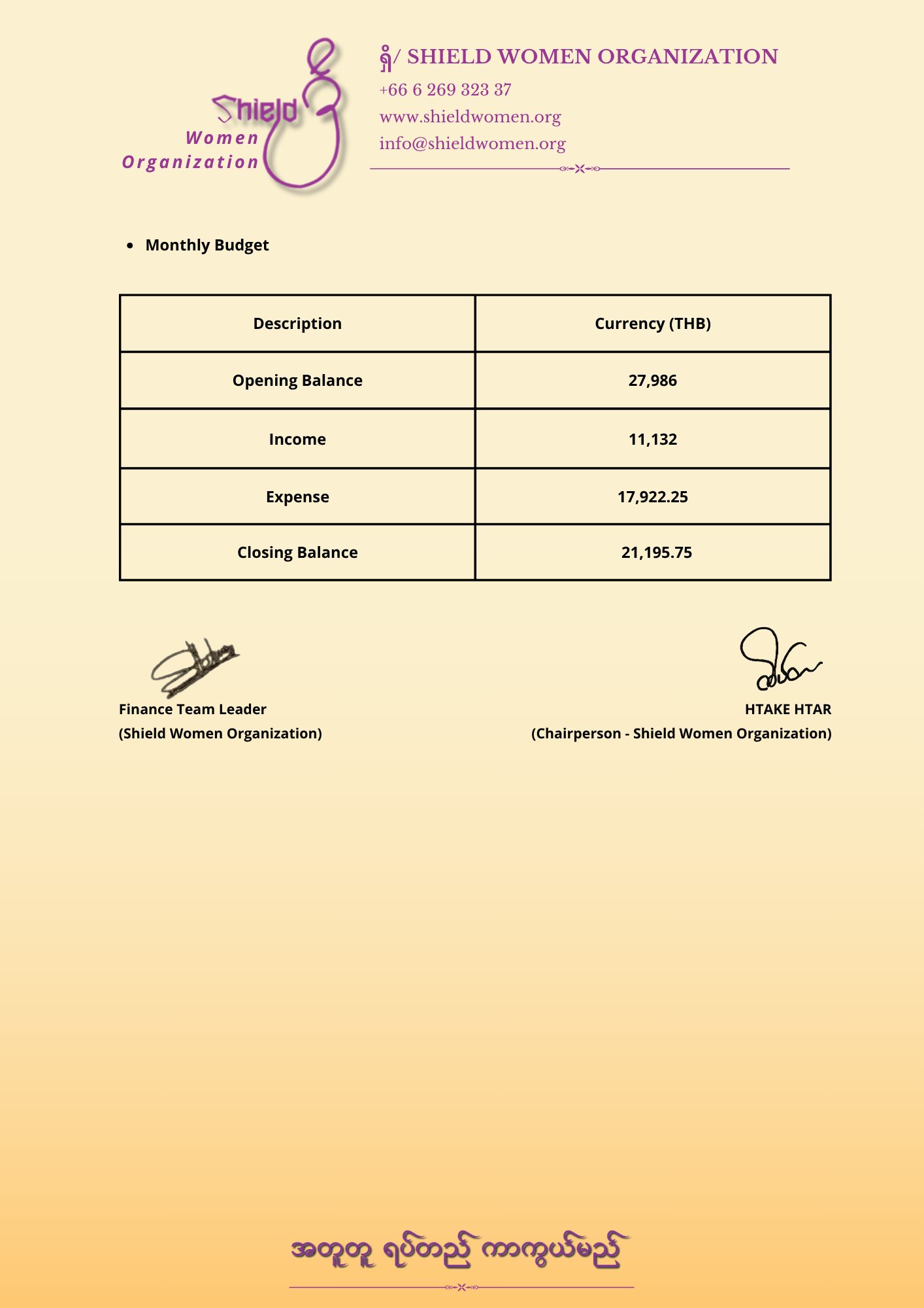 ရှိ/ Shield အမျိုးသမီးအဖွဲ့ငွေစာရင်းရှင်းတမ်းရက်စွဲ : ၀၅ ဩဂုတ်လ ၂၀၂၅။ရှိ/ အမျိုးသမီးအဖွဲ့ ၏ ၂၀၂၅ ခုနှစ်၊ ဇူလှိုင်လ တစ်လတာ ဘဏ္ဍာရေးရှင်းတမ်းနှင့် ပံ့ပိုးသူများစာရင်းတို့အား ဖော်ပြအပ်ပါသည်။၁။ ရည်ရွယ်ချက်ရှိ/ Shield အမျိုးသမီးအဖွဲ့အနေဖြင့် လူမှုအကျိုးပြုလုပ်ငန်းများကို ဆောင်ရွက်ရာတွင် ပွင့်လင်းမြင်သာမှုရှိစေရန်အတွက် ပံ့ပိုးကူညီသူများ၊ အဖွဲ့ဝင်များနှင့် အများပြည်သူတို့အား ငွေကြေးအသုံးစရိတ်များကို ရှင်းလင်းစွာ သိရှိနိုင်စေရန် ဤငွေစာရင်းရှင်းတမ်းကို ထုတ်ပြန်လိုက်ပါသည်။၂။ ငွေစာရင်းအကျဉ်းOperating Balance = 27,986 THBJuly 2025 ရရှိငွေ - MMK 50,000*0.0071rate = 357 THBTHB 10,775 = 10,775 THB __________________ရရှိငွေစုစုပေါင်း = 11,132 THB Jun. 2025 သုံးစွဲထားပြီး ငွေ - = 17,720.25 THB28000 MMK *0.0072rate = 202 THB __________________ = 17,922.25 THB___________________________________________Finance Summary DescriptionAmount (THB) Operating Balance 27,986 Income 11,132expenses 17,922.25Total Balance 21,195.75၃။ ဝင်ငွေအသေးစိတ် • အလှူငွေများ : 50,000 MMK, 10,775 THB၄။ အသုံးစရိတ်အသေးစိတ်5,000 THB (Emergency for Case-48) 1,100 THB (Emergency Transportation for Case-48) 100 THB (For Case-0021 ) 11620.25 THB( Shield’s Office Opening Expense) 202 THB (အဖွဲ့အတွင်း လိုအပ်သော Technical Support အသုံးစရိတ်ဖြစ်ပါသည် ) ______________***__________၅။ မှတ်ချက်များ(က) လစဉ် (၅)ရက်နေ့တိုင်းတွင် ရှိ/ Shield အမျိုးသမီးအဖွဲ့၏ တစ်လတာ ငွေကြေးရှင်းတမ်းနှင့် ပံ့ပိုးသူများစာရင်းကို ထုတ်ပြန်ကြေညာမည်ဖြစ်ပါသည်။(ခ) လက်ရှိတွင် ရှိ/ Shield အမျိုးသမီးအဖွဲ့အနေဖြင့် လုပ်ငန်းဆောင်ရွက်ရန် အသုံးစရိတ်များကို ကူညီအားဖြည့်ပေးသော တစ်သီးပုဂ္ဂလ ပြည်သူနှင့် အဖွဲ့ဝင်များထံမှရရှိသော ငွေကြေးများအား အဖွဲအစည်း၏ ဆောင်ရွက်နေမှုများဖြစ်သော- နစ်နာသူများကို အရေးပေါ်အခြေနေတွင် သွားရောက်ခေါ်ဆောင်ပေးခြင်း၊ ခိုလှုံနိုင်ရန် ဘေးကင်းလုံခြုံရာ နေရာများစီစဉ်ပေးခြင်း- သက်ဆိုင်ရာ နယ်မြေအာဏာပိုင်များထံသို့ သွားရောက်တွေ့ဆုံ တိုင်ကြားနိုင်ရန် ကူညီပေးခြင်း တိုင်တန်းမှု၊ တရားစွဲဆိုမှုများလိုအပ်လာပါက ဥပဒေရေးရာ အကြံပြုပံ့ပိုးပေးခြင်း- စိတ်ပိုင်းဆိုင်ရာ ထိရှနာကျင်မှုများ ပြန်လည်သက်သာလာနိုင်စေရန် ကူညီပေးခြင်း- ကိုယ်တိုင်ပြန်လည်ရပ်တည် လာနိုင်စေရန် ပံ့ပိုးမှုများ လမ်းညွှန်မှုများပေးခြင်း စသည့်ဆောင်ရွက်မှုလုပ်ငန်းစဉ်များတွင် သုံးစွဲပါသည်။(ဂ) ရှိ/ Shield အမျိုးသမီးအဖွဲ့ Members များအနေဖြင့်လည်း အဖွဲ့အစည်း၏ ဘဏ္ဍာရေးမှတ်တမ်းများကို Finance Team ထံသို့ အချိန်မရွေး တောင်းယူကြည့်ရှုနိုင်ပါသည်။ • ရှိ/ Shield အမျိုးသမီးအဖွဲ့သည် အကျိုးအမြတ်မယူသော သီးခြားရပ်တည်သည့် အဖွဲ့ဖြစ်ပြီး လုပ်ငန်းဆောင်ရွက်မှုများအတွက် အဖွဲ့ဝင်များနှင့် သီးခြားလွတ်လပ်သော ပြည်သူများ၏ ပံ့ပိုးမှုဖြင့်သာ ဆောင်ရွက်နေသော အဖွဲ့ဖြစ်ပါသည်။ဆက်သွယ်ရန်ရှိ/Shield အမျိုးသမီးအဖွဲ