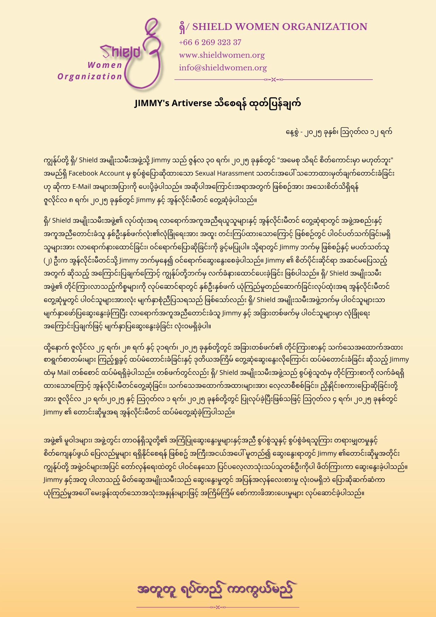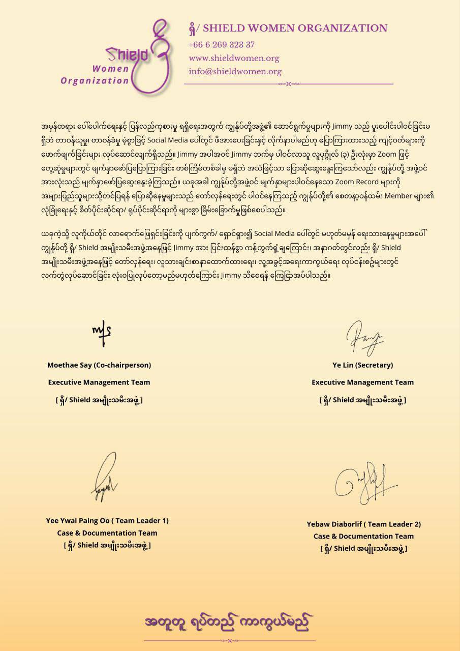 JIMMY's Artiverse သိစေရန် ထုတ်ပြန်ချက် JIMMY’s Artiverse Facebook Account မှနေ၍ ဩဂုတ်လ ၇ ရက်၊ ၂၀၂၅ ခုနှစ်တွင် ကျွန်ုပ်တို့ဘက်မှ တရား၀င်သဘောထားမှတ်ချက်မဟုတ်သော ဆွေးနွေးမှုတွင် ပြောဆိုဆွေးနွေးခဲ့သည့် စကားရပ်အပိုင်းအစတစ်ခုကို ရေးသားခဲ့ပြီး တိုင်ကြားမှုနှင့် ပတ်သက်၍ လူကိုယ်တိုင်လာရောက် ရှင်းလင်းပြောကြားရန် ရှောင်လွှဲခြင်းအား ဖုံးကွယ်ရန် ရည်ရွယ်ချက်ရှိရှိ လုပ်ဆောင်ခဲ့သည်။ Jimmy ဘက်မှ အဆိုပါအမှုကို တိုင်ကြားထားသော အဖွဲ့အစည်းများစွာထဲတွင်မှ တုန့်ပြန်ပြောဆို ဆက်သွယ်ခဲ့သည့် တစ်ဖွဲ့တည်းသော ကျွန်ုပ်တို့အဖွဲ့အား အများပြည်သူများ အထင်အမြင်လွဲမှားစေရန် ရေးသား စော်ကားမှုကို ပြုလုပ်ခဲ့သည်။အမှန်တရား ပေါ်ပေါက်ရေးနှင့် ပြန်လည်ကုစားမှု ရရှိရေးအတွက် ကျွန်ုပ်တို့အဖွဲ့၏ ဆောင်ရွက်မှုများကို Jimmy သည် ပူးပေါင်းပါဝင်ခြင်းမရှိဘဲ တာဝန်ယူမှု တာဝန်ခံမှုမဲ့စွာဖြင့် Social Media ပေါ်တွင် ဖိအားပေးခြင်းနှင့် လိုက်နာပါမည်ဟု ပြောကြားထားသည့် ကျင့်ဝတ်များကို ဖောက်ဖျက်ခြင်းများ လုပ်ဆောင်လျက်ရှိသည်။ ယခုကဲ့သို့ လူကိုယ်တိုင် လာရောက်ဖြေရှင်းခြင်းကို ပျက်ကွက်/ ရှောင်ရှား၍ Social Media ပေါ်တွင် မဟုတ်မမှန် ရေးသားနေမှုများအပေါ် ကျွန်ုပ်တို့ ရှိ/ Shield အမျိုးသမီးအဖွဲ့အနေဖြင့် Jimmy အား ပြင်းထန်စွာ ကန့်ကွက်ရှုံ့ချကြောင်း၊ အနာဂတ်တွင်လည်း ရှိ/ Shield အမျိုးသမီးအဖွဲ့အနေဖြင့် တော်လှန်ရေး၊ လူသားချင်းစာနာထောက်ထားရေး၊ လူ့အခွင့်အရေးကာကွယ်ရေး လုပ်ငန်းစဥ်များတွင် လက်တွဲလုပ်ဆောင်ခြင်း လုံး၀ပြုလုပ်တော့မည်မဟုတ်ကြောင်း Jimmy သိစေရန် ကြေငြာအပ်ပါသည်။ရှိ/ Shield Women OrganizationContact us :Hotline Number : +66 6 269 32337Website : www.shieldwomen.orgE-Mail : info@shieldwomen.org#အတူတူရပ်တည်ကာကွယ်မည် #shieldwomenorganization