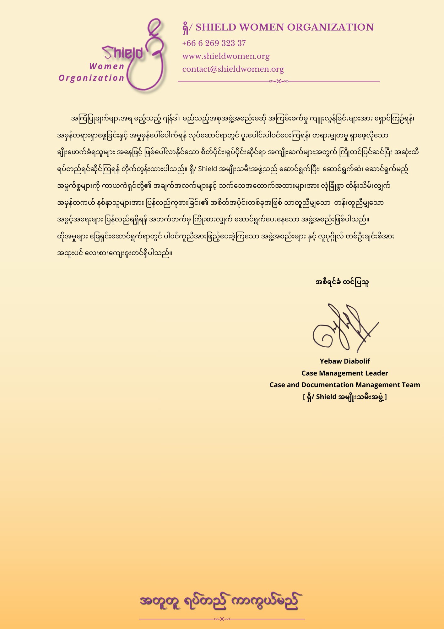 ရှိ/ Shield အမျိုးသမီးအဖွဲ့ အစီရင်ခံစာရှိ/ Shield အမျိုးသမီးအဖွဲ့ Case & Documentation Management Team ၏ ဒီဇင်ဘာလ တစ်လတာအတွင်း စုံစမ်းဖြေရှင်းခဲ့သောအမှုအစီရင်ခံတင်ပြခြင်း၁။ ၂၀၂၅ခုနှစ် ဒီဇင်ဘာလ အတွက် အနှစ်ချုပ်အသစ်တိုင်ကြားသောအမှု - ၃ မှု ဆောင်ရွက်ပြီးစီးသောအမှု - ၂ မှုလက်ရှိဆောင်ရွက်နေဆဲအမှု - ၁၆ မှု အခြားမိတ်ဖက်အဖွဲ့အစည်းအား လွှဲပြောင်းခဲ့သောအမှု - မရှိမှတ်တမ်းအဖြစ်သာထားရှိသည့်အမှု/တိုင်ကြားသူဘက်မှ ရုတ်သိမ်းသွားသည့်အမှု- ၁ မှု တိုင်ကြားလာသည်ကိုအကြောင်းပြန်ရန် ကျန်ရှိသောအမှုများ - မရှိအဖွဲ့၏ စံနှုန်းနှင့် မကိုက်ညီ၍ ဆောင်ရွက်ခြင်းမပြုသောအမှု - မရှိတိုင်ကြားသူနှင့် ဆယ်သွယ်၍ မရသောအမှု - မရှိရပ်နားထားသောအမှု - မရှိ________________________________________၂။ ၂၀၂၅ခုနှစ် ဇန်နဝါရီလမှစ၍ အနှစ်ချုပ်စုစုပေါင်း တိုင်ကြားလာသောအမှု - ၇၄ မှု ဆောင်ရွက်ပြီးစီးသောအမှု - ၂၃ မှု လက်ရှိဆောင်ရွက်နေဆဲအမှု - ၁၈ မှု အခြားမိတ်ဖက်အဖွဲ့အစည်းအား လွှဲပြောင်းခဲ့သောအမှု - ၄ မှု မှတ်တမ်းအဖြစ်သာထားရှိသည့်အမှု/တိုင်ကြားသူဘက်မှ ရုတ်သိမ်းသွားသည့်အမှု - ၁၄ မှု အဖွဲ့၏ စံနှုန်းနှင့် မကိုက်ညီ၍ ဆောင်ရွက်ခြင်းမပြုသောအမှု - ၆ မှုတိုင်ကြားသူနှင့် ဆယ်သွယ်၍ မရသောအမှု - ၉ မှု တိုင်ကြားလာသည်ကိုအကြောင်းပြန်ရန် ကျန်ရှိသောအမှုများ - မရှိရပ်နားထားသောအမှု - မရှိ________________________________________၃။ အမှုများကို ခွဲခြမ်းစိတ်ဖြာခြင်းShield Women Organization အနေဖြင့် ၂၀၂၅ ခုနှစ် ဖေဖော်ဝါရီလမှစ၍ ယနေ့အထိ အမှုစုစုပေါင်း ၇၁ ခု ကို လက်ခံကိုင်တွယ် ကူညီဖြေရှင်းပေးခဲ့ရာတွင် အောက်ပါအတိုင်း သတ်မှတ်ခွဲခြား ထုတ်ဖော်နိုင်ခဲ့ပါသည်။အိမ်တွင်းအကြမ်းဖက်မှု ( Domestic Violence ) -၂၀မှု အိမ်တွင်းအကြမ်းဖက်မှုအောက်၌ ထပ်မံစီစစ်ရာတွင် ရုပ်ပိုင်းဆိုင်ရာ အကြမ်းဖက်မှု - ၁၈မှုစိတ်ပိုင်းဆိုင်ရာ အကြမ်းဖက်မှု - ၂ မှုအွန်လိုင်းနည်းပညာဆိုင်ရာ အကြမ်းဖက်မှု - မရှိလိင်ပိုင်းဆိုင်ရာအကြမ်းဖက်မှု (Sexual Violence) - ၃၀ မှုလိင်ပိုင်းဆိုင်ရာအကြမ်းဖက်မှုအောက်၌ ထပ်မံစီစစ်ရာတွင် ရုပ်ပိုင်းဆိုင်ရာ အကြမ်းဖက်မှု - ၁၇မှု စိတ်ပိုင်းဆိုင်ရာ အကြမ်းဖက်မှု - ၂ မှုအွန်လိုင်းနည်းပညာဆိုင်ရာ အကြမ်းဖက်မှု - ၁၁ မှုဂျဲန်ဒါအခြေပြုအကြမ်းဖက်မှု (Gender-based Violence) - ၁၇ မှုဂျဲန်ဒါအခြေပြုအကြမ်းဖက်မှုအောက်၌ ထပ်မံစီစစ်ရာတွင် ရုပ်ပိုင်းဆိုင်ရာ အကြမ်းဖက်မှု - ၄မှု စိတ်ပိုင်းဆိုင်ရာ အကြမ်းဖက်မှု - ၆ အွန်လိုင်းနည်းပညာဆိုင်ရာ အကြမ်းဖက်မှု - ၇ မှု လူမှုရေးဖောက်ပြန်မှု (Social deviance) - ၁မှုအဖွဲ့၏ မူဝါဒများနှင့် မကိုက်ညီသဖြင့် လက်ခံဆောင်ရွက်ခြင်း မပြုသော အမှု - ၆ မှု ________________________________________၄။ဒီဇင်ဘာလတစ်လတာအတွင်း ဆောင်ရွက်ပြီးစီးသောအမှုအကျဉ်းချုပ် - ၁ မှု***(၁) အမှုနံပါတ် - Case-0060*** အမှုခေါင်းစ