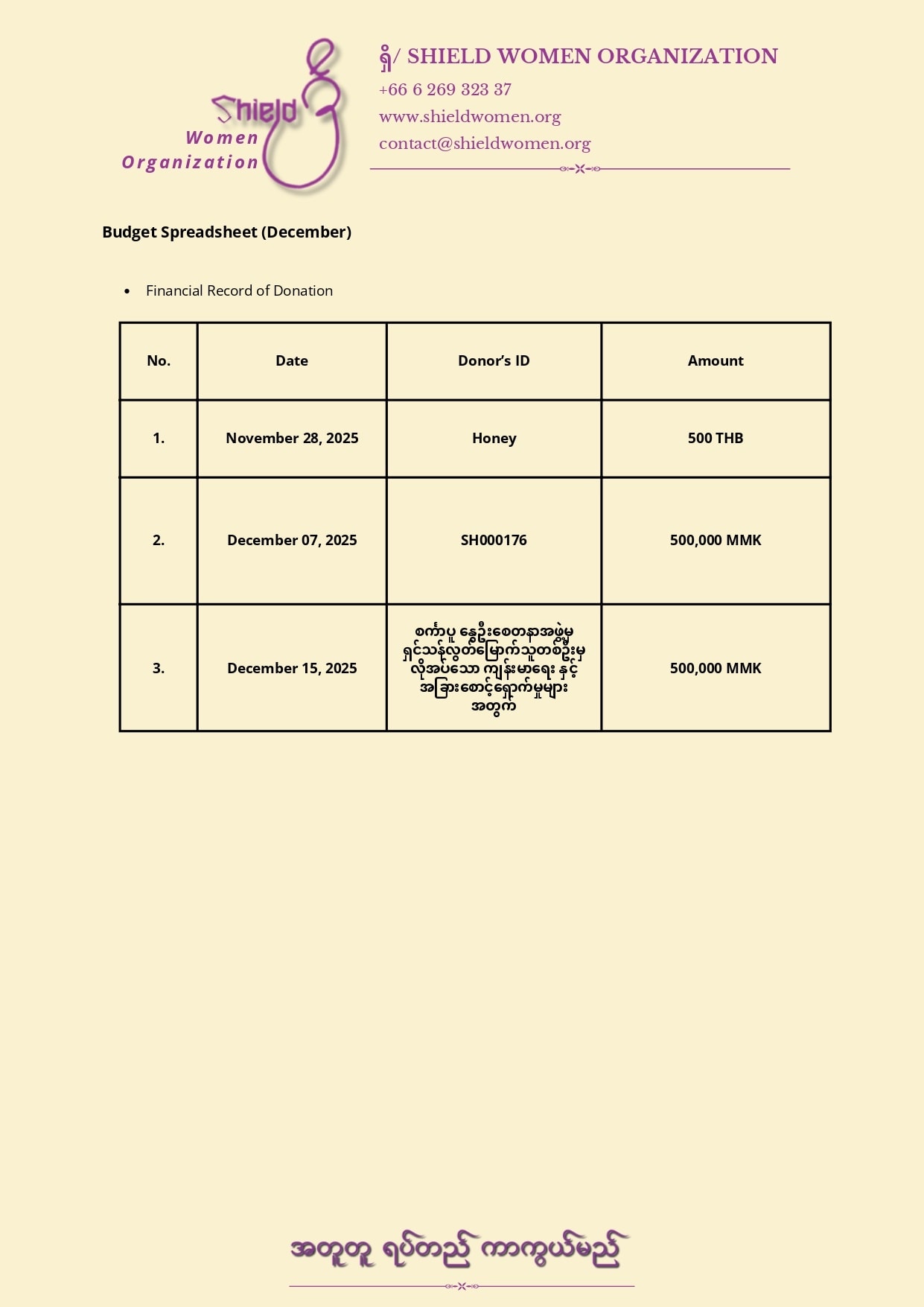 ရှိ/ Shield အမျိုးသမီးအဖွဲ့ငွေစာရင်းရှင်းတမ်းရက်စွဲ : ၂၆ ဇန်နဝါရီလ ၂၀၂၅။ရှိ/ Shield အမျိုးသမီးအဖွဲ့ ၏ ၂၀၂၅ ခုနှစ်၊ ဒီဇင်ဘာလ တစ်လတာ ဘဏ္ဍာရေးရှင်းတမ်းနှင့် ပံ့ပိုးသူများစာရင်းတို့အား ဖော်ပြအပ်ပါသည်။၁။ ရည်ရွယ်ချက်ရှိ/ Shield အမျိုးသမီးအဖွဲ့အနေဖြင့် လူမှုအကျိုးပြုလုပ်ငန်းများကို ဆောင်ရွက်ရာတွင် ပွင့်လင်းမြင်သာမှုရှိစေရန်အတွက် ပံ့ပိုးကူညီသူများ၊ အဖွဲ့ဝင်များနှင့် အများပြည်သူတို့အား ငွေကြေးအသုံးစရိတ်များကို ရှင်းလင်းစွာ သိရှိနိုင်စေရန် ဤငွေစာရင်းရှင်းတမ်းကို ထုတ်ပြန်လိုက်ပါသည်။၂။ ငွေစာရင်းအကျဉ်းOperating Balance = 10,533.75 THBDecember 2025 ရရှိငွေ စုစုပေါင်း = 8,040.00 THBDecember 2025 သုံးစွဲထားပြီး ငွေ = (- 11,798 THB) __________________ Closing Balance = 6,775.75 THBFinance Summary DescriptionAmount (THB)Operating Balance 10,533.75 THBIncome 8,040 THBExpenses 11,798 THBTotal Balance 6,775.75 THB၃။ ဝင်ငွေအသေးစိတ် အလှူငွေများ : 1,000,000MMK,500 THB ၄။ အသုံးစရိတ်အသေးစိတ် 11,798 THB (Shield Office Expenses) __________***__________၅။ မှတ်ချက်များ(က) လစဉ် (၅)ရက်နေ့တိုင်းတွင် ရှိ/ Shield အမျိုးသမီးအဖွဲ့၏ တစ်လတာ ငွေကြေးရှင်းတမ်းနှင့် ပံ့ပိုးသူများစာရင်းကို ထုတ်ပြန်ကြေညာမည်ဖြစ်ပါသည်။(ခ) လက်ရှိတွင် ရှိ/ Shield အမျိုးသမီးအဖွဲ့အနေဖြင့် လုပ်ငန်းဆောင်ရွက်ရန် အသုံးစရိတ်များကို ကူညီအားဖြည့်ပေးသော တစ်သီးပုဂ္ဂလ ပြည်သူနှင့် အဖွဲ့ဝင်များထံမှရရှိသော ငွေကြေးများအား အဖွဲအစည်း၏ ဆောင်ရွက်နေမှုများဖြစ်သော- နစ်နာသူများကို အရေးပေါ်အခြေနေတွင် သွားရောက်ခေါ်ဆောင်ပေးခြင်း၊ ခိုလှုံနိုင်ရန် ဘေးကင်းလုံခြုံရာ နေရာများစီစဉ်ပေးခြင်း။- သက်ဆိုင်ရာ နယ်မြေအာဏာပိုင်များထံသို့ သွားရောက်တွေ့ဆုံ တိုင်ကြားနိုင်ရန် ကူညီပေးခြင်း တိုင်တန်းမှု၊ တရားစွဲဆိုမှုများလိုအပ်လာပါက ဥပဒေရေးရာ အကြံပြုပံ့ပိုးပေးခြင်း။- စိတ်ပိုင်းဆိုင်ရာ ထိရှနာကျင်မှုများ ပြန်လည်သက်သာလာနိုင်စေရန် ကူညီပေးခြင်း။- ကိုယ်တိုင်ပြန်လည်ရပ်တည် လာနိုင်စေရန် ပံ့ပိုးမှုများ လမ်းညွှန်မှုများပေးခြင်း။စသည့်ဆောင်ရွက်မှုလုပ်ငန်းစဉ်များတွင် သုံးစွဲပါသည်။(ဂ) Shield အမျိုးသမီးအဖွဲ့ Members များအနေဖြင့်လည်း အဖွဲ့အစည်း၏ ဘဏ္ဍာရေးမှတ်တမ်းများကို Finance Team ထံသို့ အချိန်မရွေး တောင်းယူကြည့်ရှုနိုင်ပါသည်။• ရှိ/Shield အမျိုးသမီးအဖွဲ့သည် အကျိုးအမြတ်မယူသော သီးခြားရပ်တည်သည့် အဖွဲ့ဖြစ်ပြီး လုပ်ငန်းဆောင်ရွက်မှုများအတွက် အဖွဲ့ဝင်များနှင့် သီးခြားလွတ်လပ်သော ပြည်သူများ၏ ပံ့ပိုးမှုဖြင့်သာ ဆောင်ရွက်နေသော အဖွဲ့ဖြစ်ပါသည်။ဆက်သွယ်ရန်ရှိ/ Shield အမျိုးသမီးအဖွဲ့+66 6 269 323 37info@shieldwomen.orgကျေးဇူးတင်လျှက်(Finance Team )finance@shieldwomen.orgရှိ/ Shield အမျိုးသမီးအဖွဲ့Monthly Budget (December )Description Currency (THB)Opening Balance10,533.75Income8,040.00Expense11,798.00Closing Balance6,775.75Finance TeamShield Women Organization