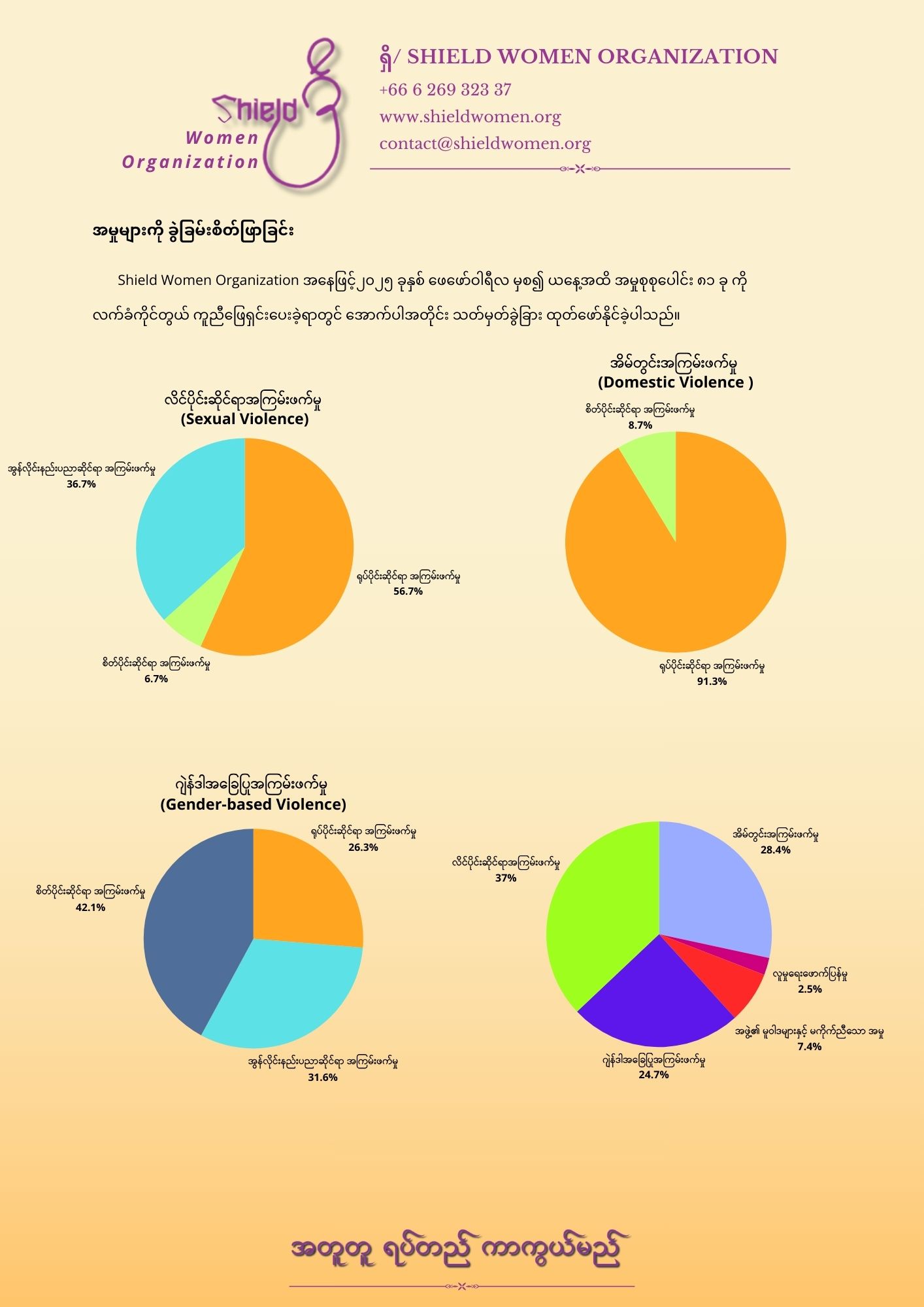 ရှိ/ Shield အမျိုးသမီးအဖွဲ့ အစီရင်ခံစာရှိ/ Shield အမျိုးသမီးအဖွဲ့ Case & Documentation Management Team ၏ ဖေဖော်ဝါရီလ တစ်လတာအတွင်း စုံစမ်းဖြေရှင်းခဲ့သောအမှုအစီရင်ခံတင်ပြခြင်း၁။ ၂၀၂၆ခုနှစ် ဖေဖော်ဝါရီလ အတွက် အနှစ်ချုပ်အသစ်တိုင်ကြားသောအမှု - ၄ မှု (78, 79, 80, 81))ဆောင်ရွက်ပြီးစီးသောအမှု - ၂ မှု ( 75, 78)လက်ရှိဆောင်ရွက်နေဆဲအမှု - ၁၄ မှု (21,34,39,49,55,63, 67, 69,71,74, 77,79, 80, 81)အခြားမိတ်ဖက်အဖွဲ့အစည်းအား လွှဲပြောင်းခဲ့သောအမှု - မရှိမှတ်တမ်းအဖြစ်သာထားရှိသည့်အမှု/တိုင်ကြားသူဘက်မှ ရုတ်သိမ်းသွားသည့်အမှု-မရှိ တိုင်ကြားလာသည်ကိုအကြောင်းပြန်ရန် ကျန်ရှိသောအမှုများ - မရှိအဖွဲ့၏ စံနှုန်းနှင့် မကိုက်ညီ၍ ဆောင်ရွက်ခြင်းမပြုသောအမှု - ၁ မှု (75)တိုင်ကြားသူနှင့် ဆယ်သွယ်၍ မရသောအမှု - မရှိရပ်နားထားသောအမှု - မရှိ________၂။ ၂၀၂၅ခုနှစ် ဇန်နဝါရီလမှစ၍ အနှစ်ချုပ်စုစုပေါင်း တိုင်ကြားလာသောအမှု - ၈၁ မှုဆောင်ရွက်ပြီးစီးသောအမှု - ၂၅ မှု+ ၁= ၂၆ မှု (1.5.6.9.15.16.20.22,26.29.31.32.33.35.38.40. 44.48.52.57.60,62,64, 70, 76., 78)လက်ရှိဆောင်ရွက်နေဆဲအမှု - ၁၆ မှု (7.14.21.34.39.49.55.63,67,69,71.74, 77, 79, 80, 81)အခြားမိတ်ဖက်အဖွဲ့အစည်းအား လွှဲပြောင်းခဲ့သောအမှု - ၄ မှု (10.12.53.56)မှတ်တမ်းအဖြစ်သာထားရှိသည့်အမှု/တိုင်ကြားသူဘက်မှ ရုတ်သိမ်းသွားသည့်အမှု - ၁၄+၃ = ၁၇ မှု (17.19.24.28.36,41.42.43.45.46.47.50.51.58.65, 68, 73) အဖွဲ့၏ စံနှုန်းနှင့် မကိုက်ညီ၍ ဆောင်ရွက်ခြင်းမပြုသောအမှု - ၇ +၁ = ၈ မှု (2.3.18.27.30.61, 72,75)တိုင်ကြားသူနှင့် ဆယ်သွယ်၍ မရသောအမှု - ၉+ ၁= ၁၀ မှု (4.8.11.13.23.25.37.54.59. 66)တိုင်ကြားလာသည်ကိုအကြောင်းပြန်ရန် ကျန်ရှိသောအမှုများ - မရှိရပ်နားထားသောအမှု - မရှိ________၃။ အမှုများကို ခွဲခြမ်းစိတ်ဖြာခြင်းShield Women Organization အနေဖြင့် ၂၀၂၅ ခုနှစ် ဖေဖော်ဝါရီလမှစ၍ ယနေ့အထိ အမှုစုစုပေါင်း ၈၁ ခု ကို လက်ခံကိုင်တွယ် ကူညီဖြေရှင်းပေးခဲ့ရာတွင် အောက်ပါအတိုင်း သတ်မှတ်ခွဲခြား ထုတ်ဖော်နိုင်ခဲ့ပါသည်။အိမ်တွင်းအကြမ်းဖက်မှု ( Domestic Violence ) - ၂၁ + ၂ = ၂၃မှု (78, 80)အိမ်တွင်းအကြမ်းဖက်မှုအောက်၌ ထပ်မံစီစစ်ရာတွင်ရုပ်ပိုင်းဆိုင်ရာ အကြမ်းဖက်မှု - ၁၉ + ၂ = ၂၁ မှု (78, 80)စိတ်ပိုင်းဆိုင်ရာ အကြမ်းဖက်မှု - ၂ မှုအွန်လိုင်းနည်းပညာဆိုင်ရာ အကြမ်းဖက်မှု - မရှိလိင်ပိုင်းဆိုင်ရာအကြမ်းဖက်မှု (Sexual Violence) - ၃၀ မှုလိင်ပိုင်းဆိုင်ရာအကြမ်းဖက်မှုအောက်၌ ထပ်မံစီစစ်ရာတွင်ရုပ်ပိုင်းဆိုင်ရာ အကြမ်းဖက်မှု - ၁၆ + ၁ = ၁၇ မှု (75)စိတ်ပိုင်းဆိုင်ရာ အကြမ်းဖက်မှု - ၂ မှုအွန်လိုင်းနည်းပညာဆိုင်ရာ အကြမ်းဖက်မှု - ၁၀+ ၁ = ၁၁ မှု(74)ဂျဲန်ဒါအခြေပြုအကြမ်းဖက်မှု (Gender-based Violence) - ၁၈ +၂ = ၂၀ မှု(79, 81)ဂျဲန်ဒါအခြေပြုအကြမ်းဖက်မှုအောက်၌ ထပ်မံစီစစ်ရာတွင်ရုပ်ပိုင်းဆိုင်ရာ အကြမ်းဖက်မှု - ၄ + ၁ = ၅မှု (79)စိတ်ပိုင်းဆိုင်ရာ အကြမ်းဖက်မှု - ၅+ ၁ = ၆ မှု (81)အွန်လိုင်းနည်းပညာဆိုင်ရာ အကြမ်းဖက်မှု - ၆+ ၂ = ၈ မှု လူမှုရေးဖောက်ပြန်မှု (Social deviance) - ၁ +၁ = ၂ မှုအဖွ