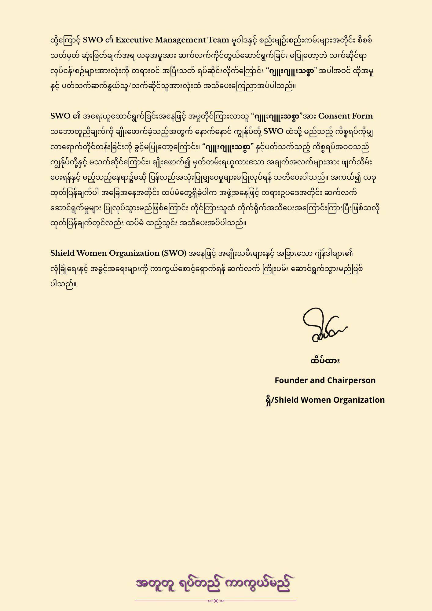“ဂျုးဂျူးသစ္စာ” သိစေရန် ထုတ်ပြန်ချက်Shield Women Organization (SWO) အနေဖြင့် အမှုကိစ္စများကို ကိုင်တွယ်ဆောင်ရွက်ရာတွင် လုံခြုံရေး၊ ယုံကြည်စိတ်ချရမှုနှင့် စည်းမျဉ်းစည်းကမ်းမူဝါဒများကို အထူးအလေးထား လိုက်နာဆောင်ရွက်လျက်ရှိပါသည်။ကျွန်ုပ်တို့ထံသို့ “စိတ်ပိုင်းဆိုင်ရာအကြမ်းဖက်မှု”(Emotional Abuse) ခေါင်းစဉ်ဖြင့် တိုင်ကြားမှုတစ်ခုပေးပို့လာခဲ့ပါသည်။ အမှုလာရောက်တိုင်ကြားသူ “ဂျူးဂျူးသစ္စာ” နှင့် ကျွန်ုပ်တို့အဖွဲ့ကြား လိုအပ်သော စုံစမ်းစစ်ဆေးမှုများပြုလုပ်ပြီး အမှုအားလက်ခံဆောင်ရွက်ခဲ့ပါသည်။ ထိုသို့ အမှုကြားနာကိုင်တွယ်မှုပြုနေစဉ် ၂၀၂၆ ခုနှစ် မတ်လ ၂၀ ရက်နေ့တွင် ကျွန်ုပ်တို့၏ မူဝါဒအရ တင်းကြပ်ထားသော စည်းကမ်းများအား ချိုးဖောက်မှုတစ်ခုကို တွေ့ရှိခဲ့ရပါသည်။ ချိုးဖောက်မှုတွင် တိုင်ကြားသူဘက်မှ SWO အဖွဲ့အမှတ်တံဆိပ်ပါဝင်သော screenshot ရုပ်ပုံအား Facebook စာမျက်နှာတွင် မျှဝေဖြန့်ဖြူးခြင်း၊ အစည်းအဝေးမှတ်တမ်းများကို ခွင့်ပြုချက်မရှိဘဲ မှတ်တမ်းတင်ခြင်းများကို ပြုလုပ်ခဲ့ပါသည်။ ထိုကြောင့် ကျွန်ုပ်တို့ အဖွဲ့အစည်း၏ တန်းဖိုးထားသည့် မူဝါဒ သဘောတူညီချက် ချိုးဖောက်မှု ပြုလုပ်ခဲ့ခြင်းအပေါ် အဖွဲ့အနေဖြင့် ပြင်းထန်းစွာ ရှုတ်ချပါသည်။SWO ၏ Consent Form ပါ စဉ်နံပါတ် (၃) နှင့် (၅) အရ တိုင်ကြားသူ (သို့) တိုင်ကြားခံရသူများသည် အမှုကိုင်တွယ်ဖြေရှင်းမှုနှင့် သက်ဆိုင်သော အချက်အလက်များကို Social Media များပေါ်တွင် မျှဝေတင်ပြခြင်း သို့မဟုတ် မသက်ဆိုင်သူများထံ ဖြန့်ဝေပြောဆိုခြင်းများ မပြုလုပ်ရန် အမှုအား လက်ခံမဆောင်ရွက်မီ ကတည်းက သိရှိ၊ သဘောတူပြီးဖြစ်ပါသည်။ ဖော်ပြပါသဘောတူညီမှုဆိုင်ရာ စဉ်နံပါတ် (၃) နှင့် (၅) ကို ချိုးဖောက်ခဲ့ကြောင်း သက်သေခိုင်လုံစွာတွေ့ရှိရပြီး အဆိုပါလုပ်ရပ်များကြောင့် SWO အဖွဲ့အစည်း၏ လုံခြုံရေးသာမက Case and Documentation Management Team အဖွဲ့ဝင်များနှင့် အမှုတွေ့ဆုံမှုများတွင် သက်ဆိုင်ရာ ပါဝင်သူပုဂ္ဂိုလ်များ၏ လုံခြုံရေးကိုပါ ထိခိုက်စေခဲ့ပါသည်။ထို့ကြောင့် SWO ၏ Executive Management Team မူဝါဒနှင့် စည်းမျဉ်းစည်းကမ်းများအတိုင်း စိစစ်သတ်မှတ် ဆုံးဖြတ်ချက်အရ ယခုအမှုအား ဆက်လက်ကိုင်တွယ်ဆောင်ရွက်ခြင်း မပြုတော့ဘဲ သက်ဆိုင်ရာ လုပ်ငန်းစဉ်များအားလုံးကို တရားဝင် အပြီးသတ် ရပ်ဆိုင်းလိုက်ကြောင်း “ဂျူးဂျူးသစ္စာ" အပါအဝင် ထိုအမှုနှင့် ပတ်သက်ဆက်နွယ်သူ/သက်ဆိုင်သူအားလုံးထံ အသိပေးကြေညာအပ်ပါသည်။SWO ၏ အရေးယူဆောင်ရွက်ခြင်းအနေဖြင့် အမှုတိုင်ကြားလာသူ “ဂျူးဂျူးသစ္စာ”အား Consent Form သဘောတူညီချက်ကို ချိုးဖောက်ခဲ့သည့်အတွက် နောက်နောင် ကျွန်ုပ်တို့ SWO ထံသို့ မည်သည့် ကိစ္စရပ်ကိုမျှ လာရောက်တိုင်တန်းခြင်းကို ခွင့်မပြုတော့ကြောင်း၊ “ဂျူးဂျူးသစ္စာ” နှင့်ပတ်သက်သ