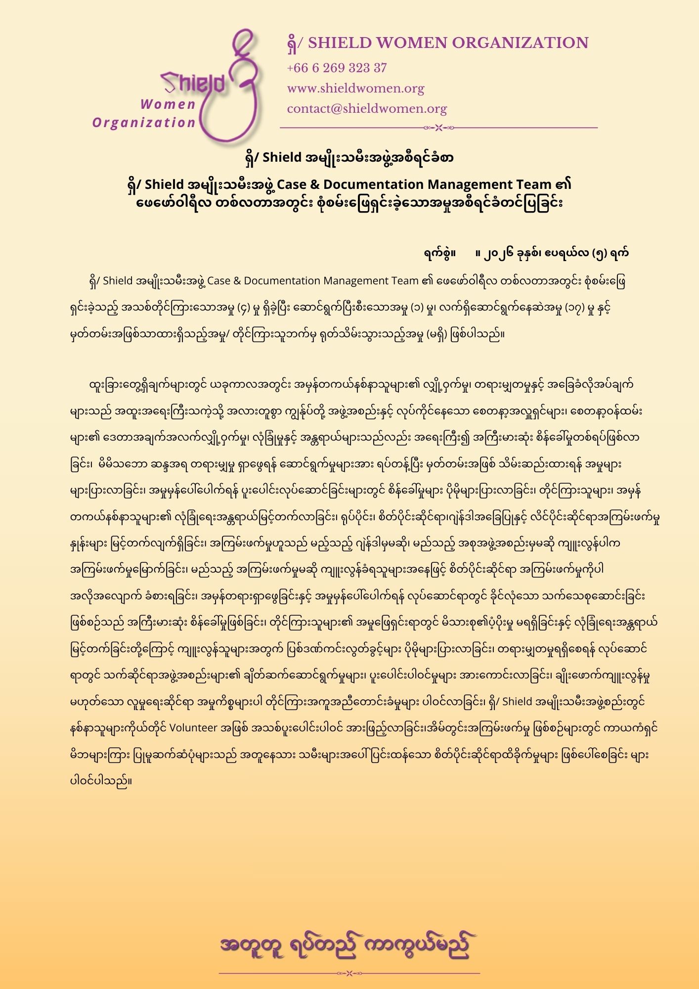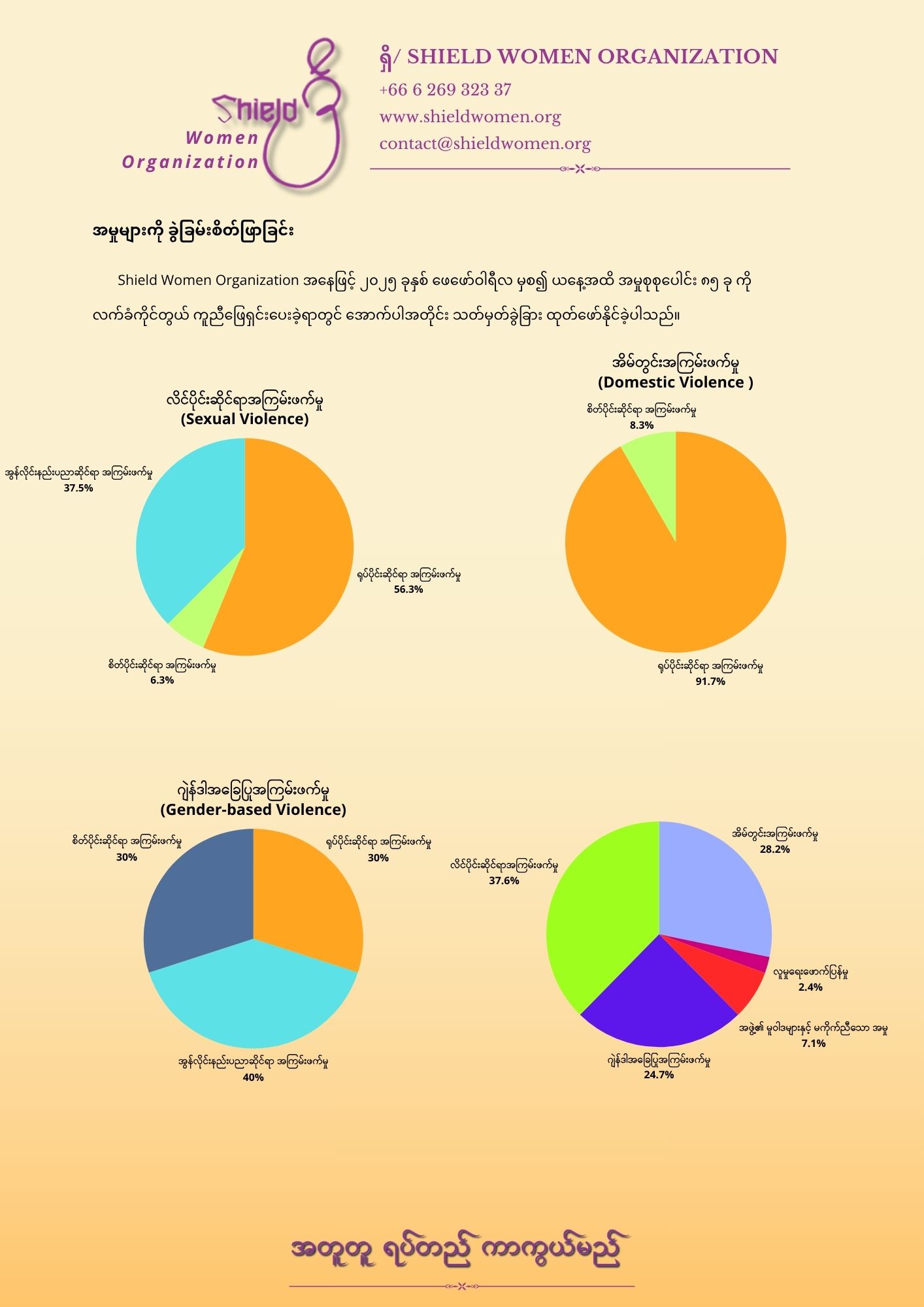 ရှိ/ Shield အမျိုးသမီးအဖွဲ့ အစီရင်ခံစာရှိ/ Shield အမျိုးသမီးအဖွဲ့ Case & Documentation Management Team ၏ မတ်လ တစ်လတာအတွင်း စုံစမ်းဖြေရှင်းခဲ့သောအမှုအစီရင်ခံတင်ပြခြင်း၁။ ၂၀၂၆ ခုနှစ် မတ်လ အတွက် အနှစ်ချုပ်အသစ်တိုင်ကြားသောအမှု - ၄ မှု ဆောင်ရွက်ပြီးစီးသောအမှု - ၁ မှု လက်ရှိဆောင်ရွက်နေဆဲအမှု - ၁၇ မှု အခြားမိတ်ဖက်အဖွဲ့အစည်းအား လွှဲပြောင်းခဲ့သောအမှု - မရှိမှတ်တမ်းအဖြစ်သာထားရှိသည့်အမှု/တိုင်ကြားသူဘက်မှ ရုတ်သိမ်းသွားသည့်အမှု-မရှိ တိုင်ကြားလာသည်ကိုအကြောင်းပြန်ရန် ကျန်ရှိသောအမှုများ - ၂ မှု အဖွဲ့၏ စံနှုန်းနှင့် မကိုက်ညီ၍ ဆောင်ရွက်ခြင်းမပြုသောအမှု - ၁ မှု တိုင်ကြားသူနှင့် ဆယ်သွယ်၍ မရသောအမှု - မရှိရပ်နားထားသောအမှု - မရှိ________၂။ ၂၀၂၅ ခုနှစ် ဇန်နဝါရီလမှစ၍ အနှစ်ချုပ်စုစုပေါင်းတိုင်ကြားလာသောအမှု - ၈၅ မှုဆောင်ရွက်ပြီးစီးသောအမှု - ၂၆ မှု လက်ရှိဆောင်ရွက်နေဆဲအမှု - ၁၆ မှု အခြားမိတ်ဖက်အဖွဲ့အစည်းအား လွှဲပြောင်းခဲ့သောအမှု - ၄ မှု မှတ်တမ်းအဖြစ်သာထားရှိသည့်အမှု/တိုင်ကြားသူဘက်မှ ရုပ်သိမ်းသွားသည့်အမှု - ၁၇ မှု အဖွဲ့၏ စံနှုန်းနှင့် မကိုက်ညီ၍ ဆောင်ရွက်ခြင်းမပြုသောအမှု - ၉ မှု တိုင်ကြားသူနှင့် ဆယ်သွယ်၍ မရသောအမှု - ၁၀ မှု တိုင်ကြားလာသည်ကိုအကြောင်းပြန်ရန် ကျန်ရှိသောအမှုများ - မရှိရပ်နားထားသောအမှု - မရှိ၃။ အမှုများကို ခွဲခြမ်းစိတ်ဖြာခြင်းShield Women Organization အနေဖြင့် ၂၀၂၅ ခုနှစ် ဖေဖော်ဝါရီလမှစ၍ ယနေ့အထိ အမှုစုစုပေါင်း ၈၅ ခု ကို လက်ခံကိုင်တွယ် ကူညီဖြေရှင်းပေးခဲ့ရာတွင် အောက်ပါအတိုင်း သတ်မှတ်ခွဲခြား ထုတ်ဖော်နိုင်ခဲ့ပါသည်။အိမ်တွင်းအကြမ်းဖက်မှု ( Domestic Violence ) - ၂၄ မှု အိမ်တွင်းအကြမ်းဖက်မှုအောက်၌ ထပ်မံစီစစ်ရာတွင်ရုပ်ပိုင်းဆိုင်ရာ အကြမ်းဖက်မှု - ၂၂ မှု စိတ်ပိုင်းဆိုင်ရာ အကြမ်းဖက်မှု - ၂ မှုအွန်လိုင်းနည်းပညာဆိုင်ရာ အကြမ်းဖက်မှု - မရှိလိင်ပိုင်းဆိုင်ရာအကြမ်းဖက်မှု (Sexual Violence) – ၃၂ မှု လိင်ပိုင်းဆိုင်ရာအကြမ်းဖက်မှုအောက်၌ ထပ်မံစီစစ်ရာတွင်ရုပ်ပိုင်းဆိုင်ရာ အကြမ်းဖက်မှု - ၁၈ မှု စိတ်ပိုင်းဆိုင်ရာ အကြမ်းဖက်မှု - ၂ မှုအွန်လိုင်းနည်းပညာဆိုင်ရာ အကြမ်းဖက်မှု - ၁၂ မှုဂျဲန်ဒါအခြေပြုအကြမ်းဖက်မှု (Gender-based Violence) - ၂၁ မှုဂျဲန်ဒါအခြေပြုအကြမ်းဖက်မှုအောက်၌ ထပ်မံစီစစ်ရာတွင်ရုပ်ပိုင်းဆိုင်ရာ အကြမ်းဖက်မှု - ၆ မှု စိတ်ပိုင်းဆိုင်ရာ အကြမ်းဖက်မှု - ၆ မှု အွန်လိုင်းနည်းပညာဆိုင်ရာ အကြမ်းဖက်မှု - ၈ မှု လူမှုရေးဖောက်ပြန်မှု (Social Deviance) - ၂ မှုအဖွဲ့၏ မူဝါဒများနှင့် မကိုက်ညီသဖြင့် လက်ခံဆောင်ရွက်ခြင်း မပြုသောအမှု - ၆ မှု________၄။ မတ်လ တစ်လတာအတွင်း ဆောင်ရွက်ပြီးစီးသောအမှုအကျဉ်းချုပ် - ၁ မှု*(၁) အမှုနံပါတ် - Case-0081အမှုခေါင်းစဉ် - ဂျဲန်ဒါအခြေပြုအကြမ်းဖက်မှုအမှုအမျိုးအစ