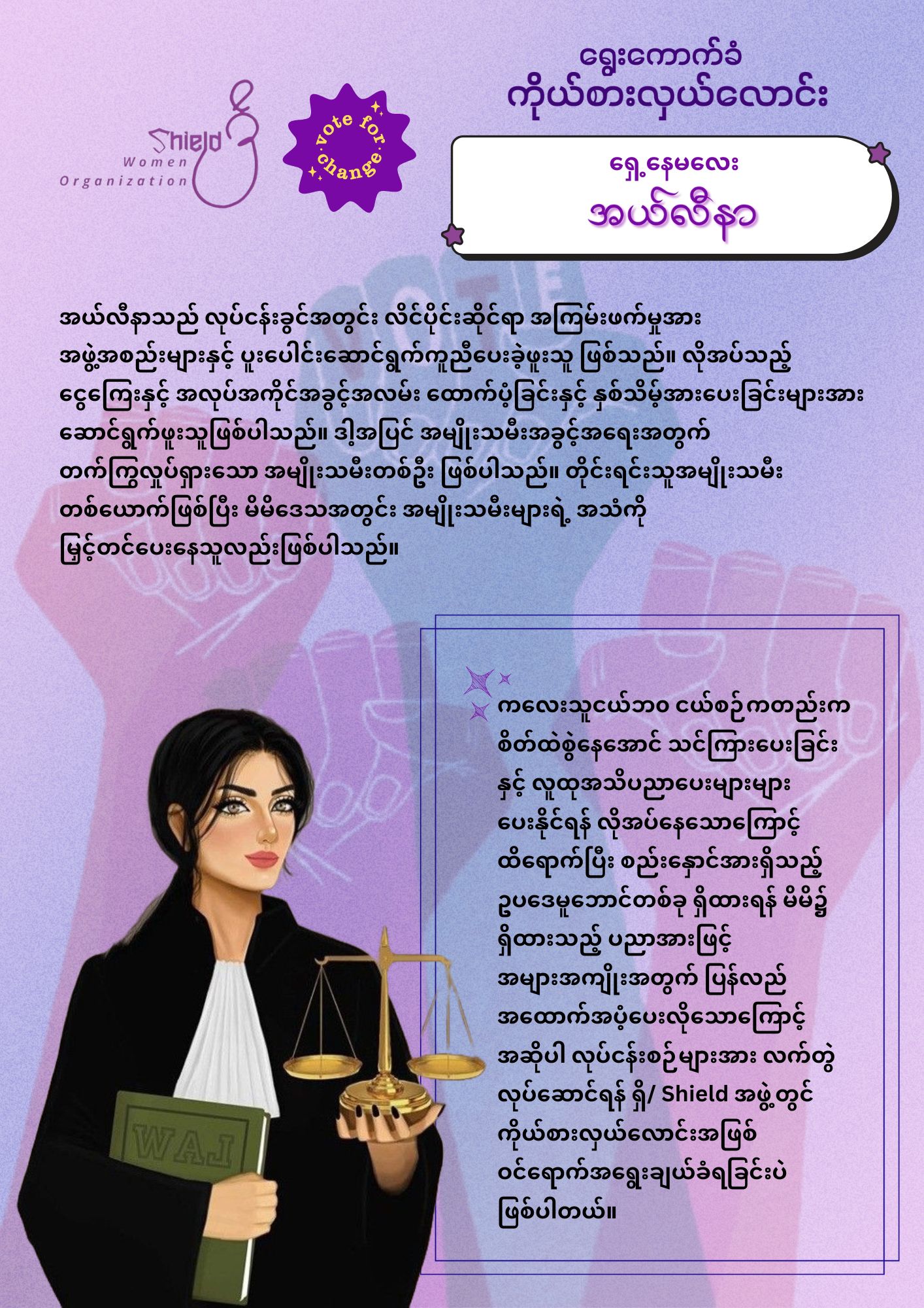 ရှိ/ Shield’အဖွဲ့၏ အမှုဆောင်စီမံခန့်ခွဲမှုအဖွဲ့ (Executive Member Team) ဝင် ဉက္ကဌနှင့် ဒုဉက္ကဌ ရာထူးအား ရွေးကောက်ပွဲရလာဒ်ဖြင့်ဆုံးဖြတ်မည်ဖြစ်ကြောင်း အသိပေးကြေညာခြင်း။ ရှိ/ Shield အဖွဲ့အား အဖွဲ့ပူးတွဲတည်ထောင်သူ ၃ ဦးဖြင့် ကနဦး ဖွဲ့စည်းထားခဲ့ပြီး၊ ရှိ/ Shield ၏ ဖွဲ့စည်းပုံအရ အမှုဆောင်စီမံခန့်ခွဲမှုအဖွဲ့ (Executive Member Team) အား ပူးတွဲတည်ထောင်သူများအပါအဝင် (၂) နှစ်တာ သက်တမ်းရှိမည့် ဥက္ကဌ၊ ဒုတိယဥက္ကဌ နှစ်ဦးဖြင့် ဖွဲ့စည်းသွားမည် ဖြစ်သည်။ သို့ပါ၍ ထို ဥက္ကဌနှင့် ဒုတိယဥက္ကဌ ရာထူးများကို ရွေးကောက်ရွေးချယ်ရန် ၂၀၂၅ ခုနှစ် ဖေဖော်ဝါရီ ၁၇ ရက်နေ့တွင် ရှိ/ Shield ၏ အဖွဲ့ဝင်များအားလုံးပါဝင် မဲပေးရွေးချယ်ခွင့်ရှိသော ပွင့်လင်းမြင်သာသည့် ရွေးကောက်ပွဲတစ်ရပ်အား ကျင်းပသွားမည် ဖြစ်ပါသည်။ ဥက္ကဌနှင့် ဒုတိယဥက္ကဌ အဖြစ် အရွေးချယ်ခံရန် ဖိတ်ခေါ်ခြင်းလုပ်ငန်းကို တရားဝင်ဖိတ်ကြားခဲ့ရာ စုစုပေါင်းကိုယ်စားလှယ် (၁၁) ဦးလျှောက်ထားခဲ့ကြပါသည်။ ရွေးကောက်ပွဲဖြစ်မြောက်ရေး ကော်မတီအနေဖြင့် သတ်မှတ်ထားသော စည်းကမ်းချက်များနှင့်အညီ ပြန်လည်စိစစ်ရွေးချယ်ခဲ့ရာ ကိုယ်စားလှယ်လောင်း (၉) ဦးကို ရွေးချယ်နိုင်ခဲ့ပါသည်။ ယင်းကိုယ်စားလှယ်လောင်းများ၏ အမည်နှင့် မြန်မာပြည်အရေး လှုပ်ရှားဆောင်ရွက်ခဲ့မှုနောက်ခံအခြေအနေအကျဥ်းချုပ်များအား ပုံတစ်ပုံချင်းစီတွင် လေ့လာနိုင်ပါသည်။ [လုံခြုံရေးအခြေအနေကြောင့် Pseudonym များဖြင့်သာ ဖော်ပြထားပါသည်။]ပွင့်လင်းမြင်သာသော ရွေးကောက်ပွဲတွင် ယခုလက်ရှိ ကိုယ်စားလှယ်လောင်း (၉) ဦးထဲမှ ဥက္ကဌနှင့် ဒုတိယဥက္ကဌ ကို အဖွဲ့ဝင် (မန်ဘာဝင်) ထားသူများသာ မဲပေးရွေးချယ်ခွင့် ရရှိမည်ဖြစ်ပြီး မဲရလဒ်များကို ဖော်ပြပါ ဖေဖော်ဝါရီ ၁၇ ရက်နေ့တွင် တခါတည်း ထုတ်ပြန်ကြောညာသွားပါမည်။ ထို့အပြင် ရှိ/ Shield အဖွဲ့၏ အမှုဆောင်စီမံခန့်ခွဲမှုအဖွဲ့ (Executive Member Team) များအားလည်း တခါတည်း ကြေညာမိတ်ဆက်သွားမည် ဖြစ်သည်။ ဆက်လက်ဆောင်ရွက်မည့် လုပ်ငန်စဉ်များနှင့် ဦးဆောင်ကော်မတီ အောင်မြင်စွာ ဖွဲ့စည်းနိုင်ရေး၊ ပွင့်လင်းမြင်သာသည့် မဲစနစ်ဖြစ်ပေါ်လာရေးအတွက် ဖြစ်မြောက်ရေးကော်မတီမှ ဆောင်ရွက်လျှက်ရှိပါသည်။ရှိ/ Shield အဖွဲ့၏ အနာဂတ်မျှော်ရည်ချက်၊ လုပ်ငန်းတာဝန်၊ စံတန်ဖိုးနှင့် ရည်ရွယ်ချက်များကို အောက်ပါလင့်ခ်တွင် သွားရောက်ဖတ်ရှုလေ့လာနိုင်ပါသည်။