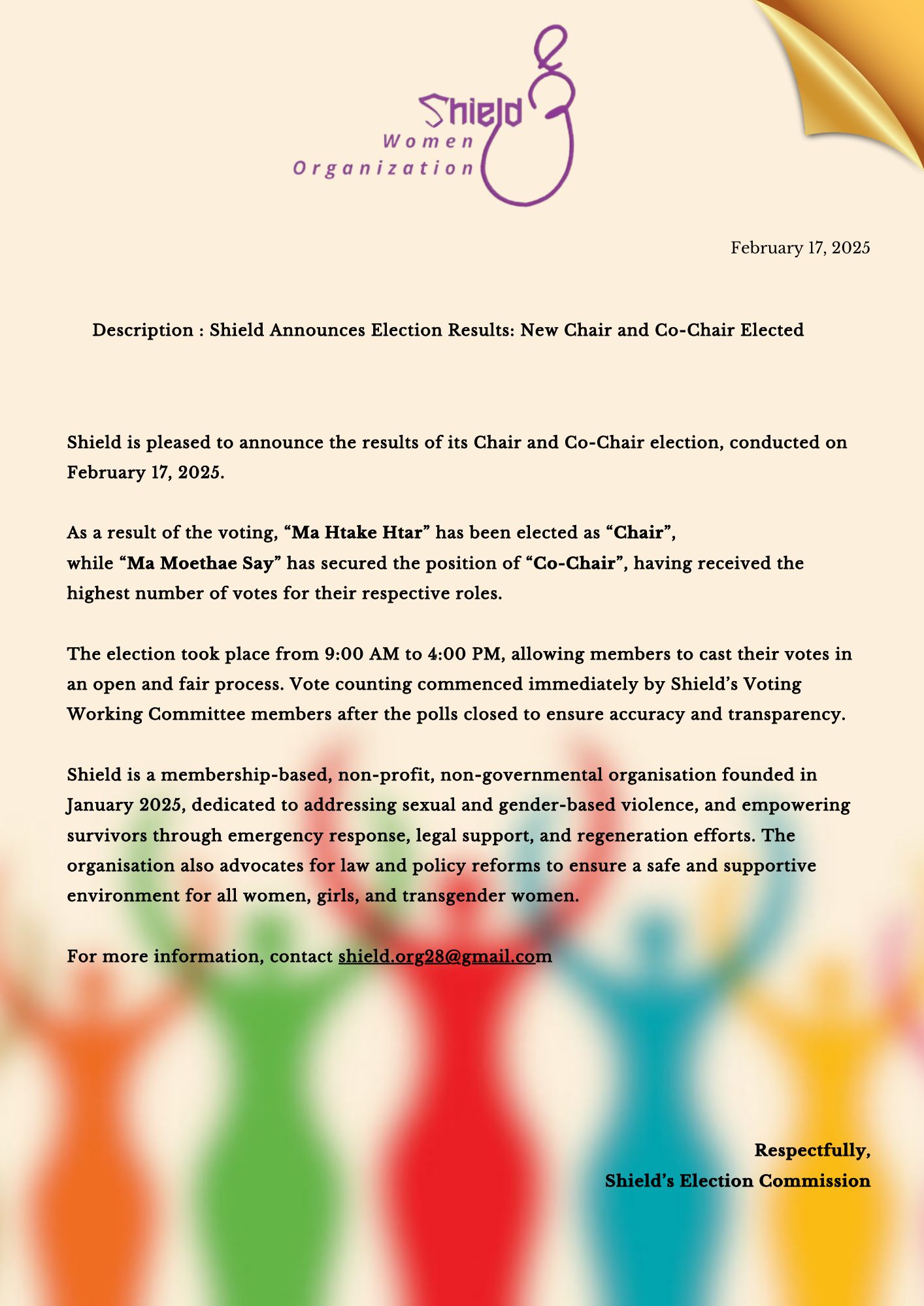 ရှိ/Shield ၏ ရွေးကောက်ပွဲရလဒ်ကြေညာချက် ဥက္ကဌ နှင့် ဒုတိယဥက္ကဌ ရွေးချယ်တင်မြှောက်ခြင်းShield အဖွဲ့၏ ဥက္ကဌ နှင့် ဒုတိယဥက္ကဌ ရွေးကောက်ပွဲကို ၂၀၂၅ ခုနှစ်၊ ဖေဖော်ဝါရီလ၊ ၁၇ ရက်နေ့ တွင် ကျင်းပပြီးဆီးခဲ့ပြီဖြစ်ပါသည်။"မထိပ်ထား" သည် "ဥက္ကဋ္ဌ" အဖြစ် မဲအများဆုံး ရရှိကာ ရွေးချယ်ခံရပြီး၊ "မမိုးသဲစေ" သည် "ဒုတိယဥက္ကဋ္ဌ" အဖြစ် မဲအများဆုံးရရှိကာ ရွေးချယ်ခံရသည်။ရွေးကောက်ပွဲအား ၂၀၂၅ ခုနှစ်၊ ဖေဖော်ဝါရီလ၊ ၁၇ ရက်နေ့ ထိုင်းစံတော်ချိန် နံနက် ၉:၀၀ နာရီမှ ညနေ ၄:၀၀ နာရီအထိ ကျင်းပခဲ့ပြီး၊ ပွင့်လင်းမြင်သာ၍ လွတ်လပ်စွာ မဲပေးခွင့်စနစ်ဖြင့် ရှိ/ Shield အဖွဲ့ဝင်များက မဲပေးခဲ့သည်။ မဲရေတွက်မှုအား မဲပေးခြင်း ပြီးဆုံးချိန်တွင် ချက်ချင်းစတင်ခဲ့ပြီး၊ တိကျမှန်ကန်ရှိစေရန် ရွေးကောင်ပွဲတွင် ပါဝင်ခြင်းမရှိသော ရှိ/ Shield အဖွဲ့၏ ရွေးကောက်ပွဲဖြစ်မြောက်ရေးကော်မတီဝင်များမှ သေချာစိစစ်ဆောင်ရွက် အတည်ပြုခဲ့သည်။ရှိ/ Shield သည် အဖွဲ့ဝင်အခြေပြုဖွဲ့စည်းထားပြီး၊ အစိုးရမဟုတ်သော အကျိုးအမြတ်မယူသည့် အဖွဲ့အစည်းဖြစ်သည်။ ၂၀၂၅ ခုနှစ် ဇန်နဝါရီလတွင် တည်ထောင်ခဲ့ပြီး လိင်ပိုင်းဆိုင်ရာနှင့် ဂျင်ဒါအခြေပြု အကြမ်းဖက်မှုများကို တုံ့ပြန်ပြီး ထိုအကြမ်းဖက်မှုများမှ လွတ်မြောက်လာသူများအား အရေးပေါ် ကယ်ဆယ်ရေးအကူအညီများပေးအပ်ခြင်း၊ ဥပဒေရေးရာ အထောက်အပံ့ပေးခြင်း၊ နှင့် ပြန်လည်ကြံ့ခိုင်လာစေရန် ကြိုးပမ်းမှုများ လုပ်ဆောင်ပေးခြင်း၊ အစရှိသည့် ဝန်ဆောင်မှုများပေးအပ်သည့် အဖွဲ့အစည်းဖြစ်သည်။ ထို့အပြင်၊ ရှိ/Shield သည် အမျိုးသမီးများ၊ မိန်းကလေးများ၊ နှင့် Transgender များအတွက် လုံခြုံမှုရှိပြီး အထောက်အပံ့ဖြစ်စေသော ပတ်ဝန်းကျင် ရရှိစေရန် ဥပဒေနှင့် မူဝါဒပြုပြင်ပြောင်းလဲရေးများကို ပြုလုပ်ခြင်း အစရှိတဲ့ လှုပ်ရှားမှုများဆောင်ရွက်သည့်အဖွဲ့ ဖြစ်သည်။ပိုမိုသိရှိလိုပါက shield.org28@gmail.com ကိုဆက်သွယ်နိုင်ပါသည်။လေးစားစွာဖြင့်ရှိ/ Shield ရွေးကောက်ပွဲဖြစ်မြောက်ရေးကော်မတီIn English BelowShield Announces Election Results: New Chair and Co-Chair ElectedShield is pleased to announce the results of its Chair and Co-Chair election, conducted on February 17, 2025. As a result of the voting, "Ma Htake Htar" has been elected as "Chair", while "Ma Moethae Say" has secured the position of "Co-Chair", having received the highest number of votes for their respective roles.The election took place from 9:00 AM to 4:00 PM, allowing members to cast their votes in an open and fair process. Vote counting commenced immediately by Shield’s Voting Working Committee members after the polls closed to ensure accuracy and transparency.Shield is a membership-based, non-profit, non-governmental organisation founded in January 2025, dedicated to addressing sexual and gender-based violence, and empowering survivors through emergency response, legal support, and regeneration efforts. The organisation also advocates for law and policy reforms to ensure a safe and supportive environment for all women, girls, and transgender women. For more information, contact shield.org28@gmail.com