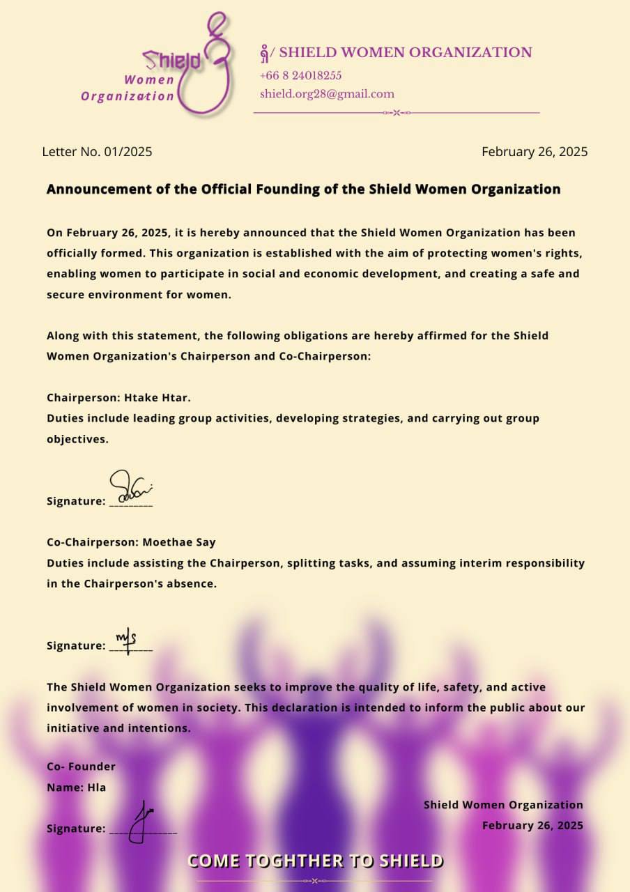 ရှိ/ Shield အမျိုးသမီးအဖွဲ့ ဖွဲ့စည်းခြင်း ကြေညာချက်
