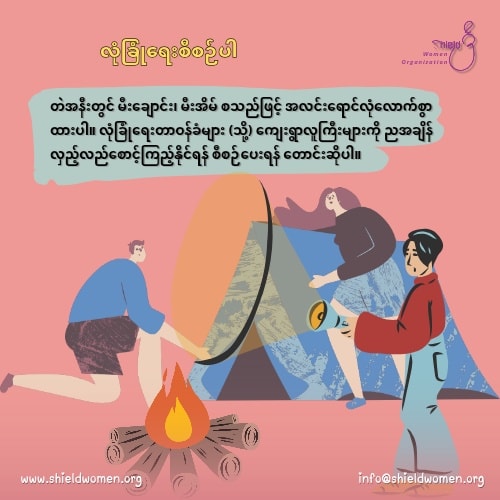 " အမျိုးသမီးများအတွက် အရေးပေါ်အခြေအနေများတွင် ဂရုပြုစရာများ "အရေးပေါ်အခြေအနေများတွင် အမျိုးသမီးများ မိမိကိုယ်ကိုယ်ကာကွယ် နေထိုင်ကြဖို့ တိုက်တွန်းပါရစေ။ အထူးသဖြင့် ဥပဒေအကာအကွယ် မရယူနိုင်တဲ့ အခြေအနေတွေမှာ မိမိကိုယ်ကိုယ် ကာကွယ်ခြင်းသည်သာ အကောင်းဆုံးသော ဖြေရှင်းနည်းဖြစ်ပါတယ်။အမျိုးသမီးလေးတွေအနေနဲ့ အရေးပေါ်အခြေအနေတွေမှာ ဂရုပြုရမယ့် ဆောင်ရန်၊ ရှောင်ရန်လေးများကို မျှဝေပေးပါရစေ။လိင်အကြမ်းဖက်မှုသည် မည်သည့်အခြေအနေတွင်မဆို လက်မခံနိုင်သော ရာဇဝတ်မှုဖြစ်ကြောင်း သတိရပါ။