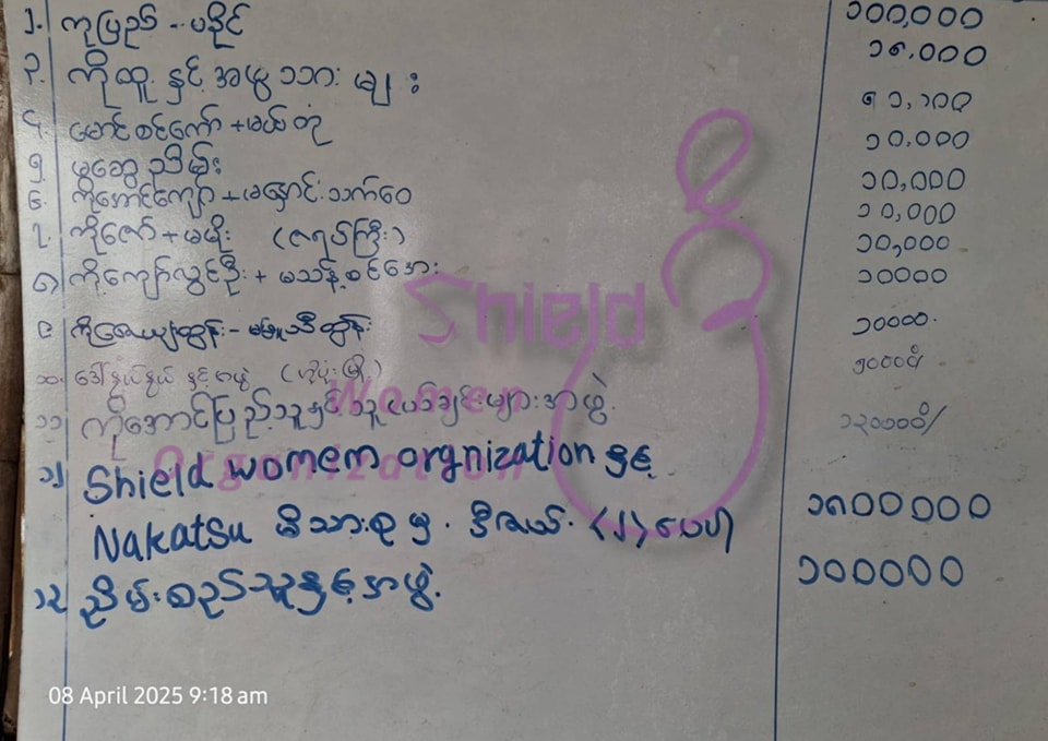 " အင်းလေးဒေသမှ ငလျင်ဒဏ်သင့် ပြည်သူများအား ပံ့ပိုးကူညီမှု " ရှိ/ Shield Women Organization နှင့် Nakatsu မိသားစုတို့၏ ပူးပေါင်းဆောင်ရွက်မှုဖြင့် မြန်မာနိုင်ငံမှ ငလျင်ဒဏ်သင့် ပြည်သူများအား ကူညီဖေးမမည့် အစီအစဉ် မှ အင်းလေး ဟဲယာရွာမကလေးငယ်ရှိ အိမ်ခြေတစ်ထောင်ကျော်နှင့် အနီးအနားရှိပတ်၀န်းကျင်ကျေးရွာများမှ ငလျင်ဒဏ်ခံစားခဲ့ရသော မိဘပြည်သူများထံသို့ ဧပြီလ ၇ ရက်၊ ၂၀၂၅ တွင် အရေးပေါ်သောက်သုံးရေ ရရှိနိုင်ရေးအတွက် ရေတင်စက်၊ ရေသန့်စက် လည်ပတ်နိုင်ရန် ဒီဇယ်ဆီ ၂ပေပါအတွက် မြန်မာငွေ (၁၈)သိန်းအပြင် မြန်မာငွေ (၄)သိန်း အသုံးပြုကာ အမျိုးသမီး လစဥ်သုံး၊ ဓာတ်ဆားနှင့် ဆေးဝါးများလည်း ဝေမျှကူညီပေးခဲ့ပါသည်။ရှိ/ Shield Women Organization နှင့် Nakatsu မိသားစုမှတဆင့် လှူဒါန်းကူညီပေးခဲ့သော အလှူရှင်များနှင့် အဖွဲ့ကိုယ်စား မြေပြင်တွင် သွားရောက်ကူညီလှူဒါန်းပေးပါသော ကလေးငယ်ရွာ၊ အင်းလေးမှ Mission for christ Senior Care အားလည်း မိဘပြည်သူများကိုယ်စား အထူးကျေးဇူးတင်ရှိကြောင်း ယခု Post မှ မှတ်တမ်းတင်ဂုဏ်ပြုလိုက်ပါရစေ။