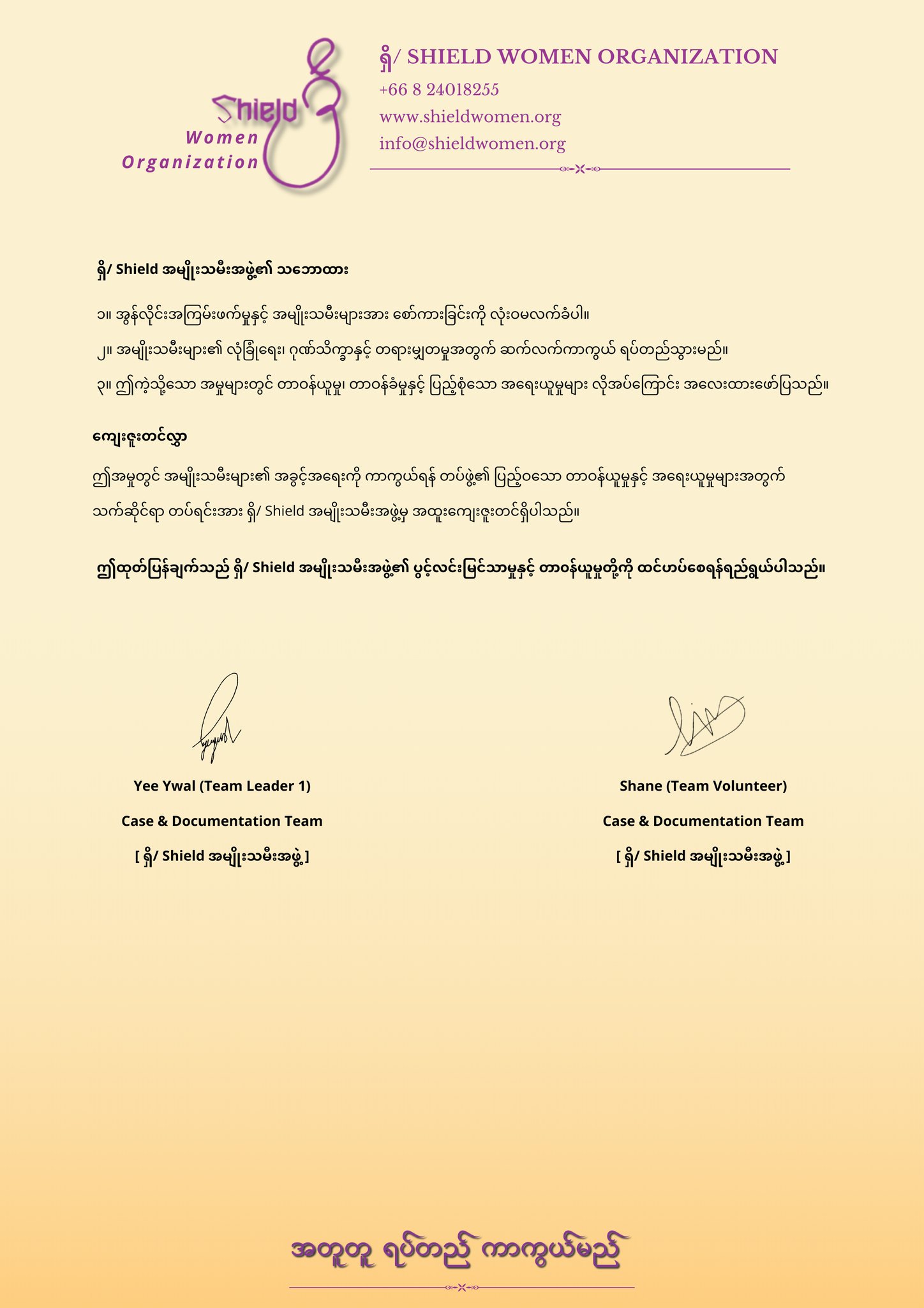 “ထုတ်ပြန်ကြေညာချက်”ရှိ/ Shield အမျိုးသမီးအဖွဲ့ထုတ်ပြန်သည့် ရက်စွဲ : ၂၀၂၅ ခုနစ်၊ ဧပြီလ၊ ၂၀ ရက်စုံစမ်းဖော်ထုတ်မှု အမှတ်စဉ် : ၀၀၀၁/၂၀၂၅ဖြစ်ရပ်အကြောင်းအရာ၂၀၂၄ ခုနှစ် ဖေဖော်ဝါရီလအတွင်း PDF ရဲဘော် ဝင်းဦး မှ Facebook Messenger ပေါ်တွင် အမျိုးသမီးတစ်ဦးအား ညစ်ညမ်းစွာ ပြောဆိုစော်ကားမှု ကျူးလွန်ခဲ့ပြီး နစ်နာသူမှ ရှိ/ Shield အမျိုးသမီးအဖွဲ့သို့ တိုင်ကြားခဲ့ပါသည်။ရှိ/Shield အမျိုးသမီးအဖွဲ့သည် တိုင်တန်းလာသူများ၏ နစ်နာမှုများကို အခြေအနေပေါ်မူတည်၍ စုံစမ်းကူညီမှုများကို လုပ်ဆောင်ပေးနေပြီဖြစ်သည့်အတွက် မိမိတို့၏ အမှန်တရားအတွက် ဝိုင်းဝန်းအဖြေရှာပေးရန် အကူအညီလိုအပ်သူများကို ဖေးမကူညီရန် အသင့်ရှိနေပါသည်။တိုင်တန်းလိုသူများအနေဖြင့် အောက်ပါလင့်တွင် ဝင်ရောက်စာရင်းတင်သွင်းတိုင်ကြားနိုင်ပါသည်။တိုင်ကြားရန် နှိပ်ပါဆက်သွယ်ရန်ရှိ/ Shield အမျိုးသမီးအဖွဲ့+666-2693-2337info@shieldwomen.org