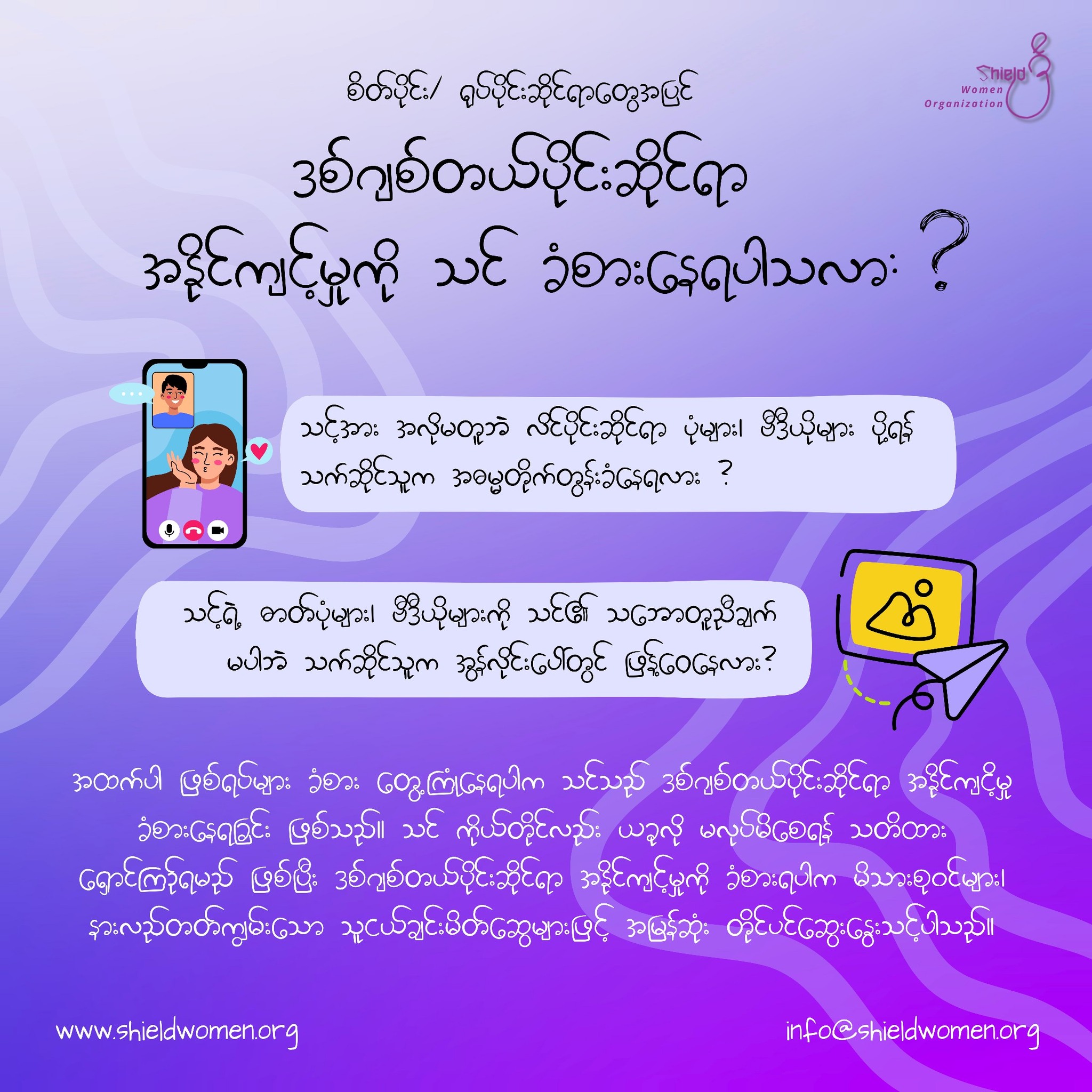 သင် ဒစ်ဂျစ်တယ်ပိုင်းဆိုင်ရာ အနိုင်ကျင့်မှု ခံစားနေရပြီလား?အွန်လိုင်းမှတဆင့် များစွာသော မတော်တဆမှုများ၊ စိတ်ဖိစီးမှုများ၊ ခြိမ်းခြောက်မှုများနှင့် ပုဂ္ဂိုလ်ရေးဆိုင်ရာ လိမ်လည်မှုများ ကြုံတွေ့နိုင်ပါတယ်။ သင်လည်း ဒီလိုအခြေအနေမျိုးတွေ ရင်ဆိုင်ကြုံတွေ့နေရပါသလား?ဒီလိုအခြေအနေတွေ ကြုံတွေ့လာပါက ယုံကြည်စိတ်ချရတဲ့ မိတ်ဆွေများနှင့် တိုင်ပင်သင့်ပါတယ်။ Shield Women Organization မှာလည်း ယုံကြည်စွာ တိုင်ပင်နိုင်ပါတယ်။ ကျွန်ုပ်တို့ အဖွဲ့အစည်းအနေဖြင့် သင်၏ ကိုယ်ပိုင်အချက်အလက်များကို စနစ်တကျ ထိန်းသိမ်းထားပြီး သင်ခံစားနေရတဲ့ စိတ်ဖိစီးမှုများ၊ သင် ကြုံတွေ့နေရတဲ့ အန္တရာယ်များကို ကာကွယ်ဖြေရှင်းနိုင်ရန် ဆောင်ရွက်ပေးသွားမှာပဲ ဖြစ်ပါတယ်။