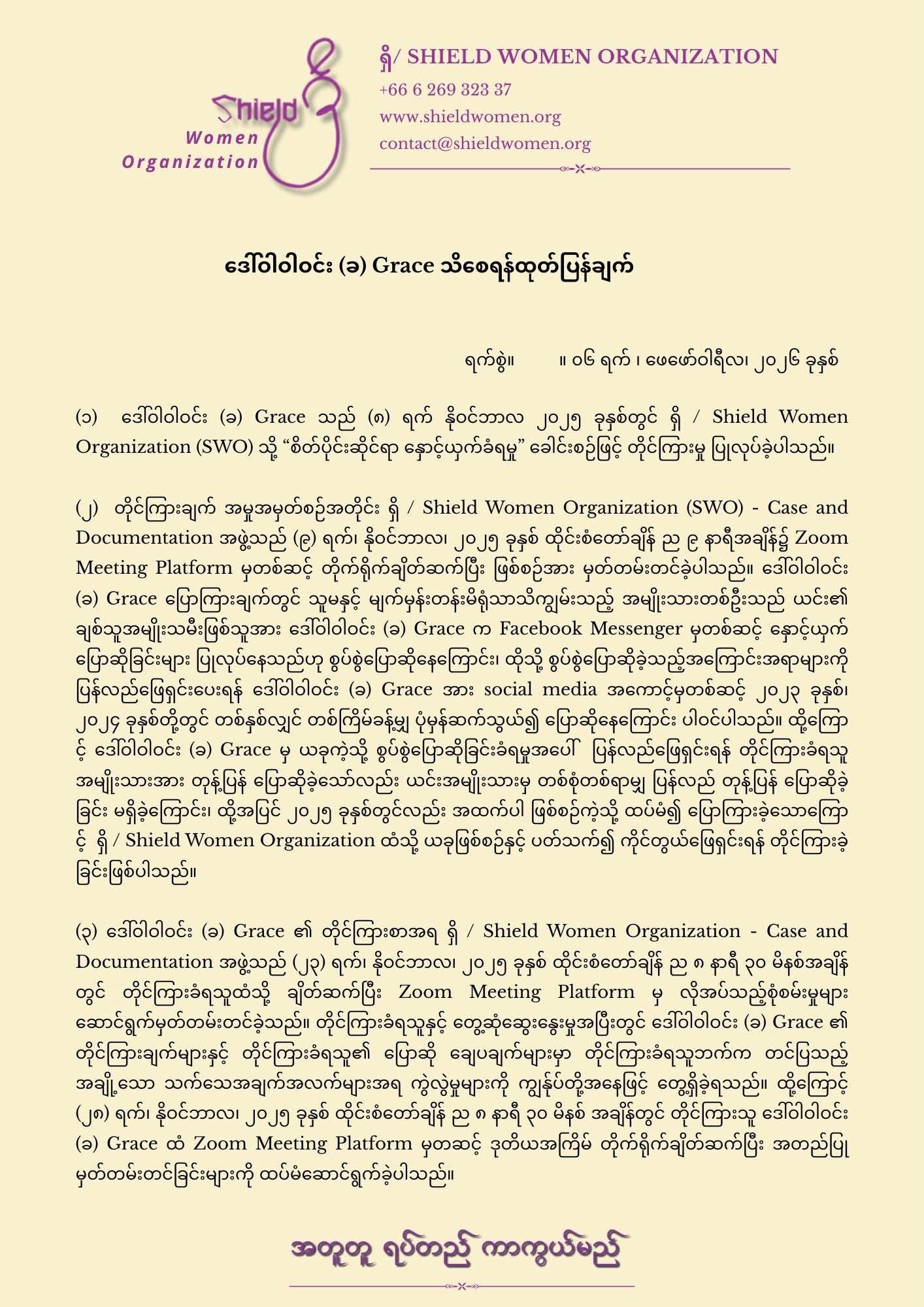 တိုင်ကြားရန်အမျိုးသမီးများ သိရှိသင့်သည့် ဥပဒေရေးရာ အခွင့်အရေးများကို အခမဲ့ ဆွေးနွေးနိုင်ပါသည်။