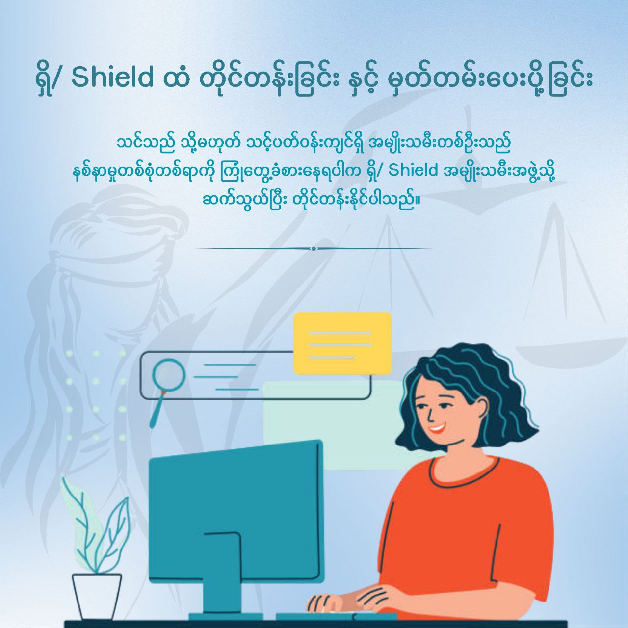 တိုင်ကြားရန်အမျိုးသမီးများ သိရှိသင့်သည့် ဥပဒေရေးရာ အခွင့်အရေးများကို အခမဲ့ ဆွေးနွေးနိုင်ပါသည်။