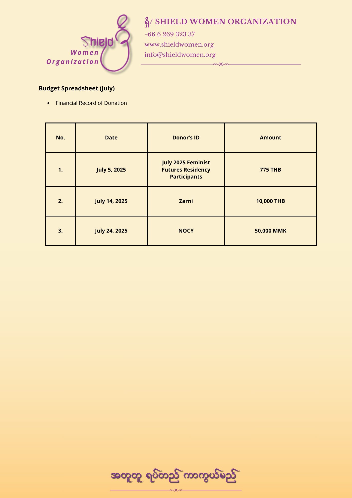 ရှိ/ Shield အမျိုးသမီးအဖွဲ့ငွေစာရင်းရှင်းတမ်းရက်စွဲ : ၀၅ ဩဂုတ်လ ၂၀၂၅။ရှိ/ အမျိုးသမီးအဖွဲ့ ၏ ၂၀၂၅ ခုနှစ်၊ ဇူလှိုင်လ တစ်လတာ ဘဏ္ဍာရေးရှင်းတမ်းနှင့် ပံ့ပိုးသူများစာရင်းတို့အား ဖော်ပြအပ်ပါသည်။၁။ ရည်ရွယ်ချက်ရှိ/ Shield အမျိုးသမီးအဖွဲ့အနေဖြင့် လူမှုအကျိုးပြုလုပ်ငန်းများကို ဆောင်ရွက်ရာတွင် ပွင့်လင်းမြင်သာမှုရှိစေရန်အတွက် ပံ့ပိုးကူညီသူများ၊ အဖွဲ့ဝင်များနှင့် အများပြည်သူတို့အား ငွေကြေးအသုံးစရိတ်များကို ရှင်းလင်းစွာ သိရှိနိုင်စေရန် ဤငွေစာရင်းရှင်းတမ်းကို ထုတ်ပြန်လိုက်ပါသည်။၂။ ငွေစာရင်းအကျဉ်းOperating Balance = 27,986 THBJuly 2025 ရရှိငွေ - MMK 50,000*0.0071rate = 357 THBTHB 10,775 = 10,775 THB __________________ရရှိငွေစုစုပေါင်း = 11,132 THB Jun. 2025 သုံးစွဲထားပြီး ငွေ - = 17,720.25 THB28000 MMK *0.0072rate = 202 THB __________________ = 17,922.25 THB___________________________________________Finance Summary DescriptionAmount (THB) Operating Balance 27,986 Income 11,132expenses 17,922.25Total Balance 21,195.75၃။ ဝင်ငွေအသေးစိတ် • အလှူငွေများ : 50,000 MMK, 10,775 THB၄။ အသုံးစရိတ်အသေးစိတ်5,000 THB (Emergency for Case-48) 1,100 THB (Emergency Transportation for Case-48) 100 THB (For Case-0021 ) 11620.25 THB( Shield’s Office Opening Expense) 202 THB (အဖွဲ့အတွင်း လိုအပ်သော Technical Support အသုံးစရိတ်ဖြစ်ပါသည် ) ______________***__________၅။ မှတ်ချက်များ(က) လစဉ် (၅)ရက်နေ့တိုင်းတွင် ရှိ/ Shield အမျိုးသမီးအဖွဲ့၏ တစ်လတာ ငွေကြေးရှင်းတမ်းနှင့် ပံ့ပိုးသူများစာရင်းကို ထုတ်ပြန်ကြေညာမည်ဖြစ်ပါသည်။(ခ) လက်ရှိတွင် ရှိ/ Shield အမျိုးသမီးအဖွဲ့အနေဖြင့် လုပ်ငန်းဆောင်ရွက်ရန် အသုံးစရိတ်များကို ကူညီအားဖြည့်ပေးသော တစ်သီးပုဂ္ဂလ ပြည်သူနှင့် အဖွဲ့ဝင်များထံမှရရှိသော ငွေကြေးများအား အဖွဲအစည်း၏ ဆောင်ရွက်နေမှုများဖြစ်သော- နစ်နာသူများကို အရေးပေါ်အခြေနေတွင် သွားရောက်ခေါ်ဆောင်ပေးခြင်း၊ ခိုလှုံနိုင်ရန် ဘေးကင်းလုံခြုံရာ နေရာများစီစဉ်ပေးခြင်း- သက်ဆိုင်ရာ နယ်မြေအာဏာပိုင်များထံသို့ သွားရောက်တွေ့ဆုံ တိုင်ကြားနိုင်ရန် ကူညီပေးခြင်း တိုင်တန်းမှု၊ တရားစွဲဆိုမှုများလိုအပ်လာပါက ဥပဒေရေးရာ အကြံပြုပံ့ပိုးပေးခြင်း- စိတ်ပိုင်းဆိုင်ရာ ထိရှနာကျင်မှုများ ပြန်လည်သက်သာလာနိုင်စေရန် ကူညီပေးခြင်း- ကိုယ်တိုင်ပြန်လည်ရပ်တည် လာနိုင်စေရန် ပံ့ပိုးမှုများ လမ်းညွှန်မှုများပေးခြင်း စသည့်ဆောင်ရွက်မှုလုပ်ငန်းစဉ်များတွင် သုံးစွဲပါသည်။(ဂ) ရှိ/ Shield အမျိုးသမီးအဖွဲ့ Members များအနေဖြင့်လည်း အဖွဲ့အစည်း၏ ဘဏ္ဍာရေးမှတ်တမ်းများကို Finance Team ထံသို့ အချိန်မရွေး တောင်းယူကြည့်ရှုနိုင်ပါသည်။ • ရှိ/ Shield အမျိုးသမီးအဖွဲ့သည် အကျိုးအမြတ်မယူသော သီးခြားရပ်တည်သည့် အဖွဲ့ဖြစ်ပြီး လုပ်ငန်းဆောင်ရွက်မှုများအတွက် အဖွဲ့ဝင်များနှင့် သီးခြားလွတ်လပ်သော ပြည်သူများ၏ ပံ့ပိုးမှုဖြင့်သာ ဆောင်ရွက်နေသော အဖွဲ့ဖြစ်ပါသည်။ဆက်သွယ်ရန်ရှိ/Shield အမျိုးသမီးအဖွဲ