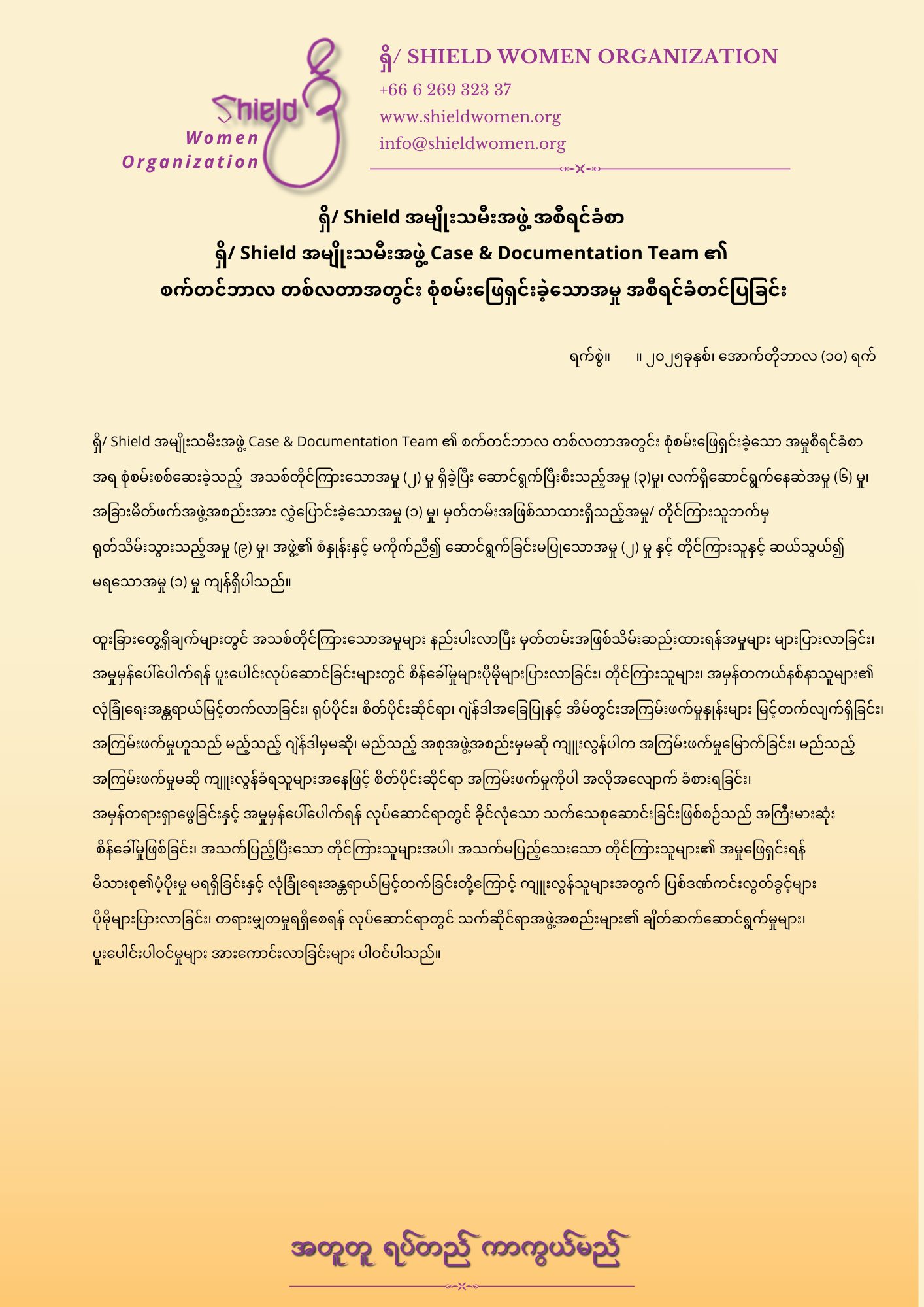 ရှိ/ Shield အမျိုးသမီးအဖွဲ့ အစီရင်ခံစာရှိ/ Shield အမျိုးသမီးအဖွဲ့ Case & Documentation Management Team ၏ စက်တင်ဘာ တစ်လတာအတွင်း စုံစမ်းဖြေရှင်းခဲ့သောအမှုအစီရင်ခံတင်ပြခြင်း၁။ ၂၀၂၅ခုနှစ် စက်တင်ဘာအတွက် အနှစ်ချုပ်အသစ်တိုင်ကြားသောအမှု - ၂ မှု ဆောင်ရွက်ပြီးစီးသောအမှု - ၃ မှု လက်ရှိဆောင်ရွက်နေဆဲအမှု - ၆ မှု အခြားမိတ်ဖက်အဖွဲ့အစည်းအား လွှဲပြောင်းခဲ့သောအမှု - ၁ မှု မှတ်တမ်းအဖြစ်သာထားရှိသည့်အမှု/တိုင်ကြားသူဘက်မှ ရုတ်သိမ်းသွားသည့်အမှု- ၉ မှု တိုင်ကြားလာသည်ကိုအကြောင်းပြန်ရန် ကျန်ရှိသောအမှုများ - မရှိအဖွဲ့၏ စံနှုန်းနှင့် မကိုက်ညီ၍ ဆောင်ရွက်ခြင်းမပြုသောအမှု - ၂ မှု တိုင်ကြားသူနှင့် ဆယ်သွယ်၍ မရသောအမှု - ၁ မှု ရပ်နားထားသောအမှု - မရှိ________________________________________၂။ ၂၀၂၅ခုနှစ် ဇန်နဝါရီလမှစ၍ အနှစ်ချုပ်စုစုပေါင်း တိုင်ကြားလာသောအမှု - ၅၉ မှု ဆောင်ရွက်ပြီးစီးသောအမှု - ၁၈ မှု လက်ရှိဆောင်ရွက်နေဆဲအမှု - ၁၂ မှု အခြားမိတ်ဖက်အဖွဲ့အစည်းအား လွှဲပြောင်းခဲ့သောအမှု - ၄ မှု မှတ်တမ်းအဖြစ်သာထားရှိသည့်အမှု/တိုင်ကြားသူဘက်မှ ရုတ်သိမ်းသွားသည့်အမှု - ၁၂ မှု အဖွဲ့၏ စံနှုန်းနှင့် မကိုက်ညီ၍ ဆောင်ရွက်ခြင်းမပြုသောအမှု - ၅ မှု တိုင်ကြားသူနှင့် ဆယ်သွယ်၍ မရသောအမှု - ၈ မှု တိုင်ကြားလာသည်ကိုအကြောင်းပြန်ရန် ကျန်ရှိသောအမှုများ - မရှိရပ်နားထားသောအမှု - မရှိ________________________________________၃။ အမှုများကို ခွဲခြမ်းစိတ်ဖြာခြင်းShield Women Organization အနေဖြင့် ၂၀၂၅ ခုနှစ် ဖေဖော်ဝါရီလမှစ၍ ယနေ့အထိ အမှုစုစုပေါင်း ၅၈ ခု (အမှုအမှတ် - ၅၉ မှာ လက်ရှိချိတ်ဆက်ဆောင်ရွက်နေဆဲ)ကို လက်ခံကိုင်တွယ် ကူညီဖြေရှင်းပေးခဲ့ရာတွင် အောက်ပါအတိုင်း သတ်မှတ်ခွဲခြား ထုတ်ဖော်နိုင်ခဲ့ပါသည်။အိမ်တွင်းအကြမ်းဖက်မှု ( Domestic Violence ) - ၁၈ မှု အိမ်တွင်းအကြမ်းဖက်မှုအောက်၌ ထပ်မံစီစစ်ရာတွင် ရုပ်ပိုင်းဆိုင်ရာ အကြမ်းဖက်မှု - ၁၆ မှု စိတ်ပိုင်းဆိုင်ရာ အကြမ်းဖက်မှု - ၂ မှုအွန်လိုင်းနည်းပညာဆိုင်ရာ အကြမ်းဖက်မှု - မရှိလိင်ပိုင်းဆိုင်ရာအကြမ်းဖက်မှု (Sexual Violence) - ၂၄ မှု လိင်ပိုင်းဆိုင်ရာအကြမ်းဖက်မှုအောက်၌ ထပ်မံစီစစ်ရာတွင် ရုပ်ပိုင်းဆိုင်ရာ အကြမ်းဖက်မှု - ၁၄ မှု စိတ်ပိုင်းဆိုင်ရာ အကြမ်းဖက်မှု - ၂ မှုအွန်လိုင်းနည်းပညာဆိုင်ရာ အကြမ်းဖက်မှု - ၈ မှုဂျဲန်ဒါအခြေပြုအကြမ်းဖက်မှု (Gender-based Violence) - ၁၁ မှု ဂျဲန်ဒါအခြေပြုအကြမ်းဖက်မှုအောက်၌ ထပ်မံစီစစ်ရာတွင် ရုပ်ပိုင်းဆိုင်ရာ အကြမ်းဖက်မှု - ၃ မှု စိတ်ပိုင်းဆိုင်ရာ အကြမ်းဖက်မှု - ၄ မှုအွန်လိုင်းနည်းပညာဆိုင်ရာ အကြမ်းဖက်မှု - ၄ မှုအဖွဲ့၏ မူဝါဒများနှင့် မကိုက်ညီသဖြင့် လက်ခံဆောင်ရွက်ခြင်း မပြုသော အမှု - ၅ မှု ________________________________________၄။ စက်တင်ဘာလတစ်လတာအတွင်း ဆောင်ရွက်ပြီးစီးသောအမှုအကျဉ်းချုပ် - ၃ မှု***(၁) အမှုနံပ