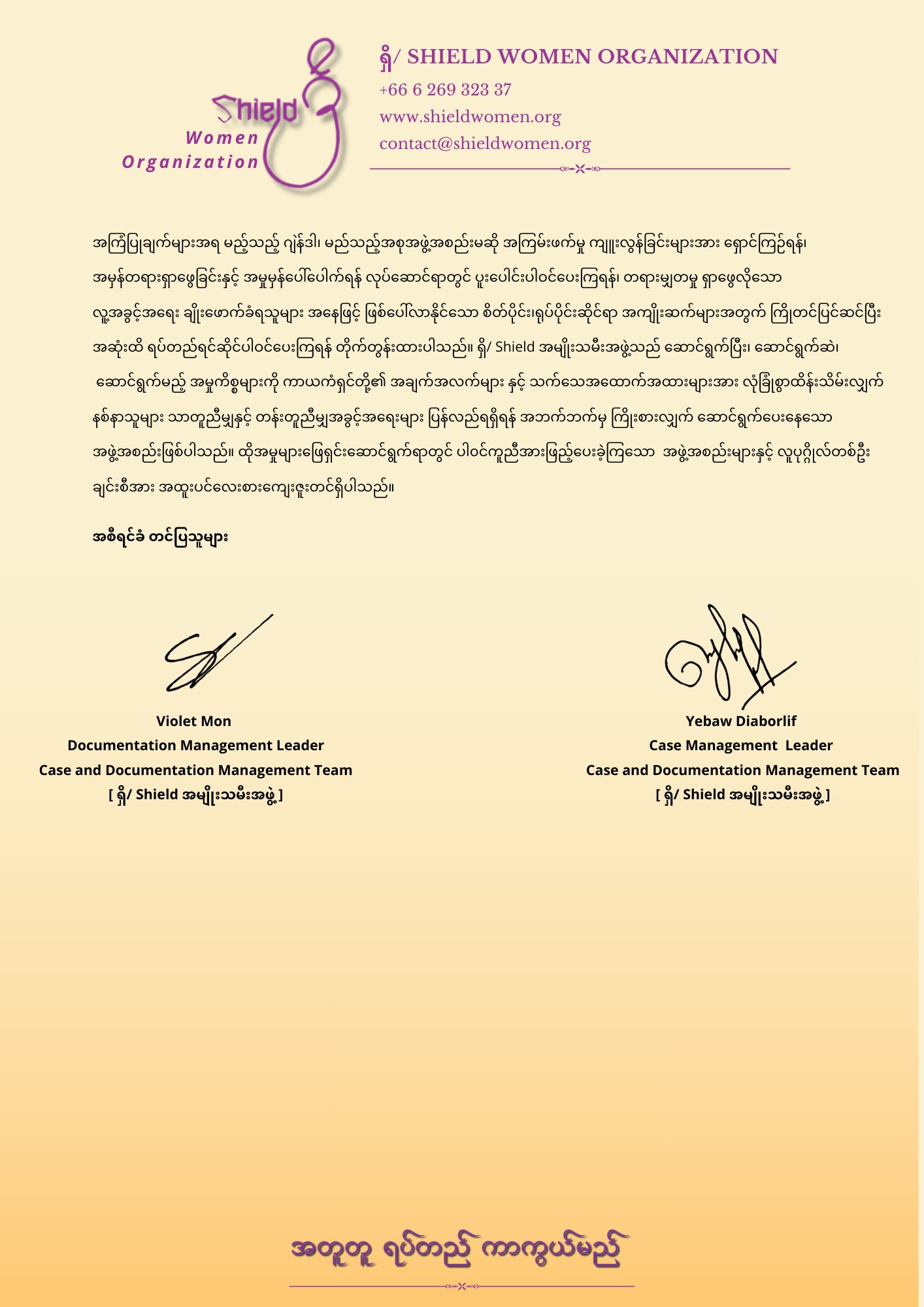 ရှိ/ Shield အမျိုးသမီးအဖွဲ့ အစီရင်ခံစာရှိ/ Shield အမျိုးသမီးအဖွဲ့ Case & Documentation Management Team ၏ အောက်တိုဘာလ တစ်လတာအတွင်း စုံစမ်းဖြေရှင်းခဲ့သောအမှုအစီရင်ခံတင်ပြခြင်း၁။ ၂၀၂၅ခုနှစ် အောက်တိုဘာလ အတွက် အနှစ်ချုပ်အသစ်တိုင်ကြားသောအမှု - ၃ မှု ဆောင်ရွက်ပြီးစီးသောအမှု - ၃မှု လက်ရှိဆောင်ရွက်နေဆဲအမှု - ၈ မှု အခြားမိတ်ဖက်အဖွဲ့အစည်းအား လွှဲပြောင်းခဲ့သောအမှု - မရှိမှတ်တမ်းအဖြစ်သာထားရှိသည့်အမှု/တိုင်ကြားသူဘက်မှ ရုတ်သိမ်းသွားသည့်အမှု-၂ မှု တိုင်ကြားလာသည်ကိုအကြောင်းပြန်ရန် ကျန်ရှိသောအမှု - မရှိအဖွဲ့၏ စံနှုန်းနှင့် မကိုက်ညီ၍ ဆောင်ရွက်ခြင်းမပြုသောအမှု - ၁ မှု တိုင်ကြားသူနှင့် ဆယ်သွယ်၍ မရသောအမှု - ၁ မှု ရပ်နားထားသောအမှု - မရှိ________________________________________၂။ ၂၀၂၅ခုနှစ် ဇန်နဝါရီလမှစ၍ အနှစ်ချုပ်စုစုပေါင်း တိုင်ကြားလာသောအမှု - ၆၂ မှု ဆောင်ရွက်ပြီးစီးသောအမှု - ၂၀ မှု လက်ရှိဆောင်ရွက်နေဆဲအမှု - ၁၀ မှု အခြားမိတ်ဖက်အဖွဲ့အစည်းအား လွှဲပြောင်းခဲ့သောအမှု - ၄ မှု မှတ်တမ်းအဖြစ်သာထားရှိသည့်အမှု/တိုင်ကြားသူဘက်မှ ရုတ်သိမ်းသွားသည့်အမှု - ၁၃ မှု အဖွဲ့၏ စံနှုန်းနှင့် မကိုက်ညီ၍ ဆောင်ရွက်ခြင်းမပြုသောအမှု - ၆ မှု တိုင်ကြားသူနှင့် ဆယ်သွယ်၍ မရသောအမှု - ၉ မှု တိုင်ကြားလာသည်ကိုအကြောင်းပြန်ရန် ကျန်ရှိသောအမှု - မရှိရပ်နားထားသောအမှု - မရှိ________________________________________၃။ အမှုများကို ခွဲခြမ်းစိတ်ဖြာခြင်းShield Women Organization အနေဖြင့် ၂၀၂၅ ခုနှစ် ဖေဖော်ဝါရီလမှစ၍ ယနေ့အထိ အမှုစုစုပေါင်း ၆၂ ခု ကို လက်ခံကိုင်တွယ် ကူညီဖြေရှင်းပေးခဲ့ရာတွင် အောက်ပါအတိုင်း သတ်မှတ်ခွဲခြား ထုတ်ဖော်နိုင်ခဲ့ပါသည်။အိမ်တွင်းအကြမ်းဖက်မှု ( Domestic Violence ) - ၁၈ မှု အိမ်တွင်းအကြမ်းဖက်မှုအောက်၌ ထပ်မံစီစစ်ရာတွင် ရုပ်ပိုင်းဆိုင်ရာ အကြမ်းဖက်မှု - ၁၆ မှု စိတ်ပိုင်းဆိုင်ရာ အကြမ်းဖက်မှု - ၂ မှုအွန်လိုင်းနည်းပညာဆိုင်ရာ အကြမ်းဖက်မှု - မရှိလိင်ပိုင်းဆိုင်ရာအကြမ်းဖက်မှု (Sexual Violence) -၂၆ မှု လိင်ပိုင်းဆိုင်ရာအကြမ်းဖက်မှုအောက်၌ ထပ်မံစီစစ်ရာတွင် ရုပ်ပိုင်းဆိုင်ရာ အကြမ်းဖက်မှု - ၁၅မှု စိတ်ပိုင်းဆိုင်ရာ အကြမ်းဖက်မှု - ၂ မှုအွန်လိုင်းနည်းပညာဆိုင်ရာ အကြမ်းဖက်မှု - ၉ မှုဂျဲန်ဒါအခြေပြုအကြမ်းဖက်မှု (Gender-based Violence) - ၁၂မှု ဂျဲန်ဒါအခြေပြုအကြမ်းဖက်မှုအောက်၌ ထပ်မံစီစစ်ရာတွင် ရုပ်ပိုင်းဆိုင်ရာ အကြမ်းဖက်မှု - ၃ မှု စိတ်ပိုင်းဆိုင်ရာ အကြမ်းဖက်မှု - ၄ မှုအွန်လိုင်းနည်းပညာဆိုင်ရာ အကြမ်းဖက်မှု - ၅ မှုအဖွဲ့၏ မူဝါဒများနှင့် မကိုက်ညီသဖြင့် လက်ခံဆောင်ရွက်ခြင်း မပြုသော အမှု - ၆ မှု ________________________________________၄။အောက်တိုဘာလတစ်လတာအတွင်း ဆောင်ရွက်ပြီးစီးသောအမှုအကျဉ်းချုပ် - ၃ မှု***(၁) အမှုနံပါတ် - Case-0032*** အမှုခေါင်းစဉ် - လိင်ပိုင်းဆိုင်ရာအမြတ်ထ