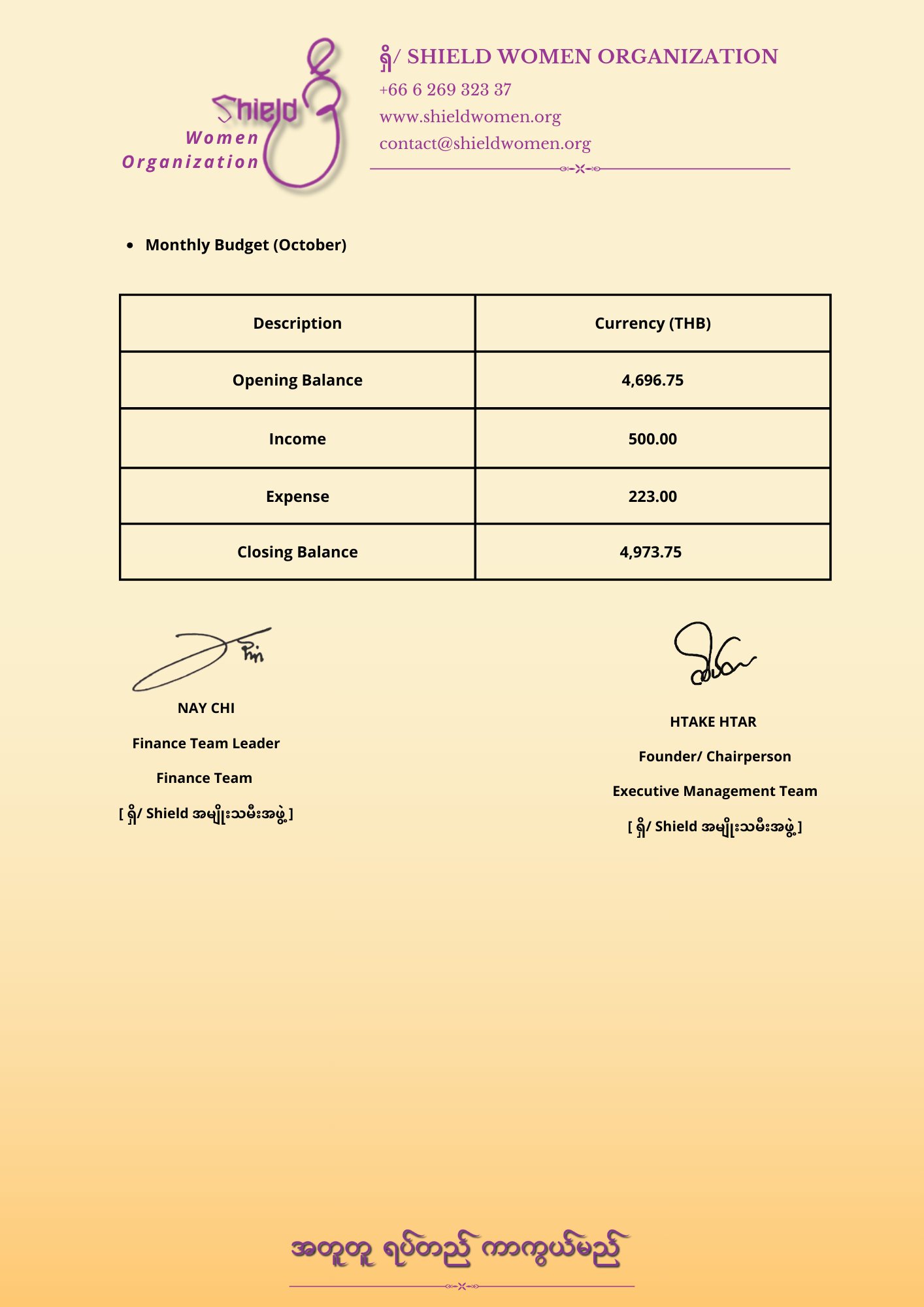 ရှိ/ Shield အမျိုးသမီးအဖွဲ့ငွေစာရင်းရှင်းတမ်းရက်စွဲ : ၂၄ နို၀င်ဘာလ ၂၀၂၅။ရှိ/ Shield အမျိုးသမီးအဖွဲ့ ၏ ၂၀၂၅ ခုနှစ်၊ အောက်တိုဘာလ တစ်လတာ ဘဏ္ဍာရေးရှင်းတမ်းနှင့် ပံ့ပိုးသူများစာရင်းတို့အား ဖော်ပြအပ်ပါသည်။၁။ ရည်ရွယ်ချက်ရှိ/ Shield အမျိုးသမီးအဖွဲ့အနေဖြင့် လူမှုအကျိုးပြုလုပ်ငန်းများကို ဆောင်ရွက်ရာတွင် ပွင့်လင်းမြင်သာမှုရှိစေရန်အတွက် ပံ့ပိုးကူညီသူများ၊ အဖွဲ့ဝင်များနှင့် အများပြည်သူတို့အား ငွေကြေးအသုံးစရိတ်များကို ရှင်းလင်းစွာ သိရှိနိုင်စေရန် ဤငွေစာရင်းရှင်းတမ်းကို ထုတ်ပြန်လိုက်ပါသည်။၂။ ငွေစာရင်းအကျဉ်းOperating Balance = 4,696.75 THBOctober 2025 ရရှိငွေ စုစုပေါင်း = 500 THBOctober 2025 သုံးစွဲထားပြီး ငွေ = (- 223 THB)28000 MMK *0.00797rate __________________ Closing Balance = 4,973.75 THBFinance Summary DescriptionAmount (THB)Operating Balance 4,696.75 THBIncome 500 THBExpenses 223 THBTotal Balance 4,973.75 THB၃။ ဝင်ငွေအသေးစိတ် အလှူငွေများ : 500 THB ၄။ အသုံးစရိတ်အသေးစိတ် 223 THB (အဖွဲ့အတွင်း လိုအပ်သော Technical Support အသုံးစရိတ်ဖြစ်ပါသည်) __________***__________၅။ မှတ်ချက်များ(က) လစဉ် (၅) ရက်နေ့တိုင်းတွင် ရှိ/ Shield အမျိုးသမီးအဖွဲ့၏ တစ်လတာ ငွေကြေးရှင်းတမ်းနှင့် ပံ့ပိုးသူများစာရင်းကို ထုတ်ပြန်ကြေညာမည်ဖြစ်ပါသည်။(ခ) လက်ရှိတွင် ရှိ/ Shield အမျိုးသမီးအဖွဲ့အနေဖြင့် လုပ်ငန်းဆောင်ရွက်ရန် အသုံးစရိတ်များကို ကူညီအားဖြည့်ပေးသော တစ်သီးပုဂ္ဂလ ပြည်သူနှင့် အဖွဲ့ဝင်များထံမှရရှိသော ငွေကြေးများအား အဖွဲအစည်း၏ ဆောင်ရွက်နေမှုများဖြစ်သော- နစ်နာသူများကို အရေးပေါ်အခြေနေတွင် သွားရောက်ခေါ်ဆောင်ပေးခြင်း၊ ခိုလှုံနိုင်ရန် ဘေးကင်းလုံခြုံရာ နေရာများစီစဉ်ပေးခြင်း။- သက်ဆိုင်ရာ နယ်မြေအာဏာပိုင်များထံသို့ သွားရောက်တွေ့ဆုံ တိုင်ကြားနိုင်ရန် ကူညီပေးခြင်း တိုင်တန်းမှု၊ တရားစွဲဆိုမှုများလိုအပ်လာပါက ဥပဒေရေးရာ အကြံပြုပံ့ပိုးပေးခြင်း။- စိတ်ပိုင်းဆိုင်ရာ ထိရှနာကျင်မှုများ ပြန်လည်သက်သာလာနိုင်စေရန် ကူညီပေးခြင်း။- ကိုယ်တိုင်ပြန်လည်ရပ်တည် လာနိုင်စေရန် ပံ့ပိုးမှုများ လမ်းညွှန်မှုများပေးခြင်း။စသည့်ဆောင်ရွက်မှုလုပ်ငန်းစဉ်များတွင် သုံးစွဲပါသည်။(ဂ) Shield အမျိုးသမီးအဖွဲ့ Members များအနေဖြင့်လည်း အဖွဲ့အစည်း၏ ဘဏ္ဍာရေးမှတ်တမ်းများကို Finance Team ထံသို့ အချိန်မရွေး တောင်းယူကြည့်ရှုနိုင်ပါသည်။• ရှိ/ Shield အမျိုးသမီးအဖွဲ့သည် အကျိုးအမြတ်မယူသော သီးခြားရပ်တည်သည့် အဖွဲ့ဖြစ်ပြီး လုပ်ငန်းဆောင်ရွက်မှုများအတွက် အဖွဲ့ဝင်များနှင့် သီးခြားလွတ်လပ်သော ပြည်သူများ၏ ပံ့ပိုးမှုဖြင့်သာ ဆောင်ရွက်နေသော အဖွဲ့ဖြစ်ပါသည်။ဆက်သွယ်ရန်ရှိ/ Shield အမျိုးသမီးအဖွဲ့+66 6 269 323 37 contact@shieldwomen.orgကျေးဇူးတင်လျှက်(Finance Team)finance@shieldwomen.orgရှိ/ Shield အမျိုးသမီးအဖွဲ့