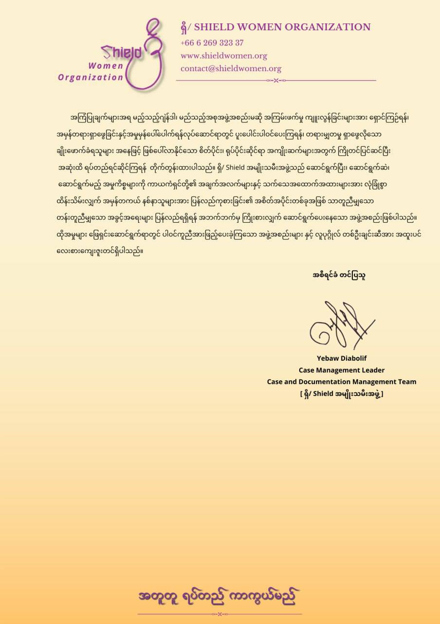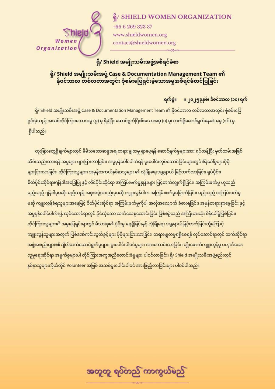 ရှိ/ Shield အမျိုးသမီးအဖွဲ့ အစီရင်ခံစာရှိ/ Shield အမျိုးသမီးအဖွဲ့ Case & Documentation Team မှ နိုဝင်ဘာလ တစ်လတာအတွင်း စုံစမ်းဖြေရှင်းခဲ့သော အမှုအစီရင်ခံတင်ပြခြင်း၁။ ၂၀၂၅ခုနှစ် နိုဝင်ဘာလ အတွက် အနှစ်ချုပ်အသစ်တိုင်ကြားသောအမှု - ၉ မှု ဆောင်ရွက်ပြီးစီးသောအမှု - ၁ မှု လက်ရှိဆောင်ရွက်နေဆဲအမှု - ၁၆ မှု အခြားမိတ်ဖက်အဖွဲ့အစည်းအား လွှဲပြောင်းခဲ့သောအမှု - မရှိမှတ်တမ်းအဖြစ်သာထားရှိသည့်အမှု/တိုင်ကြားသူဘက်မှ ရုတ်သိမ်းသွားသည့်အမှု-မရှိ တိုင်ကြားလာသည်ကိုအကြောင်းပြန်ရန် ကျန်ရှိသောအမှုများ - မရှိအဖွဲ့၏ စံနှုန်းနှင့် မကိုက်ညီ၍ ဆောင်ရွက်ခြင်းမပြုသောအမှု - မရှိတိုင်ကြားသူနှင့် ဆယ်သွယ်၍ မရသောအမှု - မရှိရပ်နားထားသောအမှု - မရှိ________________________________________၂။ ၂၀၂၅ခုနှစ် ဇန်နဝါရီလမှစ၍ အနှစ်ချုပ်စုစုပေါင်း တိုင်ကြားလာသောအမှု - ၇၁ မှု ဆောင်ရွက်ပြီးစီးသောအမှု - ၂၁ မှု လက်ရှိဆောင်ရွက်နေဆဲအမှု - ၁၈ မှု အခြားမိတ်ဖက်အဖွဲ့အစည်းအား လွှဲပြောင်းခဲ့သောအမှု - ၄ မှု မှတ်တမ်းအဖြစ်သာထားရှိသည့်အမှု/တိုင်ကြားသူဘက်မှ ရုတ်သိမ်းသွားသည့်အမှု - ၁၃ မှု အဖွဲ့၏ စံနှုန်းနှင့် မကိုက်ညီ၍ ဆောင်ရွက်ခြင်းမပြုသောအမှု - ၆ မှု တိုင်ကြားသူနှင့် ဆယ်သွယ်၍ မရသောအမှု - ၉ မှု တိုင်ကြားလာသည်ကိုအကြောင်းပြန်ရန် ကျန်ရှိသောအမှုများ - မရှိရပ်နားထားသောအမှု - မရှိ________________________________________၃။ အမှုများကို ခွဲခြမ်းစိတ်ဖြာခြင်းShield Women Organization အနေဖြင့် ၂၀၂၅ ခုနှစ် ဖေဖော်ဝါရီလမှစ၍ ယနေ့အထိ အမှုစုစုပေါင်း ၇၁ ခု ကို လက်ခံကိုင်တွယ် ကူညီဖြေရှင်းပေးခဲ့ရာတွင် အောက်ပါအတိုင်း သတ်မှတ်ခွဲခြား ထုတ်ဖော်နိုင်ခဲ့ပါသည်။အိမ်တွင်းအကြမ်းဖက်မှု (Domestic Violence) - ၂၀ မှု အိမ်တွင်းအကြမ်းဖက်မှုအောက်၌ ထပ်မံစီစစ်ရာတွင် ရုပ်ပိုင်းဆိုင်ရာ အကြမ်းဖက်မှု - ၁၈ မှု စိတ်ပိုင်းဆိုင်ရာ အကြမ်းဖက်မှု - ၂ မှုအွန်လိုင်းနည်းပညာဆိုင်ရာ အကြမ်းဖက်မှု - မရှိလိင်ပိုင်းဆိုင်ရာအကြမ်းဖက်မှု (Sexual Violence) - ၂၉ မှု လိင်ပိုင်းဆိုင်ရာအကြမ်းဖက်မှုအောက်၌ ထပ်မံစီစစ်ရာတွင် ရုပ်ပိုင်းဆိုင်ရာ အကြမ်းဖက်မှု - ၁၇ မှု စိတ်ပိုင်းဆိုင်ရာ အကြမ်းဖက်မှု - ၂ မှုအွန်လိုင်းနည်းပညာဆိုင်ရာ အကြမ်းဖက်မှု - ၁၀ မှုဂျဲန်ဒါအခြေပြုအကြမ်းဖက်မှု (Gender-based Violence) - ၁၅ မှု ဂျဲန်ဒါအခြေပြုအကြမ်းဖက်မှုအောက်၌ ထပ်မံစီစစ်ရာတွင် ရုပ်ပိုင်းဆိုင်ရာ အကြမ်းဖက်မှု - ၄ မှု စိတ်ပိုင်းဆိုင်ရာ အကြမ်းဖက်မှု - ၅ မှု အွန်လိုင်းနည်းပညာဆိုင်ရာ အကြမ်းဖက်မှု - ၆ မှုလူမှုရေးဖောက်ပြန်မှု (Social deviance) - ၁မှု အဖွဲ့၏ မူဝါဒများနှင့် မကိုက်ညီသဖြင့် လက်ခံဆောင်ရွက်ခြင်း မပြုသော အမှု - ၆ မှု ________________________________________၄။နိုဝင်ဘာလတစ်လတာအတွင်း ဆောင်ရွက်ပြီးစီးသောအမှုအကျဉ်းချုပ် - ၁ မှု***(၁) အမှုနံပါတ် - Case-0062*** အမှုခ