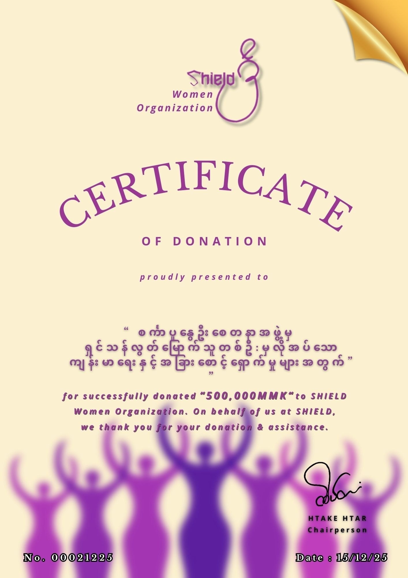 ရှိ/ Shield အမျိုးသမီးအဖွဲ့ ငွေစာရင်းရှင်းတမ်း ရက်စွဲ : ၂၆ ဇန်နဝါရီလ ၂၀၂၅။