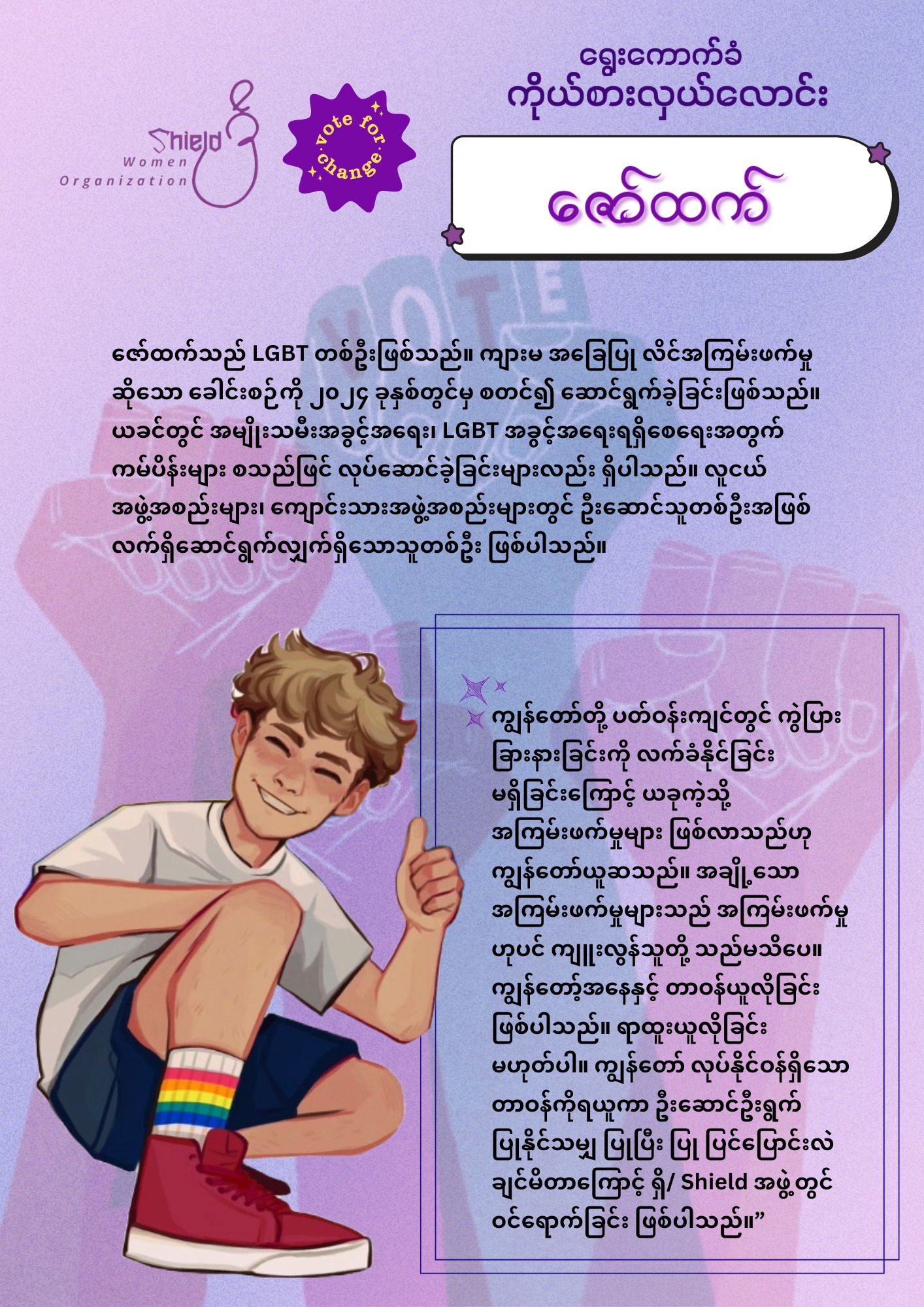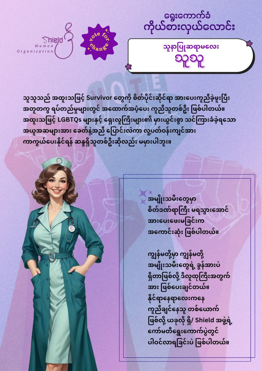 ရှိ/ Shield’အဖွဲ့၏ အမှုဆောင်စီမံခန့်ခွဲမှုအဖွဲ့ (Executive Member Team) ဝင် ဉက္ကဌနှင့် ဒုဉက္ကဌ ရာထူးအား ရွေးကောက်ပွဲရလာဒ်ဖြင့်ဆုံးဖြတ်မည်ဖြစ်ကြောင်း အသိပေးကြေညာခြင်း။ ရှိ/ Shield အဖွဲ့အား အဖွဲ့ပူးတွဲတည်ထောင်သူ ၃ ဦးဖြင့် ကနဦး ဖွဲ့စည်းထားခဲ့ပြီး၊ ရှိ/ Shield ၏ ဖွဲ့စည်းပုံအရ အမှုဆောင်စီမံခန့်ခွဲမှုအဖွဲ့ (Executive Member Team) အား ပူးတွဲတည်ထောင်သူများအပါအဝင် (၂) နှစ်တာ သက်တမ်းရှိမည့် ဥက္ကဌ၊ ဒုတိယဥက္ကဌ နှစ်ဦးဖြင့် ဖွဲ့စည်းသွားမည် ဖြစ်သည်။ သို့ပါ၍ ထို ဥက္ကဌနှင့် ဒုတိယဥက္ကဌ ရာထူးများကို ရွေးကောက်ရွေးချယ်ရန် ၂၀၂၅ ခုနှစ် ဖေဖော်ဝါရီ ၁၇ ရက်နေ့တွင် ရှိ/ Shield ၏ အဖွဲ့ဝင်များအားလုံးပါဝင် မဲပေးရွေးချယ်ခွင့်ရှိသော ပွင့်လင်းမြင်သာသည့် ရွေးကောက်ပွဲတစ်ရပ်အား ကျင်းပသွားမည် ဖြစ်ပါသည်။ ဥက္ကဌနှင့် ဒုတိယဥက္ကဌ အဖြစ် အရွေးချယ်ခံရန် ဖိတ်ခေါ်ခြင်းလုပ်ငန်းကို တရားဝင်ဖိတ်ကြားခဲ့ရာ စုစုပေါင်းကိုယ်စားလှယ် (၁၁) ဦးလျှောက်ထားခဲ့ကြပါသည်။ ရွေးကောက်ပွဲဖြစ်မြောက်ရေး ကော်မတီအနေဖြင့် သတ်မှတ်ထားသော စည်းကမ်းချက်များနှင့်အညီ ပြန်လည်စိစစ်ရွေးချယ်ခဲ့ရာ ကိုယ်စားလှယ်လောင်း (၉) ဦးကို ရွေးချယ်နိုင်ခဲ့ပါသည်။ ယင်းကိုယ်စားလှယ်လောင်းများ၏ အမည်နှင့် မြန်မာပြည်အရေး လှုပ်ရှားဆောင်ရွက်ခဲ့မှုနောက်ခံအခြေအနေအကျဥ်းချုပ်များအား ပုံတစ်ပုံချင်းစီတွင် လေ့လာနိုင်ပါသည်။ [လုံခြုံရေးအခြေအနေကြောင့် Pseudonym များဖြင့်သာ ဖော်ပြထားပါသည်။]ပွင့်လင်းမြင်သာသော ရွေးကောက်ပွဲတွင် ယခုလက်ရှိ ကိုယ်စားလှယ်လောင်း (၉) ဦးထဲမှ ဥက္ကဌနှင့် ဒုတိယဥက္ကဌ ကို အဖွဲ့ဝင် (မန်ဘာဝင်) ထားသူများသာ မဲပေးရွေးချယ်ခွင့် ရရှိမည်ဖြစ်ပြီး မဲရလဒ်များကို ဖော်ပြပါ ဖေဖော်ဝါရီ ၁၇ ရက်နေ့တွင် တခါတည်း ထုတ်ပြန်ကြောညာသွားပါမည်။ ထို့အပြင် ရှိ/ Shield အဖွဲ့၏ အမှုဆောင်စီမံခန့်ခွဲမှုအဖွဲ့ (Executive Member Team) များအားလည်း တခါတည်း ကြေညာမိတ်ဆက်သွားမည် ဖြစ်သည်။ ဆက်လက်ဆောင်ရွက်မည့် လုပ်ငန်စဉ်များနှင့် ဦးဆောင်ကော်မတီ အောင်မြင်စွာ ဖွဲ့စည်းနိုင်ရေး၊ ပွင့်လင်းမြင်သာသည့် မဲစနစ်ဖြစ်ပေါ်လာရေးအတွက် ဖြစ်မြောက်ရေးကော်မတီမှ ဆောင်ရွက်လျှက်ရှိပါသည်။ရှိ/ Shield အဖွဲ့၏ အနာဂတ်မျှော်ရည်ချက်၊ လုပ်ငန်းတာဝန်၊ စံတန်ဖိုးနှင့် ရည်ရွယ်ချက်များကို အောက်ပါလင့်ခ်တွင် သွားရောက်ဖတ်ရှုလေ့လာနိုင်ပါသည်။