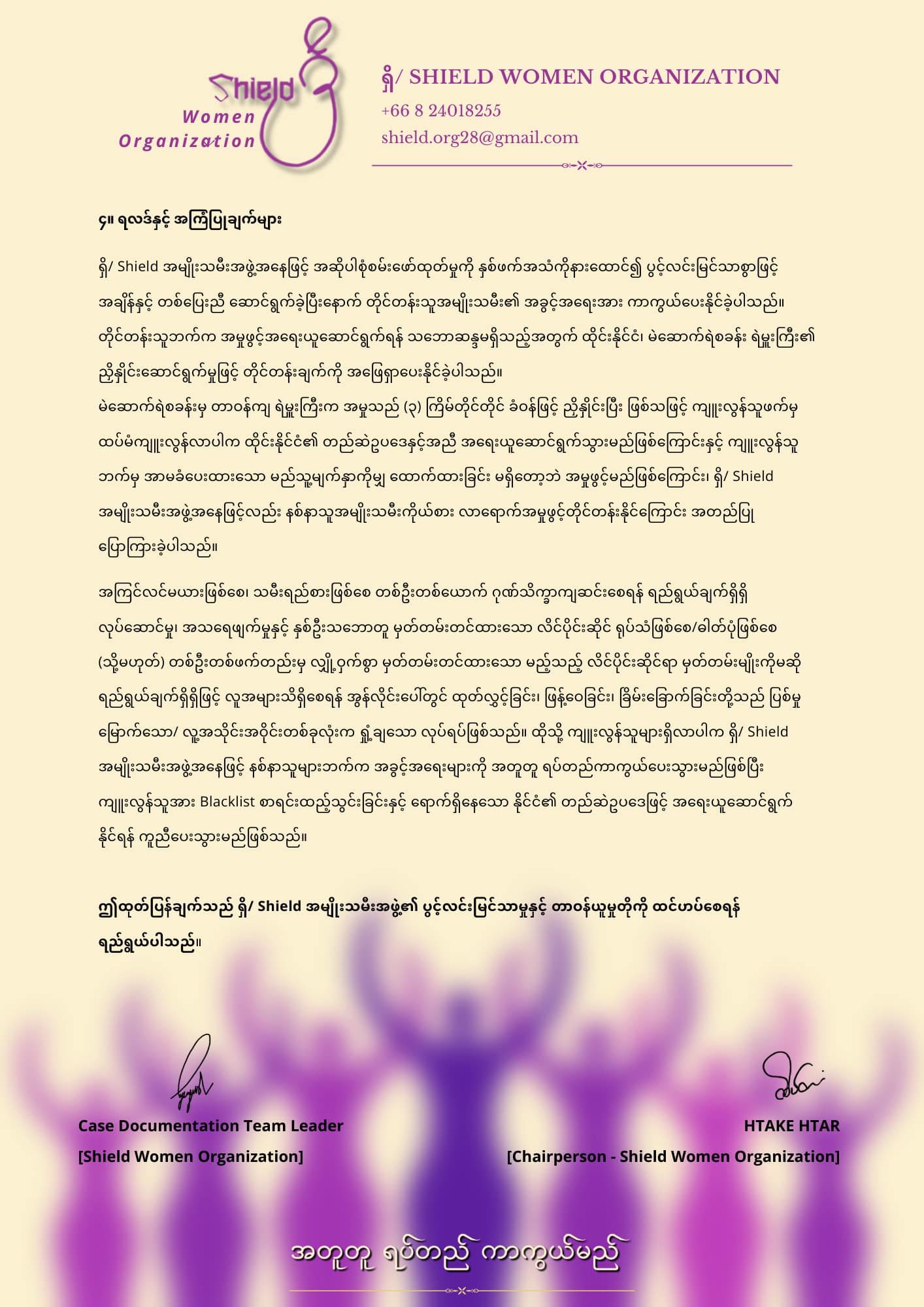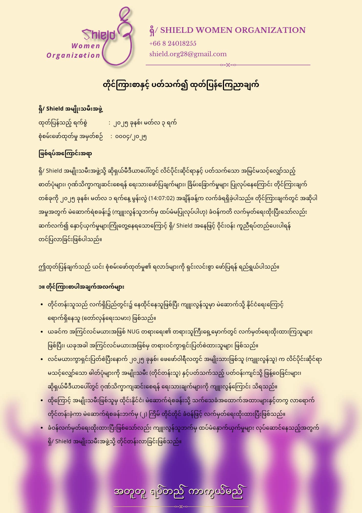 ရှိ/ Shield အမျိုးသမီးအဖွဲ့ထုတ်ပြန်သည့် ရက်စွဲ : ၂၀၂၅ ခုနစ်၊ မတ်လ ၂ ရက်စုံစမ်းဖော်ထုတ်မှု အမှတ်စဉ် : ၀၀၀၄/၂၀၂၅ဖြစ်ရပ်အကြောင်းအရာရှိ/ Shield အမျိုးသမီးအဖွဲ့သို့ Social Media ပေါ်တွင် လိင်ပိုင်းဆိုင်ရာနှင့် ပတ်သက်သော အမြင်မသင့်လျှော်သည့် ဓာတ်ပုံများ၊ ဂုဏ်သိက္ခာကျဆင်းစေရန် ရေးသားဖော်ပြချက်များ၊ ခြိမ်းခြောက်မှုများ ပြုလုပ်နေကြောင်း တိုင်ကြားချက်တစ်ခုကို ၂၀၂၅ ခုနစ်၊ မတ်လ ၁ ရက်နေ့ မွန်းလွဲ (14:07:02) အချိန်ခန့်က လက်ခံရရှိခဲ့ပါသည်။ တိုင်ကြားချက်တွင် အဆိုပါ အမှုအတွက်မဲဆောက်ရဲစခန်း၌ (ကျူးလွန်သူဘက်မှ ထပ်မံမပြုလုပ်ပါဟု) ခံဝန်ကတိ လက်မှတ်ရေးထိုးပြီးသော်လည်း ဆက်လက်၍ နှောင့်ယှက်မှုများကြုံတွေ့နေရသောကြောင့် ရှိ/Shield အနေဖြင့် ဝိုင်းဝန်း ကူညီရပ်တည်ပေးပါရန်တင်ပြလာခြင်းဖြစ်ပါသည်။ဤထုတ်ပြန်ချက်သည် ယင်း စုံစမ်းဖော်ထုတ်မှု၏ ရလဒ်များကို ရှင်းလင်းစွာ ဖော်ပြရန် ရည်ရွယ်ပါသည်။ ရှိ/Shield အဖြစ် တိုင်တန်းလာသူများ၏ နစ်နာမှုများကို အခြေအနေပေါ်မူတည် စုံစမ်းကူညီမှုများကို လုပ်ဆောင်ပေးနေပြီဖြစ်သည့်အတွက် မိမိတို့၏ အမှန်တရားအတွက် ဝိုင်းဝန်းအဖြေရှာပေးရန် အကူအညီလိုအပ်သူများကို ဖေးမကူညီရန် အသင့်ရှိနေပါသည်။တိုင်တန်းလိုသူများအနေဖြင့် အောက်ပါလင့်တွင် ဝင်ရောက်စာရင်းတင်သွင်းတိုင်ကြားနိုင်ပါသည်။