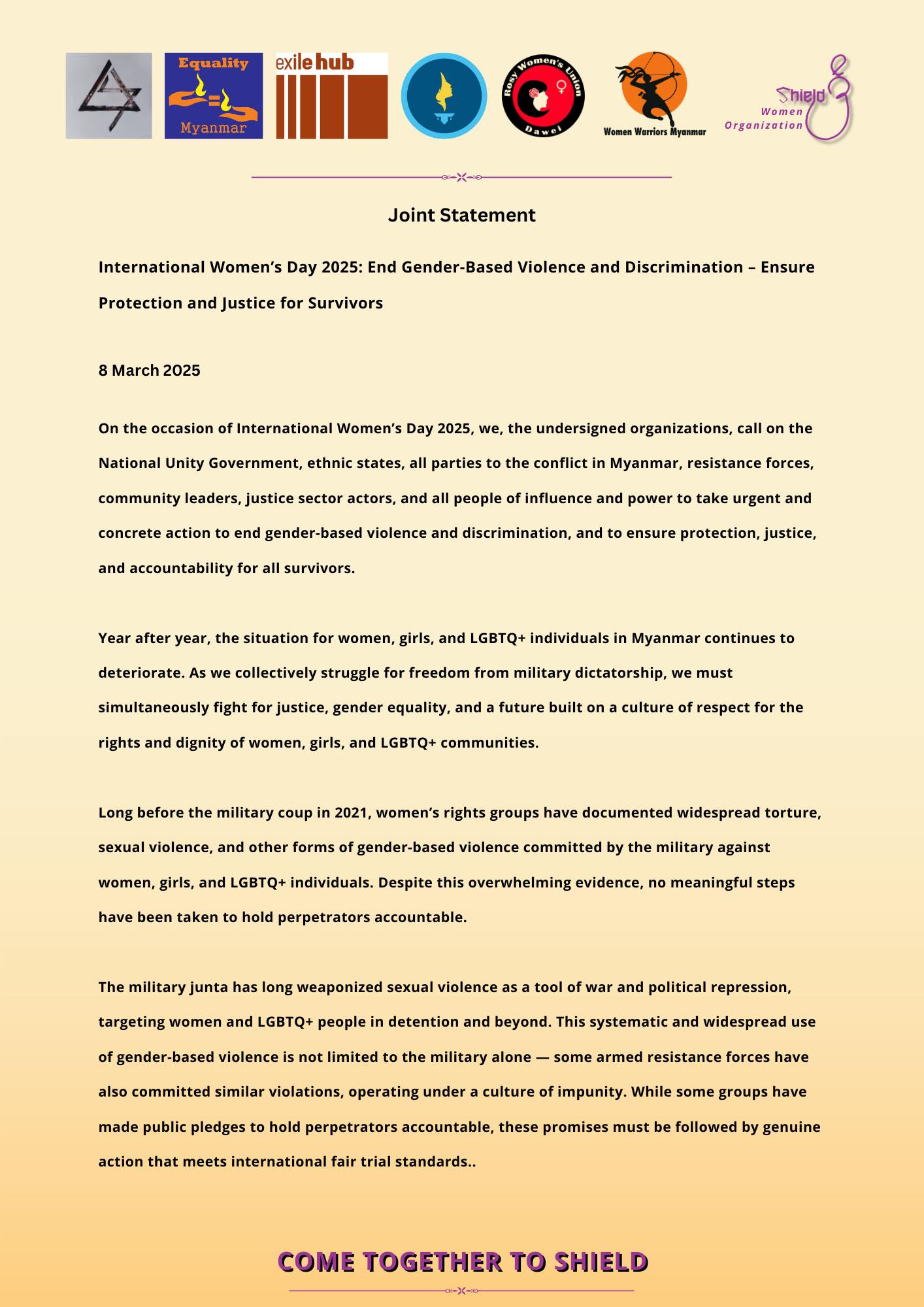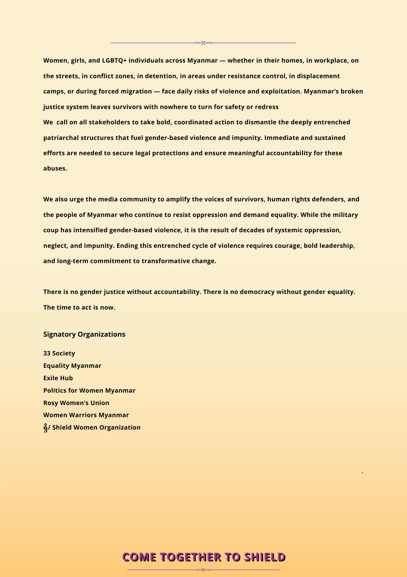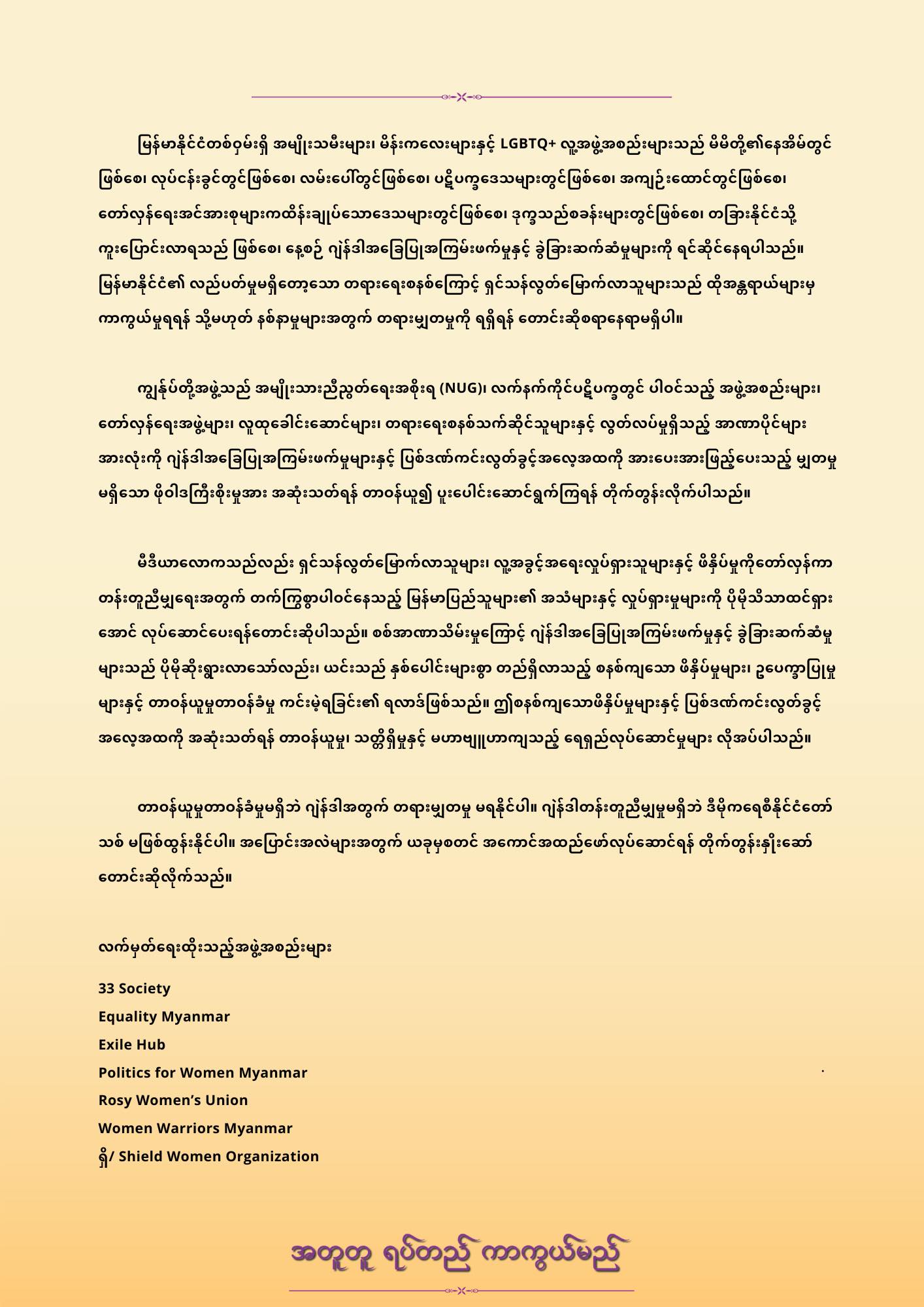 ၂၀၂၅ ခုနှစ်၊ မတ်လ (၈)ရက် ယနေ့ကျရောက်သော အပြည်ပြည်ဆိုင်ရာ အမျိုးသမီးများအထိမ်းအမှတ်နေ့တွင် မြန်မာနိုင်ငံရှိ ဂျဲန်ဒါအခြေပြုအကြမ်းဖက်မှုများနှင့် ခွဲခြားဆက်ဆံမှုများ ပပျောက်စေရန် ကျွန်ုပ်တို့အတူတကွ ရပ်တည်လျှက််ရှိသည်။