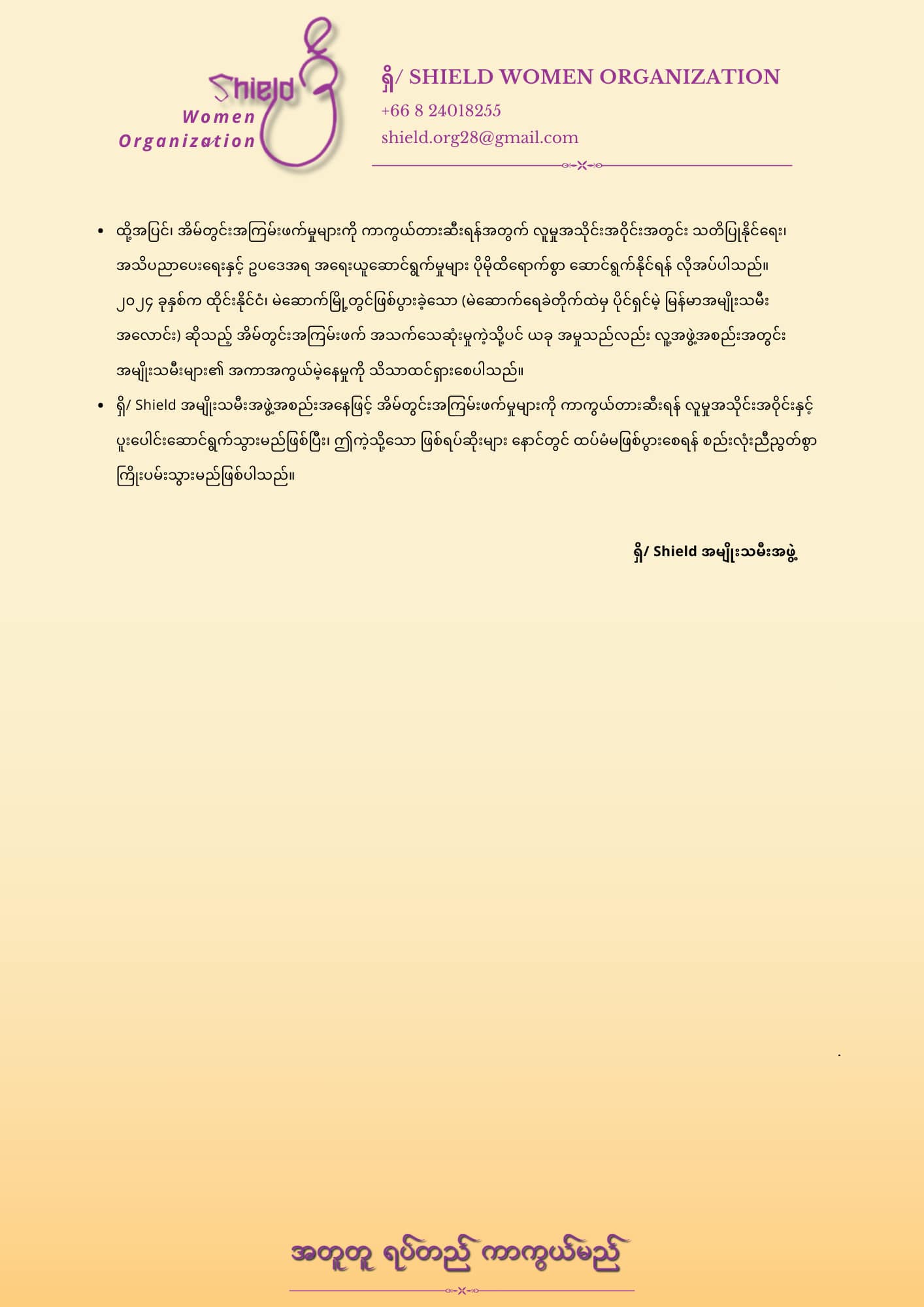 ရှိ/ Shield အမျိုးသမီးအဖွဲ့၏ သဘောထားထုတ်ပြန်ချက်