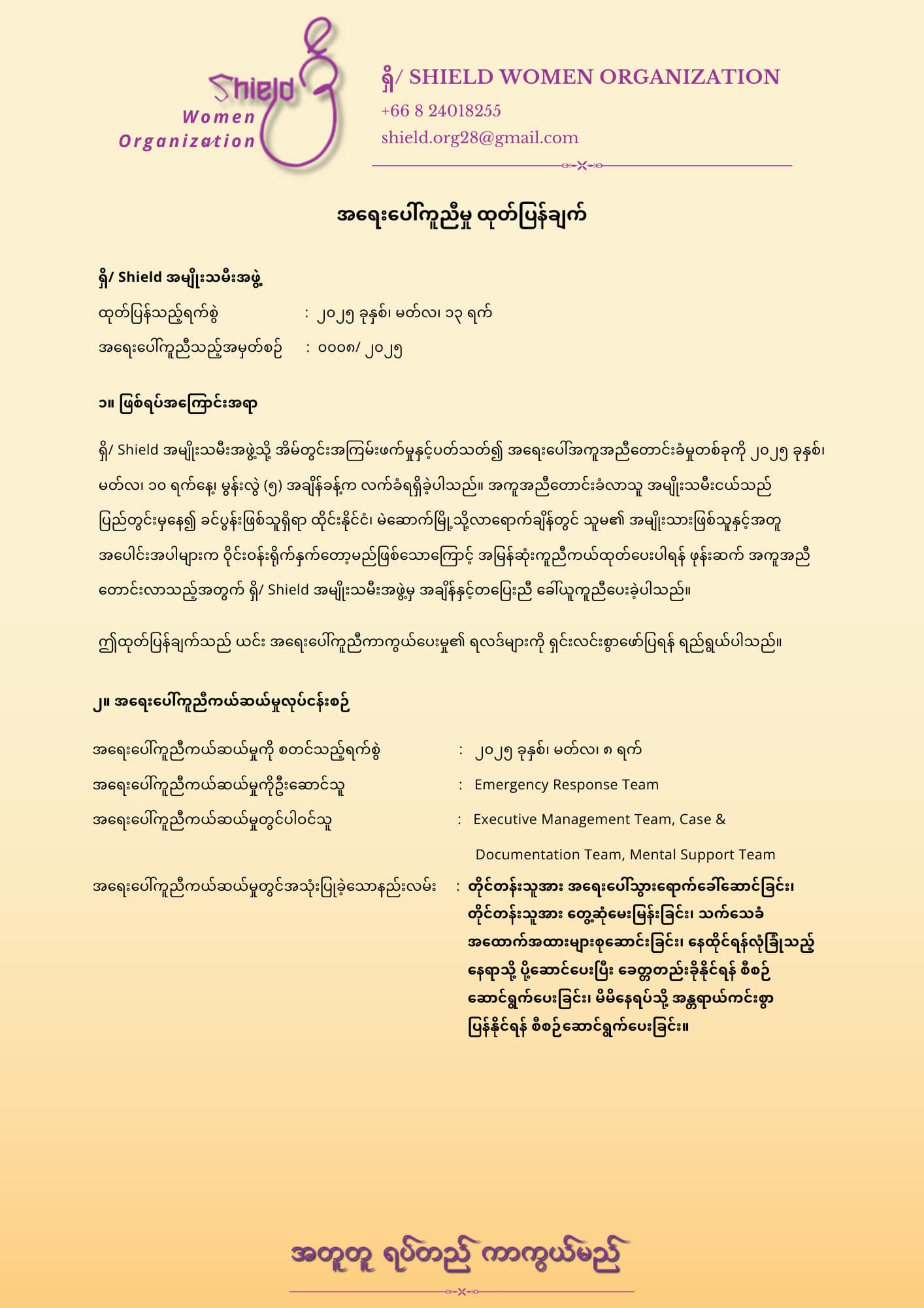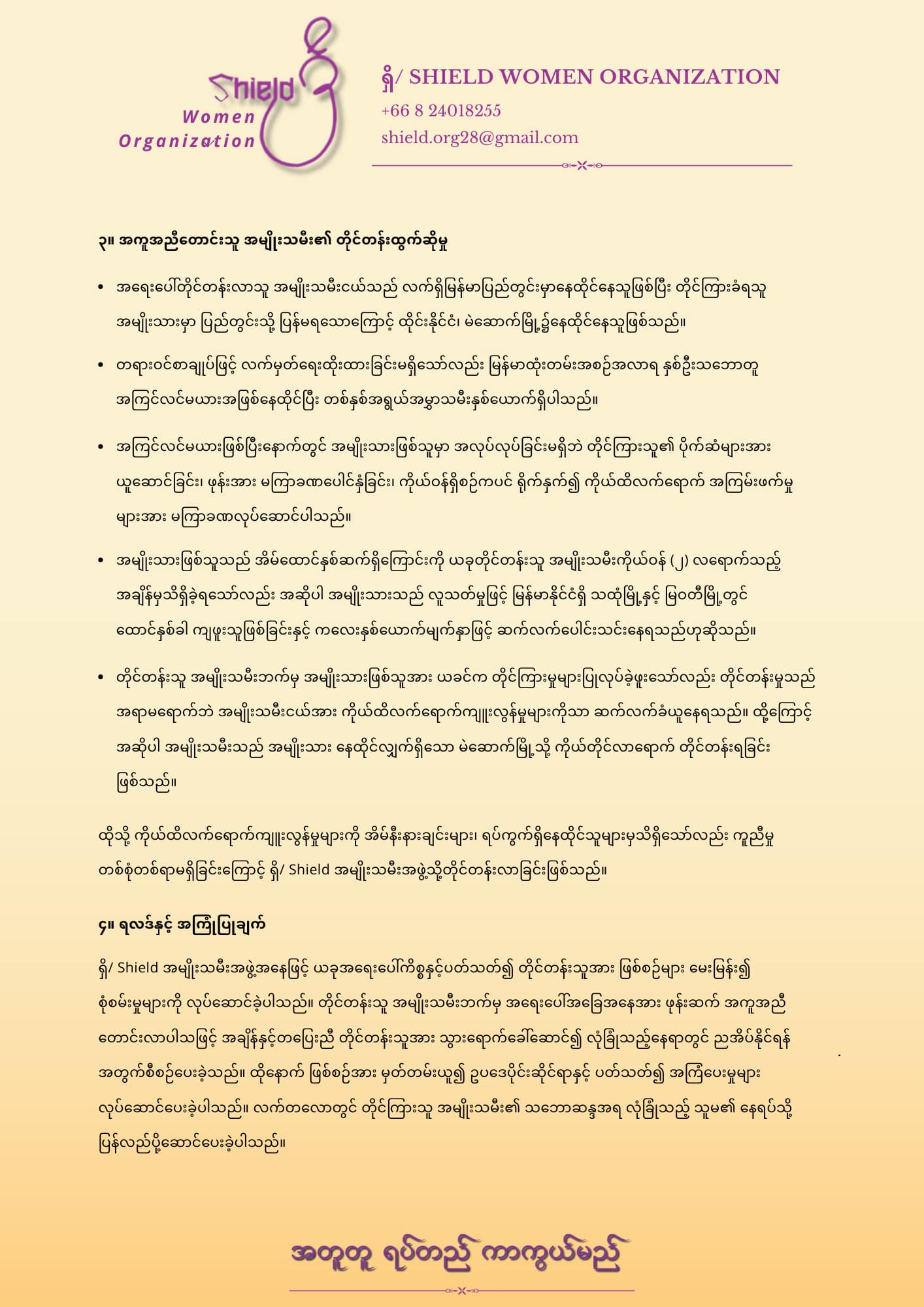 “အရေးပေါ်ကူညီမှု ထုတ်ပြန်ကြေညာချက်”ရှိ/ Shield အမျိုးသမီးအဖွဲ့ထုတ်ပြန်သည့် ရက်စွဲ : ၂၀၂၅ ခုနစ်၊ မတ်လ၊ ၁၃ ရက်စုံစမ်းဖော်ထုတ်မှု အမှတ်စဉ် : ၀၀၀၈/၂၀၂၅ဖြစ်ရပ်အကြောင်းအရာရှိ/ Shield အမျိုးသမီးအဖွဲ့သို့ အိမ်တွင်းအကြမ်းဖက်မှုနှင့်ပတ်သတ်၍ အရေးပေါ်အကူအညီတောင်းခံမှုတစ်ခုကို ၂၀၂၅ ခုနှစ်၊ မတ်လ၊ ၁၀ ရက်နေ့၊ မွန်းလွဲ (၅)နာရီ အချိန်ခန့်က လက်ခံရရှိခဲ့ပါသည်။ တိုင်ကြားချက်အရ မဲဆောက်မြို့တွင် အိမ်တွင်းအကြမ်းဖက်မှုခံနေရသော အမျိုးသမီးတစ်ဦးအား အရေးပေါ်ကူညီကယ်ဆယ်ပြီး လုံခြုံဘေးကင်းရာနေရပ်သို့ ပြန်လည်ပို့ပေးခြင်းအထိ စီစဉ်ပေးနိုင်ခဲ့ပါသည်။အဆိုပါ နစ်နာသူဘက်မှလည်း အမှုဖွင့်တိုင်ကြားရန် အဆင်သင့်အနေအထားသို့ရောက်ရှိသဖြင့် ရှိ/ Shield အမျိုးသမီးအဖွဲ့သို့ ထပ်မံဆက်သွယ်ခဲ့မည်ဆိုပါလျှင်လည်း ထိုင်းနိုင်ငံ မဲဆောက်ရဲစခန်းတွင် ကျူးလွန်သူအား အမှုဖွင့်တိုင်ကြားကာ ထိုင်းနိုင်ငံ၏ တရားဥပဒေနှင့်အညီ အရေးယူဆောင်ရွက်နိုင်ရန် လိုက်ပါကူညီသွားမည် ဖြစ်ပါသည်။ရှိ/Shield အမျိုးသမီးအဖွဲ့သည် တိုင်တန်းလာသူများ၏ နစ်နာမှုများကို အခြေအနေပေါ်မူတည်၍ စုံစမ်းကူညီမှုများကို လုပ်ဆောင်ပေးနေပြီဖြစ်သည့်အတွက် မိမိတို့၏ အမှန်တရားအတွက် ဝိုင်းဝန်းအဖြေရှာပေးရန် အကူအညီလိုအပ်သူများကို ဖေးမကူညီရန် အသင့်ရှိနေပါသည်။တိုင်တန်းလိုသူများအနေဖြင့် အောက်ပါလင့်တွင် ဝင်ရောက်စာရင်းတင်သွင်းတိုင်ကြားနိုင်ပါသည်။