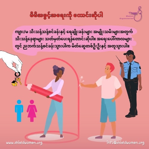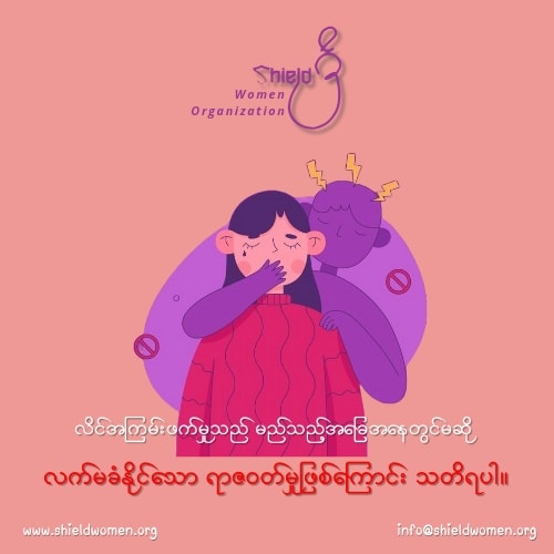 " အမျိုးသမီးများအတွက် အရေးပေါ်အခြေအနေများတွင် ဂရုပြုစရာများ "အရေးပေါ်အခြေအနေများတွင် အမျိုးသမီးများ မိမိကိုယ်ကိုယ်ကာကွယ် နေထိုင်ကြဖို့ တိုက်တွန်းပါရစေ။ အထူးသဖြင့် ဥပဒေအကာအကွယ် မရယူနိုင်တဲ့ အခြေအနေတွေမှာ မိမိကိုယ်ကိုယ် ကာကွယ်ခြင်းသည်သာ အကောင်းဆုံးသော ဖြေရှင်းနည်းဖြစ်ပါတယ်။အမျိုးသမီးလေးတွေအနေနဲ့ အရေးပေါ်အခြေအနေတွေမှာ ဂရုပြုရမယ့် ဆောင်ရန်၊ ရှောင်ရန်လေးများကို မျှဝေပေးပါရစေ။လိင်အကြမ်းဖက်မှုသည် မည်သည့်အခြေအနေတွင်မဆို လက်မခံနိုင်သော ရာဇဝတ်မှုဖြစ်ကြောင်း သတိရပါ။