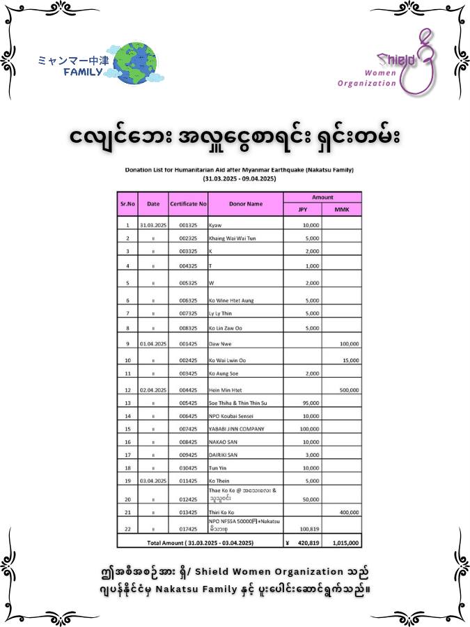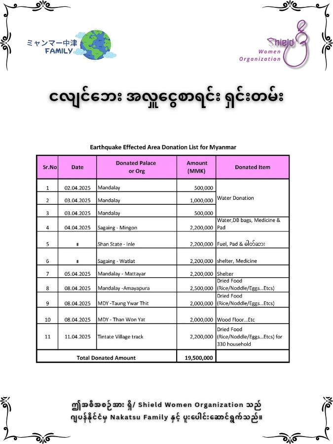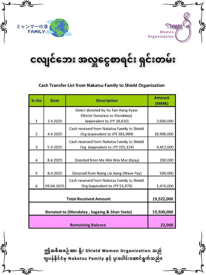 "Nakatsu မိသားစုနှင့် Shield Women Organization တို့၏ ငလျင်ဘေးသင့် ပြည်သူများအား ကူညီထောက်ပံ့မှုဆိုင်ရာ ရှင်းလင်းချက်" • ဧပြီလ ၄ရက်၊ ၂၀၂၅ မှ ဧပြီလ ၁၁ရက်၊ ၂၀၂၅အထိ အလှုငွေစာရင်း ရှင်းတမ်းမြန်မာပြည်သူများ ကြုံတွေ့ခံစားခဲ့ရသည့် ငလျင်ဘေးဒဏ်အတွက် ဂျပန်နိုင်ငံမှ Nakatsu မိသားစုနှင့် Shield Women Organization တို့၏ ဖေးမကူညီသည့်အစီအစဥ်အဖြစ် ငလျင်ဘေး အရေးပေါ်ကူညီကယ်ဆယ်ရေး အစီအစဉ်ကို ၂၀၂၅ ခုနှစ် ဧပြီလ ၃ ရက်နေ့တွင် စတင်လုပ်ဆောင်ခဲ့ပါသည်။Shield Women Organization သည် ဂျပန်နိုင်ငံ Nakatsu မိသားစုထံမှ မြန်မာငွေကျပ် ၁၆,၈၂၂,၀၀၀ ကျပ် (တစ်ရာ ခြောက်ဆယ့် ရှစ်သိန်း နှစ်သောင်း နှစ်ထောင် ကျပ်တိတိ) နှင့်ညီမျှသည့် JPY 588,589 (ငါးသိန်း ရှစ်သောင်း ရှစ်ထောင့် ငါးရာ ရှစ်ဆယ့်ကိုး ယန်းတိတိ) နှင့်အတူ မြန်မာငွေ ၂,၇၀၀,၀၀၀ ကျပ် (နှစ်ဆယ့်ခုနှစ်သိန်း ကျပ်တိတိ)၊ စုစုပေါင်း ၁၉,၅၂၂,၀၀၀ ကျပ် (တစ်ရာ ကိုးဆယ့် ငါးသိန်း နှစ်သောင်း နှစ်ထောင် ကျပ်တိတိ) ကိုလက်ခံရရှိခဲ့ပြီး Shield Women Organization ထံသို့ အလှူရှင်များလာရောက်လှူဒါန်ငွေမှာ မြန်မာငွေ ၁,၉၇၀,၀၀၀ ကျပ် (ဆယ်ကိုးသိန်း ခုနစ်သောင်း ကျပ်တိတိ) နှင့်ညီမျှသည့် 15,000 THB နှင့် မြန်မာငွေ ၁,၀၀၀,၀၀၀ ကျပ် (ဆယ်သိန်း ကျပ်တိတိ) တို့ကိုလက်ခံရရှိခဲ့ပါသည်။ ထိုကြောင့် Nakatsu မိသားစုနှင့် Shield Women Organization တို့၏ ငလျင်ဘေးအရေးပေါ်ကူညီကယ်ဆယ်ရေးအစီအစဉ်မှ စုစုပေါင်းအလှူငွေ ၂၂,၄၉၂,၀၀၀ ကျပ် (နှစ်ရာ နှစ်ဆယ့် လေးသိန်း ကိုးသောင်း နှစ်ထောင် ကျပ်တိတိ) ကိုရရှိခဲ့ပါသည်။ ၂၀၂၅ ခုနှစ်၊ ဧပြီလ ၄ ရက်မှ ၁၁ ရက်အထိ ငလျင်ဘေးသင့် ပြည်သူများအား Nakatsu မိသားစုနှင့် Shield Women Organization တို့မှ ပံ့ပိုးကူညီခဲ့သည့် အလှူငွေနှင့် လုပ်ငန်းဆောင်ရွက်မှုများအား ရှင်းလင်းတင်ပြခြင်း။၁။ အလှူငွေစုစုပေါင်းNakatsu မိသားစုနှင့် Shield Women Organization တို့မှ စုပေါင်းလှူဒါန်းခဲ့သည့် ငွေကြေးပမာဏမှာ ကျပ် ၂၂,၄၉၂,၀၀၀ (နှစ်ရာနှစ်ဆယ့်လေးသိန်း ကိုးသောင်းနှစ်ထောင်ကျပ်တိတိ) ဖြစ်ပြီး၊ ၎င်းအနက် ကျပ် ၂၂,၄၇၀,၀၀၀ (နှစ်ရာနှစ်ဆယ့်လေးသိန်း ခုနှစ်သောင်း ကျပ်တိတိ) ကို ငလျင်ဘေးသင့် ဒေသများသို့ ပံ့ပိုးပေးခဲ့ကာ၊ ကျပ် ၂၂,၀၀၀ (နှစ်သောင်းနှစ်ထောင်ကျပ်တိတိ) ကျန်ရှိပါသည်။၂။ ကူညီထောက်ပံ့မှုအသေးစိတ်ဧပြီလ ၄ ရက်မှ ၁၁ ရက်အတွင်း အောက်ပါဒေသများသို့ အရေးပေါ်လိုအပ်ချက်များကို ပံ့ပိုးခဲ့ပါသည်။ - (၄.၄.၂၀၂၅)ရက်တွင် စစ်ကိုင်းတိုင်း၊ မင်းကွန်းမြို့နှင့် မင်းကွန်းမြို့နယ်၊ ရေကားရွာတို့ထံသို့ ရေ၊ဆေးဝါး၊အမျိုးသမီးလစဥ်သုံးနှင့် ခြင်ဆေး (၂၂) သိန်းကျပ်၊- (၅.၄.၂၀၂၅) ရက်တွင် မန္တလေးတိုင်း၊ မတ္တရာမြို့နယ်ရှိ ငလျင်ဘေးသင့်ပြည်သူများသို့ အမိုးအကာအလှူ (၂၂) သိန်းကျပ်၊- (၇.၄.၂၀၂၅) ရက်တွင် ရှမ်းပြည်နယ်၊ အင်းလေးဒေသ၊ ဟဲယားရွာမရှိ အိမ်ခြေတစ်ထောင်ကျော်နှင့် အနီးပတ်ဝန်းကျ