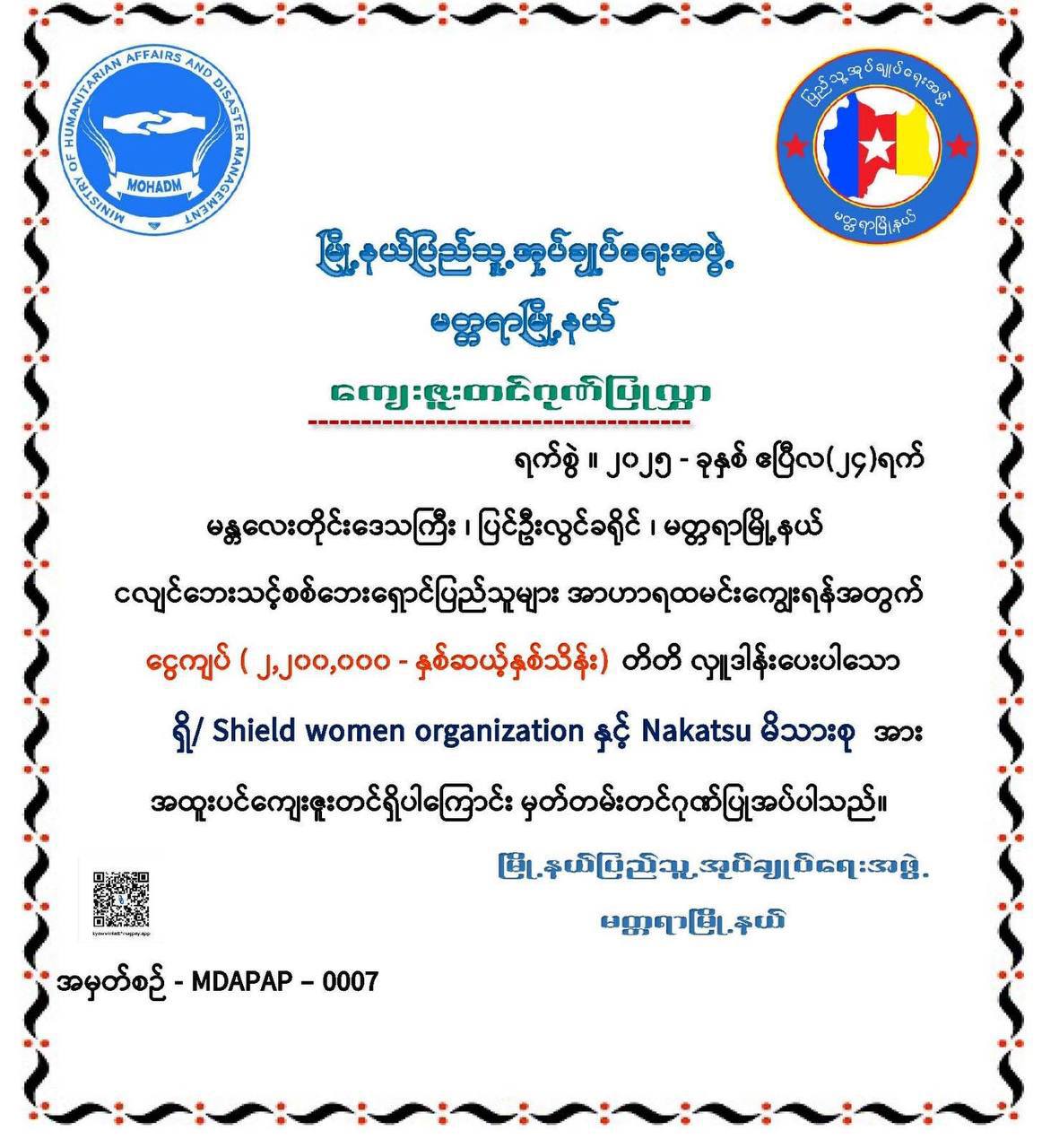 " မတ္တရာမြို့ရှိ စစ်ရှောင်စခန်း (၃) နေရာမှ ငလျင်ဒဏ်သင့် စစ်ရှောင်ဦးရေ (၇၀၀) ဦးအား အသားဟင်းတစ်နပ်စာ လှူဒါန်းပေးခဲ့ " ရှိ/ Shield Women Organization နှင့် Nakatsu မိသားစုတို့၏ ပူးပေါင်းဆောင်ရွက်မှုဖြင့် မြန်မာနိုင်ငံမှ ငလျင်ဒဏ်သင့် ပြည်သူများအား ကူညီဖေးမမည့် အစီအစဉ်မှ မတ္တရာမြို့ရှိ စစ်ရှောင်စခန်း (၃) နေရာမှ ငလျင်ဒဏ်ခံစားခဲ့ရသော မိဘပြည်သူများအတွက် အာဟာရဒါနအနေဖြင့် မြန်မာငွေကျပ် (၂၂) သိန်းကျပ် အသုံးပြုကာ ဧပြီလ ၂၃ ရက်၊ ၂၀၂၅ တွင် စစ်ရှောင်ဦးရေ (၇၀၀) ဦးအား အသားဟင်းဖြင့် အာဟာရဒါန လှူဒါန်းပေးခဲ့ပါတယ်။ရှိ/ Shield Women Organization နှင့် Nakatsu မိသားစုမှတဆင့် လှူဒါန်းကူညီပေးခဲ့သော အလှူရှင်များနှင့် ရှိ/ Shield အဖွဲ့ကိုယ်စား တာဝန်ခံလှူဒါန်းပေးသော Emergency Management Committee, Mandalay အားလည်း မိဘပြည်သူများကိုယ်စား အထူးကျေးဇူးတင်ရှိကြောင်း ယခု Post မှ မှတ်တမ်းတင်ဂုဏ်ပြုလိုက်ပါရစေ။
