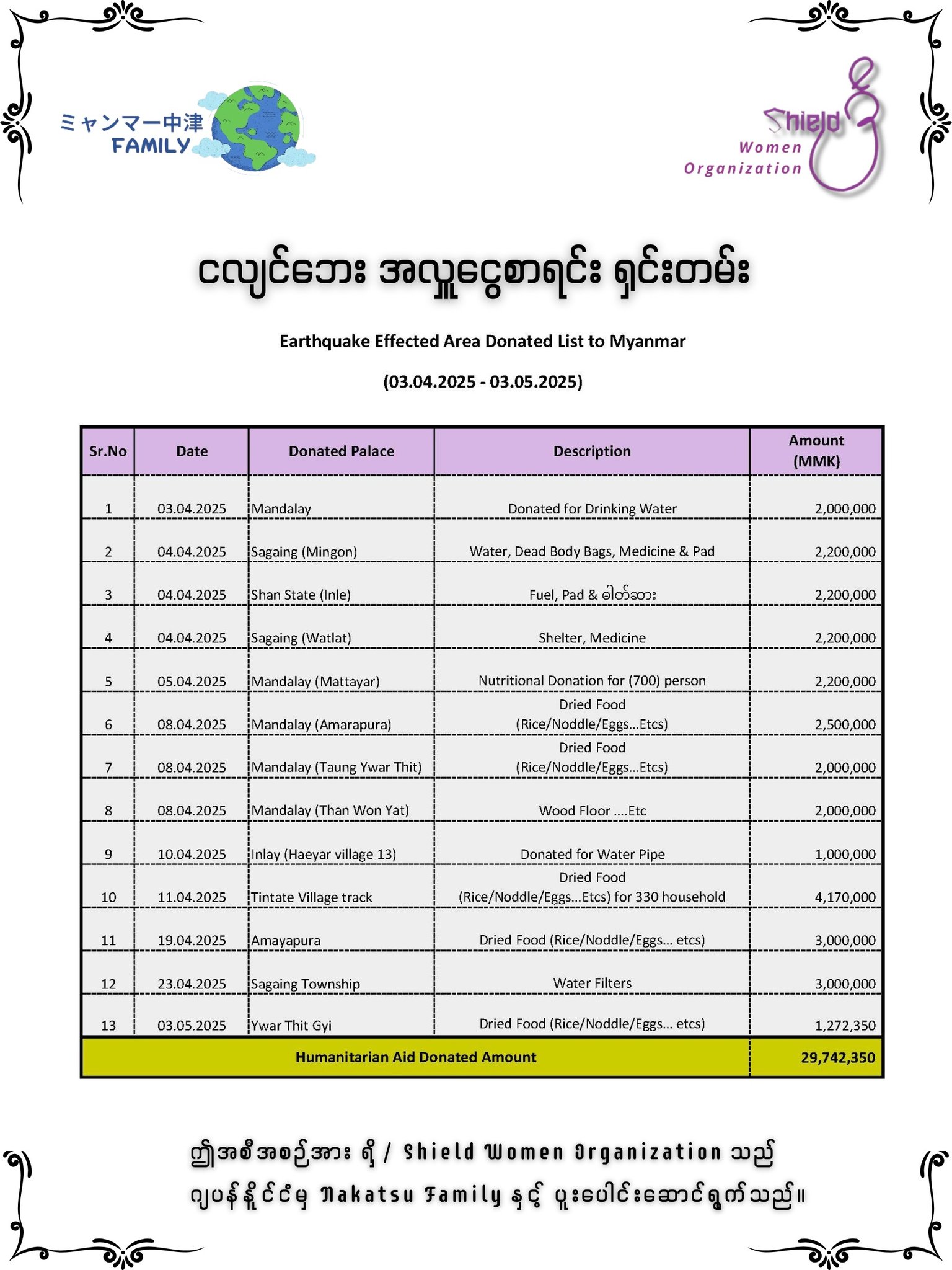 "Nakatsu မိသားစုနှင့် Shield Women Organization တို့၏ ငလျင်ဘေးသင့် ပြည်သူများအား ကူညီထောက်ပံ့မှုဆိုင်ရာ ငွေစာရင်းရှင်းတမ်းနှင့် အစီအစဉ် ရပ်နားကြောင်း အသိပေးချက်"၂၀၂၅ ခုနှစ် မေလ ၁၆ ရက်Nakatsu မိသားစုနှင့် Shield Women Organization တို့၏ ငလျင်ဘေးအရေးပေါ်ကူညီကယ်ဆယ်ရေးအစီအစဉ်မှ စုစုပေါင်းအလှူငွေ ၂၉,၇၄၂,၃၅၀ ကျပ် (နှစ်ရာ ကိုးဆယ့် ခုနစ်သိန်း လေးသောင်း နှစ်ထောင် သုံးရာ့ ငါးဆယ်ကျပ်တိတိ) ကို ရရှိ လှူဒါန်းနိုင်ခဲ့ပါသည်။၂၀၂၅၊ ဧပြီလတွင် မြန်မာပြည်သူများ ကြုံတွေ့ခံစားခဲ့ရသည့် ငလျင်ဘေးဒဏ်အတွက် ဂျပန်နိုင်ငံမှ Nakatsu မိသားစုနှင့် Shield Women Organization တို့ပူးပေါင်းဆောက်ရွက်သည့် "ငလျင်ဘေး အရေးပေါ် ကူညီကယ်ဆယ်ရေး အစီအစဉ်” ကို ၂၀၂၅ ခုနှစ်၊ ဧပြီလ ၂ ရက်နေ့တွင် စတင်လုပ်ဆောင်ခဲ့ပြီး မေလ ၃ ရက်နေ့တွင် ရပ်နားလိုက်ပြီဖြစ်ကြောင်း အသိပေးကြေညာအပ်ပါသည်။Shield Women Organization သည် ဂျပန်နိုင်ငံ Nakatsu မိသားစုထံမှ မြန်မာငွေကျပ် ၁၈,၃၆၇,၀၀၀ ကျပ် (တစ်ရာ ရှစ်ဆယ့် သုံးသိန်း ခြောက်သောင်း ခုနှစ်ထောင် ကျပ်တိတိ) နှင့် ညီမျှသည့် JPY 647,272 (ခြောက်သိန်း လေးသောင်း ခုနှစ်ထောင့် နှစ်ရာ ခုနှစ်ဆယ့် နှစ်ယန်းတိတိ) နှင့်အတူ မြန်မာငွေ ၃,၂၁၅,၀၀၀ ကျပ် (သုံးဆယ့် နှစ်သိန်း တစ်သောင်း ငါးထောင်ကျပ်တိတိ)၊ စုစုပေါင်း ၂၁,၅၈၂,၀၀၀ ကျပ် (နှစ်ရာ တစ်ဆယ့် ငါးသိန်း ရှစ်သောင်း နှစ်ထောင် ကျပ်တိတိ) ကိုလက်ခံရရှိခဲ့ပြီး Shield Women Organization ထံသို့ အလှူရှင်များလာရောက်လှူဒါန်:ငွေမှာ မြန်မာငွေ ၈,၁၆၀,၃၅၀ ကျပ် (ရှစ်ဆယ့် တစ်သိန်း ခြောက်သောင်း သုံးရာ့ ငါးဆယ် ကျပ်တိတိ) တို့ကိုလက်ခံရရှိခဲ့ပါသည်။ထိုကြောင့် Nakatsu မိသားစုနှင့် Shield Women Organization တို့၏ ငလျင်ဘေးအရေးပေါ်ကူညီကယ်ဆယ်ရေးအစီအစဉ်မှ စုစုပေါင်းအလှူငွေ ၂၉,၇၄၂,၃၅၀ ကျပ် (နှစ်ရာ ကိုးဆယ့် ခုနစ်သိန်း လေးသောင်း နှစ်ထောင် သုံးရာ့ ငါးဆယ်ကျပ်တိတိ) ကို ရရှိခဲ့ပါသည်။၂၀၂၅ ခုနှစ်၊ ဧပြီလ ၂ရက်မှ မေလ ၃ရက်အထိ ငလျင်ဘေးသင့် ပြည်သူများအား Nakatsu မိသားစုနှင့် Shield Women Organization တို့မှ ပံ့ပိုးကူညီခဲ့သည့် အလှူငွေနှင့် လုပ်ငန်းဆောင်ရွက်မှုများအား ရှင်းလင်းတင်ပြခြင်း။ကူညီထောက်ပံ့မှု အသေးစိတ်ဧပြီလ ၂ ရက်မှ မေလ ၃ ရက်အတွင်း အောက်ပါဒေသများသို့ အရေးပေါ်လိုအပ်ချက်များကို ပံ့ပိုးခဲ့ပါသည်။•(၂.၄.၂၀၂၅) ရက်တွင် မန္တလေးမြို့ ၊ အမရပူရမြို့များသို့ ရေသန့်လှုဒါန်းခြင်း (သိန်း ၂၀ကျပ်)•(၄.၄.၂၀၂၅)ရက်တွင် စစ်ကိုင်းတိုင်း၊ မင်းကွန်းမြို့နှင့် မင်းကွန်းမြို့နယ်၊ ရေကားရွာတို့ထံသို့ ရေ၊ဆေးဝါး၊အမျိုးသမီးလစဥ်သုံးနှင့် ခြင်ဆေး (၂၂) သိန်းကျပ်•(၄.၄.၂၀၂၅) ရက်တွင် ရှမ်းပြည်နယ်၊ အင်းလေးဒေသ၊ ဟဲယားရွာမရှိ အိမ်ခြေတစ်ထောင်ကျော်နှင့် အနီးပတ်ဝန်းကျင်ဒေသအတွက် အရေးပေါ်သောက်သုံးရေရရှိစေရေး ရေသန့်စက်၊ရေတင်စက်လည်ပတ်နိုင်ရန် ဒီဇ